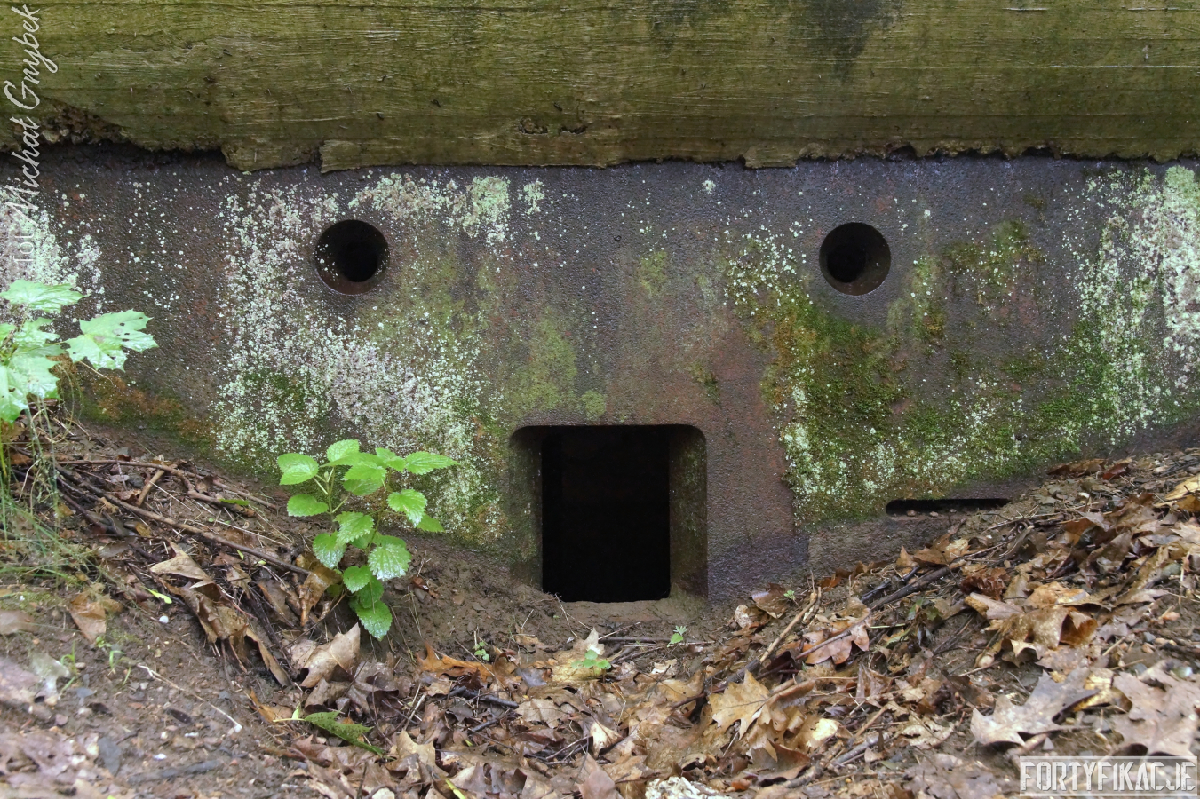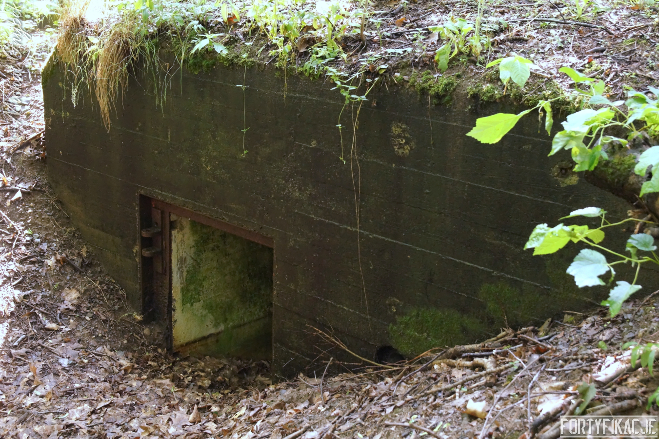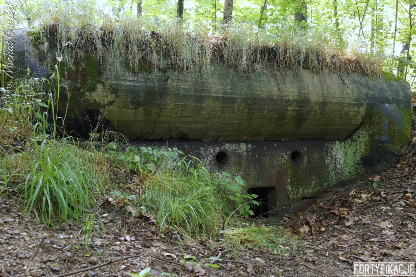 Ukazywany przeze mnie jednosektorowy schron ognia bocznego został prawdopodobnie wzniesiony w roku 1933. Już zewnętrzne oględziny ujawniły pewne podobieństwo do obiektów realizowanych w ramach instrukcji "Stellungsbau" z sierpnia 1930 roku. Poniższe zdjęcia uwidaczniają też niewielkie rozmiary stanowiska oraz nietypowy kształt elewacji bojowej. Płyta stalowa zatopiona została w żelbecie, który otacza ją i tworzy charakterystyczną ramę. Betonowy okap o obłym kształcie przypomina fragment zwalonego drzewa. Cała konstrukcja przysypana została solidnie ziemią, spod której - oprócz elewacji bojowej - wyeksponowana była od strony zapola jedynie ściana boczna, w której umieszczono wejście. Zamykane ono było stalowymi drzwiami z wyłazem lub bez. W pobliżu (Unter)standu jeszcze dziś odnaleźć można kilka betonowych osłonek dla posadzonych tu przez Niemców dla kamuflażu drzew.