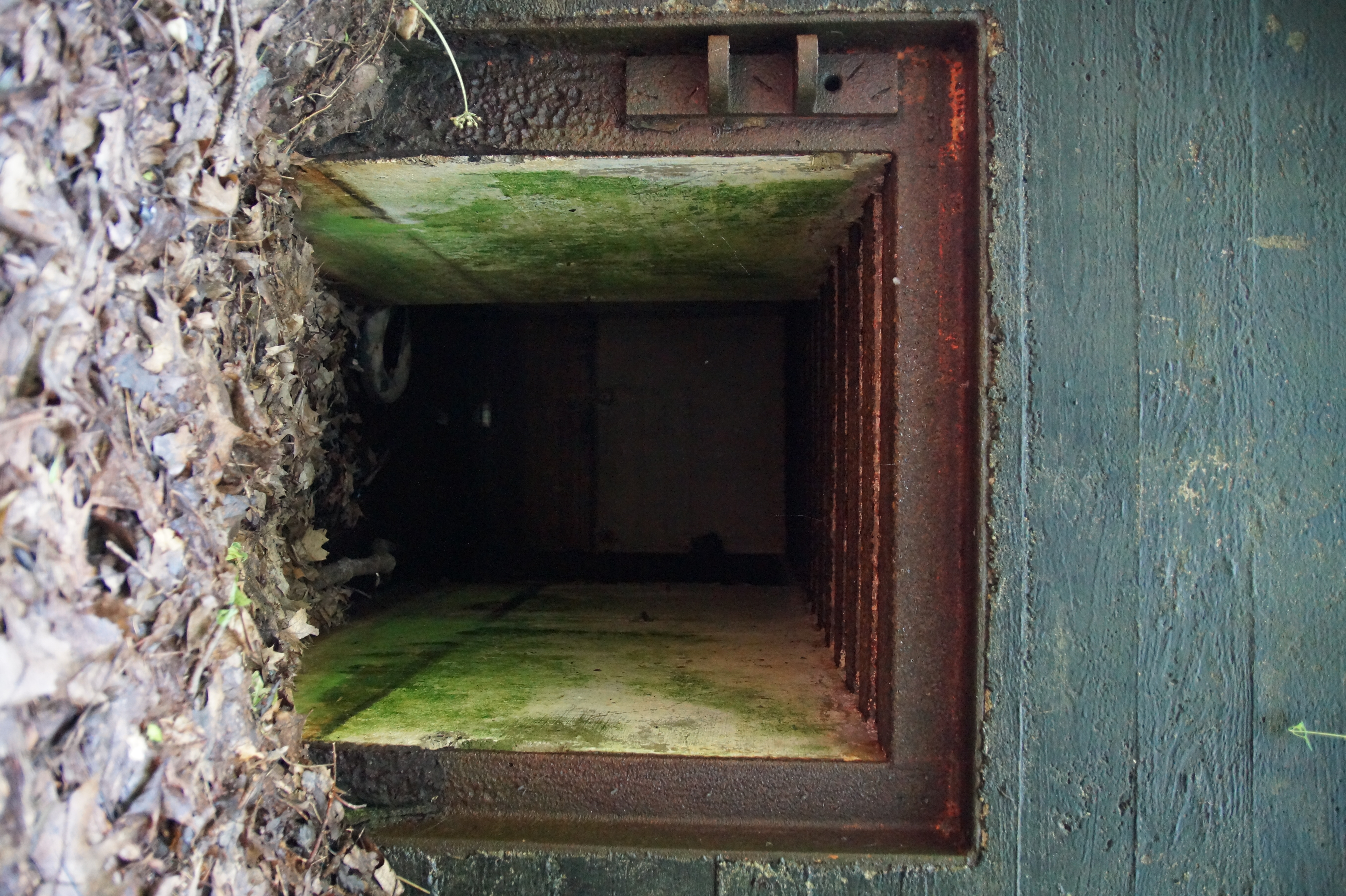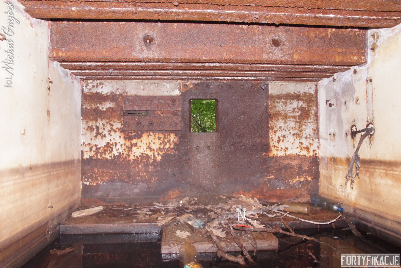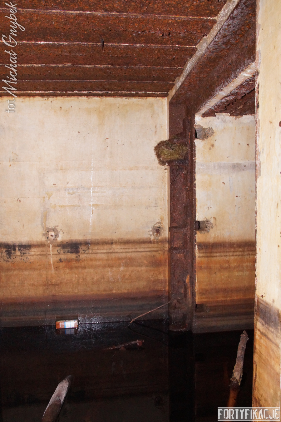 Wejście do środka schronu jest obecnie bardzo utrudnione: wnętrze zalane jest sporą ilością wody i błota. Udało mi się jedynie dotrzeć na próg izby bojowej. Także układ dwóch pomieszczeń, z których składał się obiekt, odpowiada instrukcji "Stellungsbau" z 1930 roku. Otwór wejściowy prowadził do niewielkiego przedsionka spełniającego również rolę śluzy gazoszczelnej. Z niego załoga mogła przedostać się, pokonując najpierw drzwi dwudzielne, a następnie gazoszczelne, do pomieszczenia bojowego. Izba ta wydaje się standardową o rozmiarach ok. 250x200x190 [dł. x szer. x wys. cm]. Pełniła ona rolę bojową oraz - w bardzo ograniczonym stopniu - socjalną. Główne uzbrojenie - MG 08 - umieszczony był na stoliku, ten zaś na żelbetowej ławie w kształcie litery "T". Płyta stalowa stanowiła praktycznie całą ścianę czołową. W rzeczonym schronie przytwierdzona była do charakterystycznego obniżenia w stropie. Taki zabieg wymuszały wymiary płyty. Oprócz uzbrojenia załoga miała tu do dyspozycji telefon - na zdjęciach widoczne są kotwy, na których był on zawieszony oraz kreślenia ołówkiem, które miały pomóc w jego montażu. Obieg powietrza zapewniały przewody napowietrzające i odprowadzające powietrze. Na ścianach schronu dostrzec można napisy eksploatacyjne, niestety ząb czasu odcisnął na nich swój ślad...