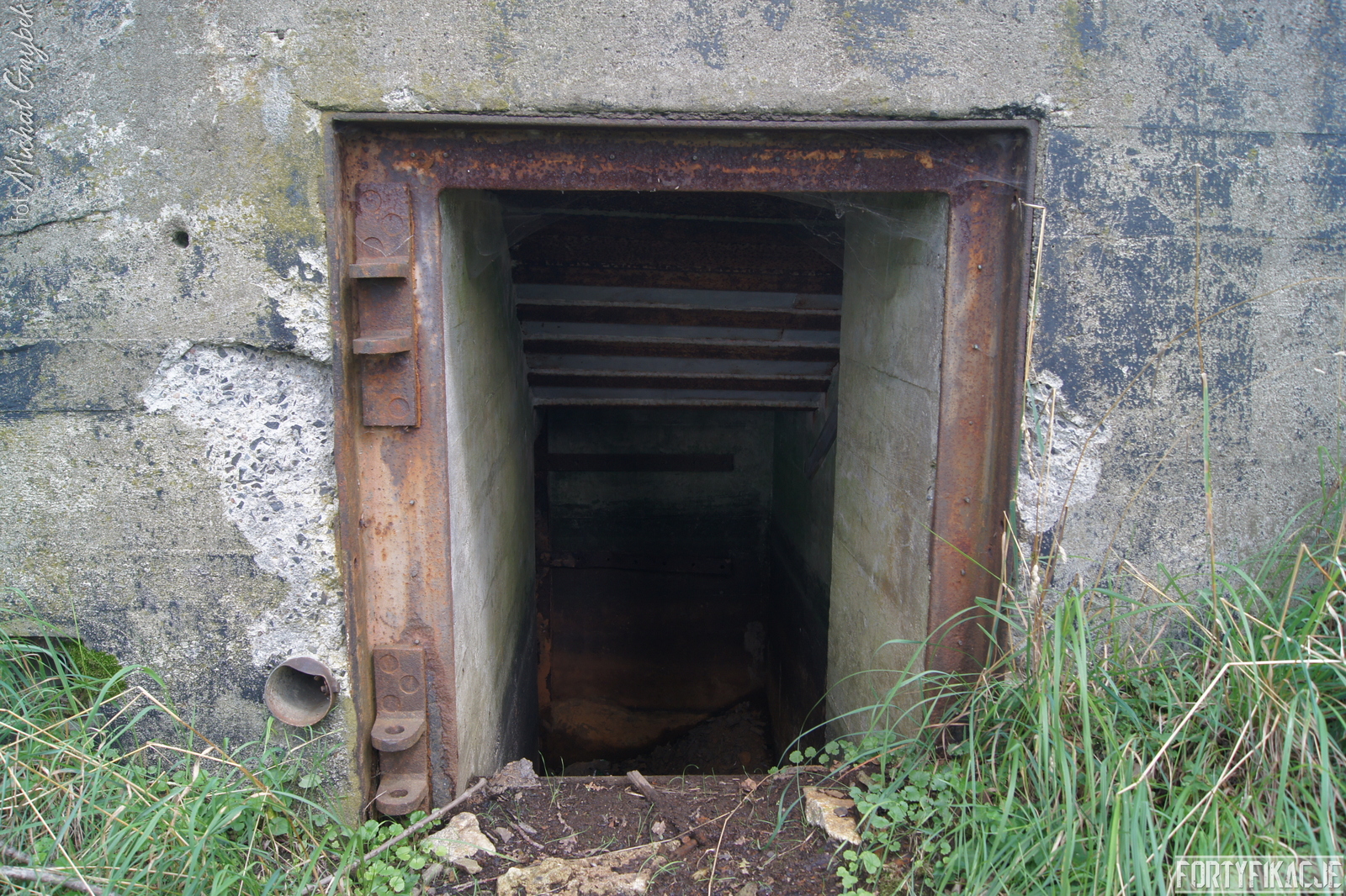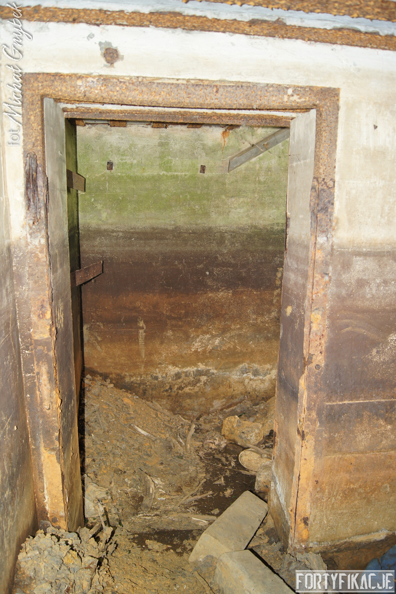 Schron - na swoje szczęście (!) - regularnie jest zalewany. Z tego powodu jego częściowo uchowane wyposażenie niestety ulega coraz większej korozji. Skutki utleniania widać na powierzchni wszystkich stalowych elementów. Z drugiej strony stojąca woda zdaje się być swoistym strażnikiem zachowanego pancerza utrudniając jego ewentualną grabież... Wnętrze obiektu kryło dwa pomieszczenia. Pierwsze z nich to przedsionek/śluza gazoszczelna. Drugie to niewielka izba bojowa o ograniczonych do absolutnego minimum funkcjach socjalnych. Załoga miała tu do dyspozycji pomieszczenie o mikrych wymiarach 200x252cm! W rzeczonym schronie na uwagę zasługuje kompletna płyta stalowa 8cm: zachowały się tu prowadnice, zasuwy oraz dźwignia ryglująca. Niestety schron jest obecnie pozostawiony sam sobie. Może lokalne władze/LP powinny rozważyć jego zamknięcie?