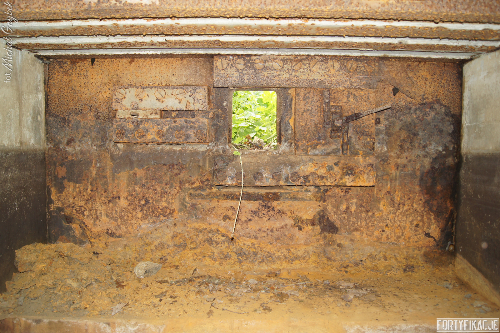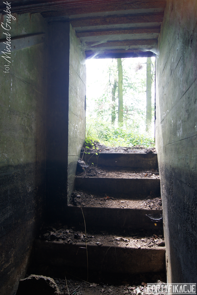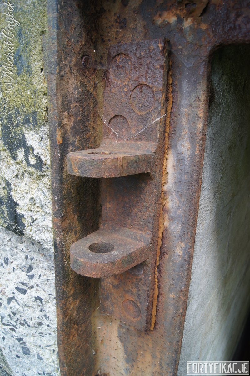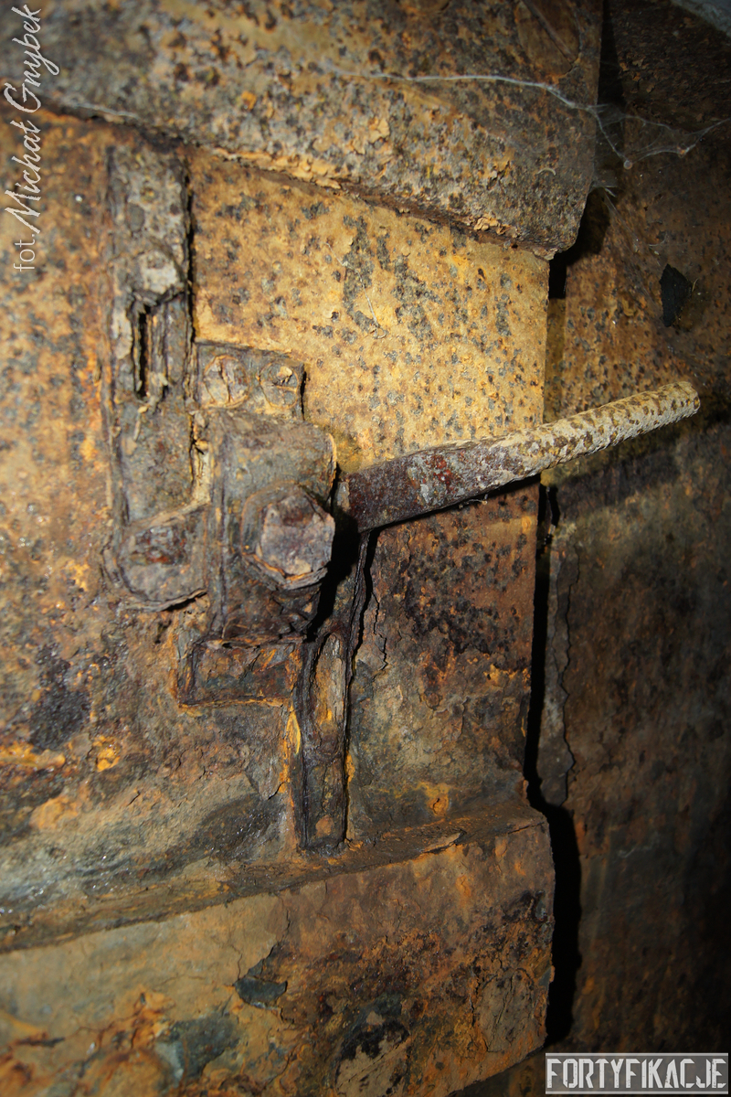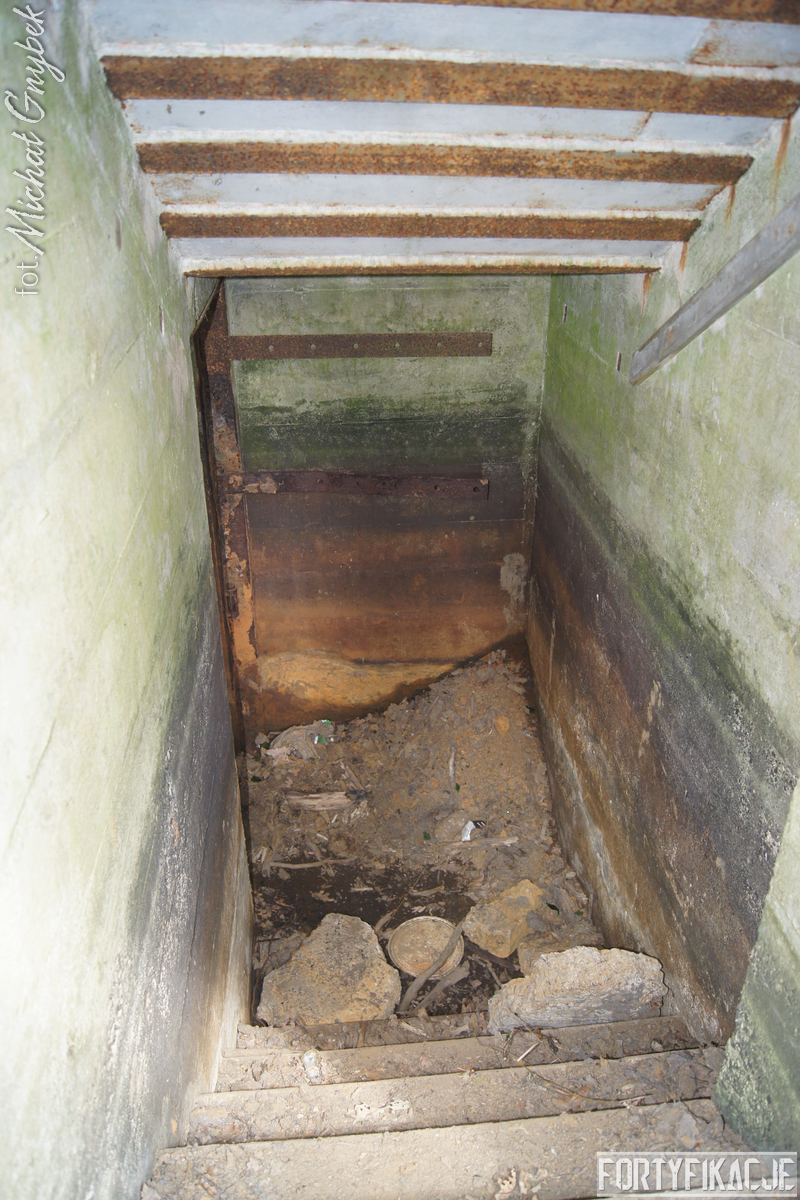 Schron - na swoje szczęście (!) - regularnie jest zalewany. Z tego powodu jego częściowo uchowane wyposażenie niestety ulega coraz większej korozji. Skutki utleniania widać na powierzchni wszystkich stalowych elementów. Z drugiej strony stojąca woda zdaje się być swoistym strażnikiem zachowanego pancerza utrudniając jego ewentualną grabież... Wnętrze obiektu kryło dwa pomieszczenia. Pierwsze z nich to przedsionek/śluza gazoszczelna. Drugie to niewielka izba bojowa o ograniczonych do absolutnego minimum funkcjach socjalnych. Załoga miała tu do dyspozycji pomieszczenie o mikrych wymiarach 200x252cm! W rzeczonym schronie na uwagę zasługuje kompletna płyta stalowa 8cm: zachowały się tu prowadnice, zasuwy oraz dźwignia ryglująca. Niestety schron jest obecnie pozostawiony sam sobie. Może lokalne władze/LP powinny rozważyć jego zamknięcie?