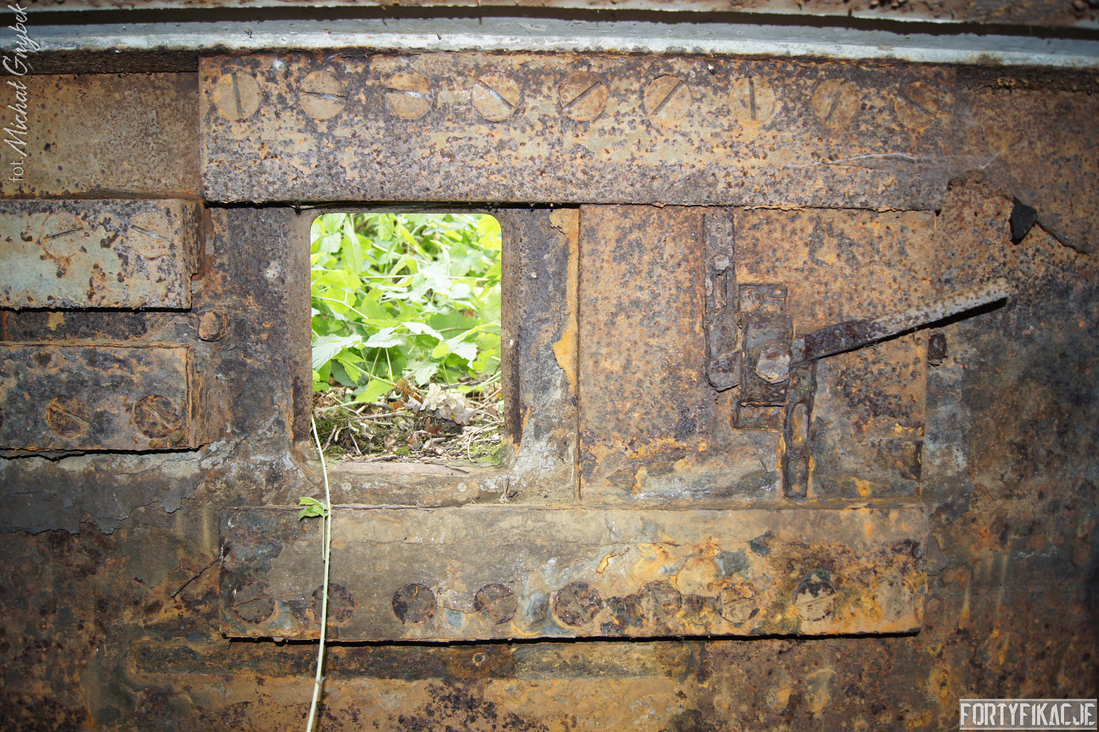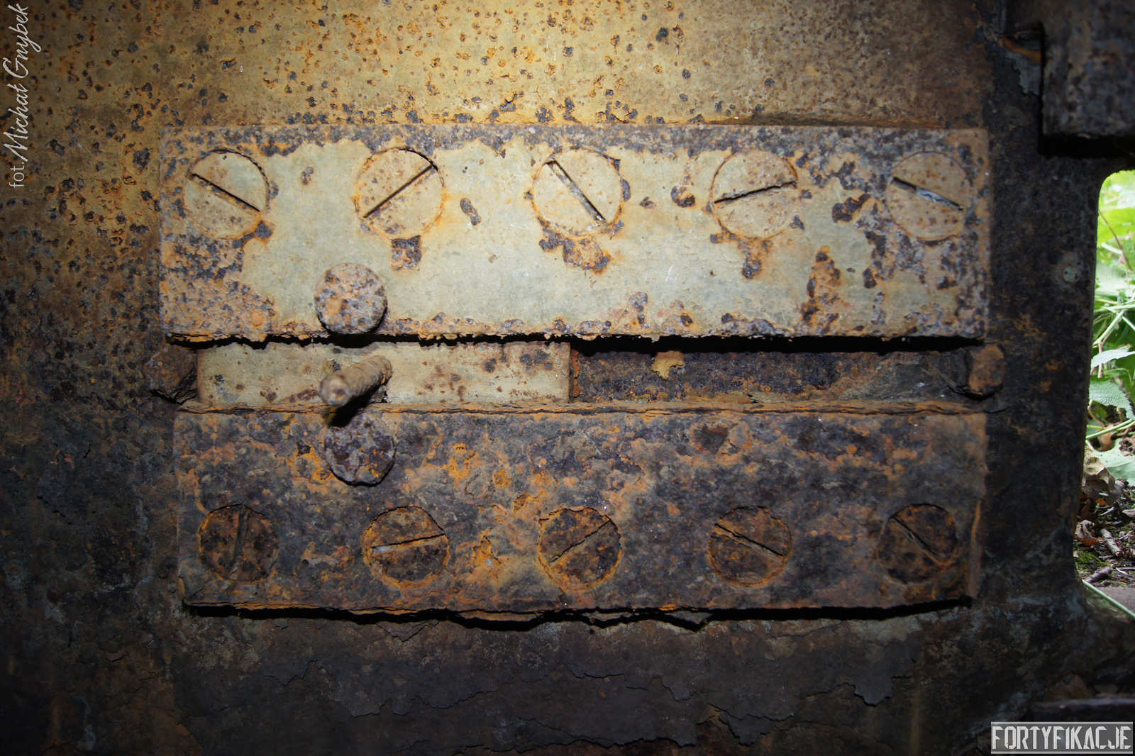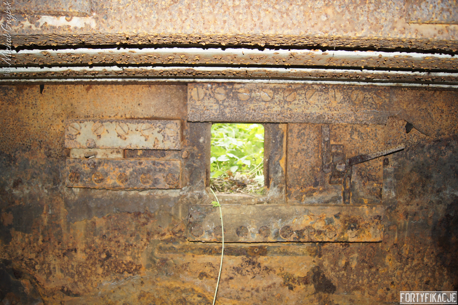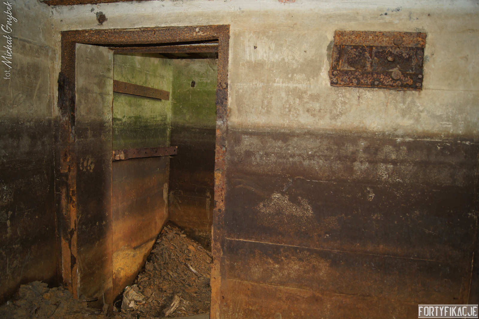 Schron - na swoje szczęście (!) - regularnie jest zalewany. Z tego powodu jego częściowo uchowane wyposażenie niestety ulega coraz większej korozji. Skutki utleniania widać na powierzchni wszystkich stalowych elementów. Z drugiej strony stojąca woda zdaje się być swoistym strażnikiem zachowanego pancerza utrudniając jego ewentualną grabież... Wnętrze obiektu kryło dwa pomieszczenia. Pierwsze z nich to przedsionek/śluza gazoszczelna. Drugie to niewielka izba bojowa o ograniczonych do absolutnego minimum funkcjach socjalnych. Załoga miała tu do dyspozycji pomieszczenie o mikrych wymiarach 200x252cm! W rzeczonym schronie na uwagę zasługuje kompletna płyta stalowa 8cm: zachowały się tu prowadnice, zasuwy oraz dźwignia ryglująca. Niestety schron jest obecnie pozostawiony sam sobie. Może lokalne władze/LP powinny rozważyć jego zamknięcie?