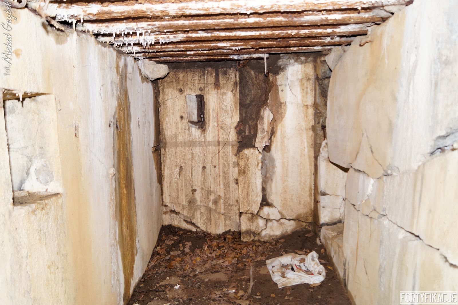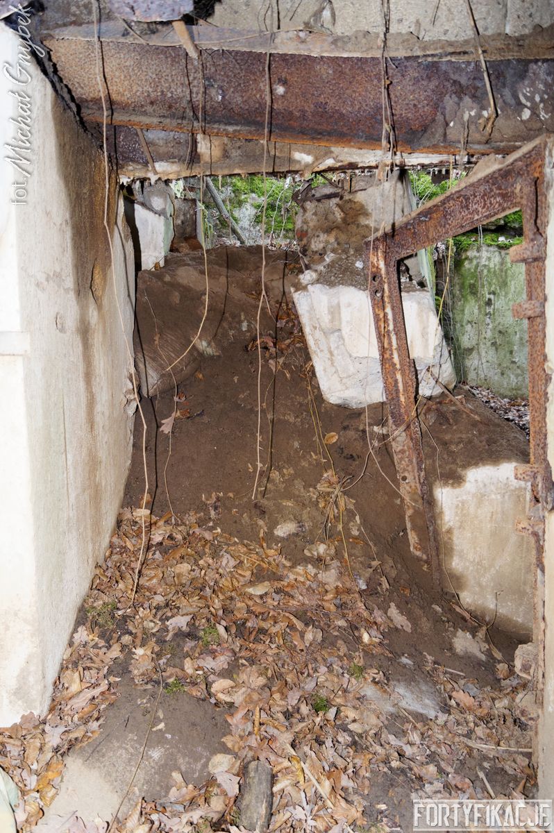 Wejdźmy do środka! Mimo niewielkich rozmiarów schronu trzeba zachować tu szczególną ostrożność! Obiekt został wysadzony, sterczą więc tu gdzieniegdzie pręty zbrojeniowe, a przez wyrwy w stropie sypie się ziemia... Obiekt składał się z trzech pomieszczeń: bloku wejściowego, który w wyniku eksplozji ucierpiał najbardziej; izby załogi, która obecnie częściowo jest zasypana; izby bojowej, której stan jest najbardziej przyzwoity, włącznie z zachowaną płytą stalową 7P7. Niestety... Schron jest nieustannie dewastowany... Z jego wnętrza złomiarze m.in. wykradli obie tarcze 48P8...