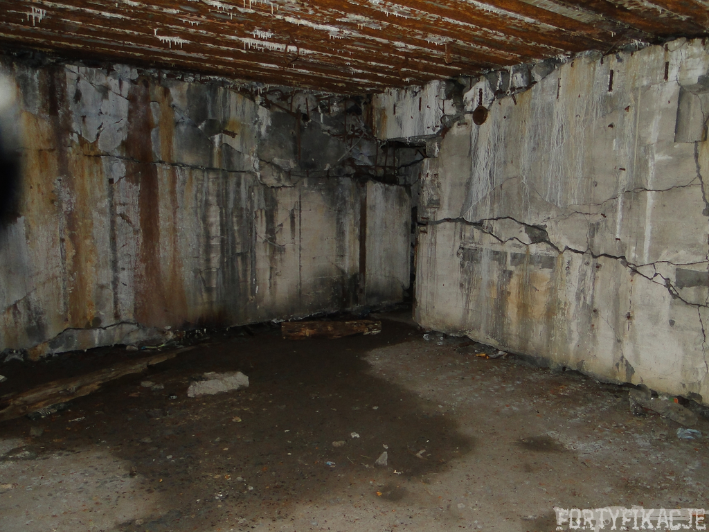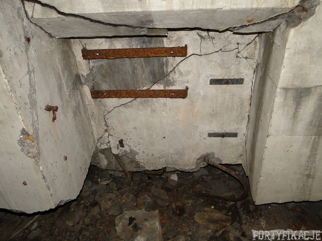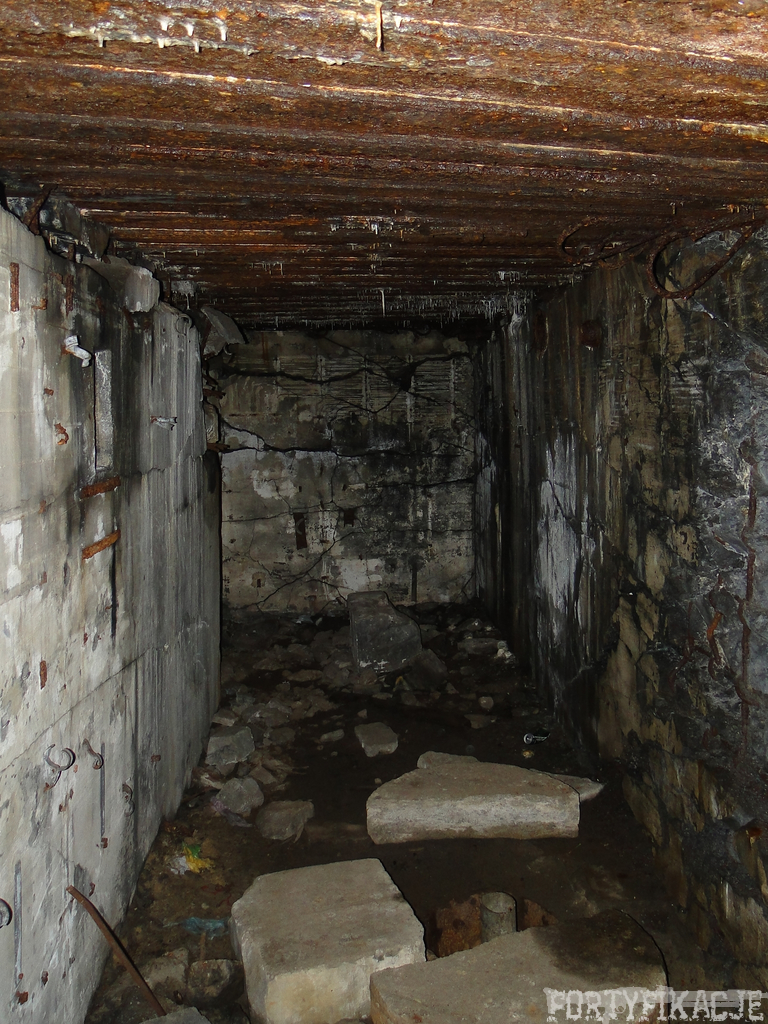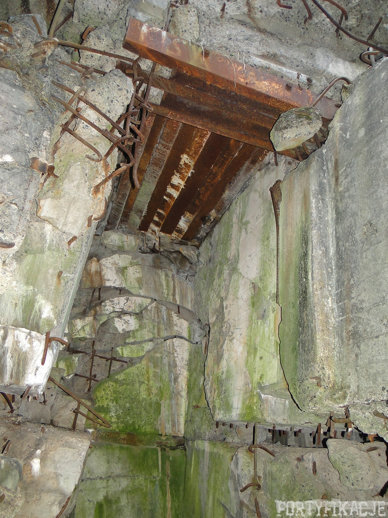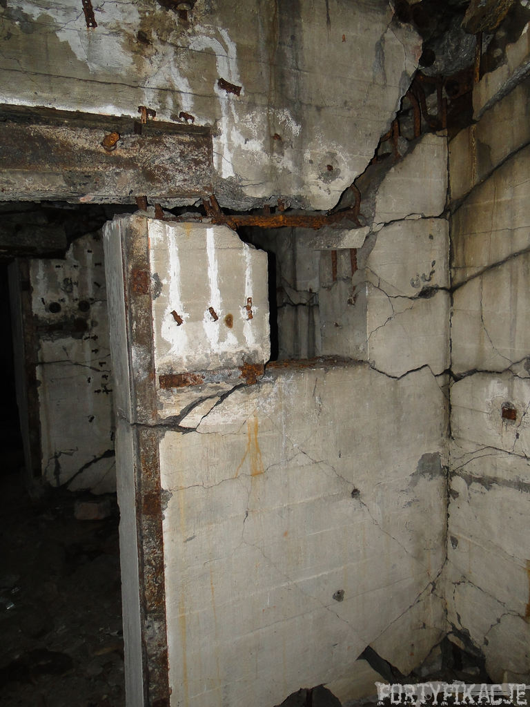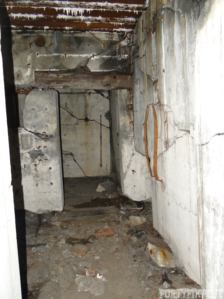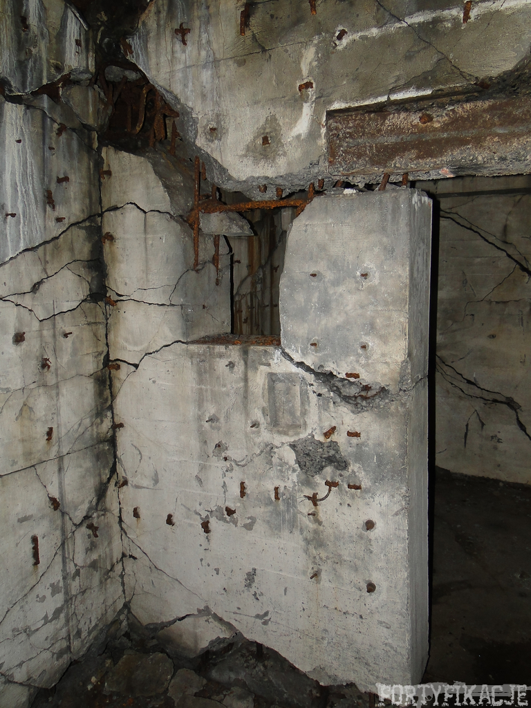 Czas zajrzeć do środka górnej kondygnacji (postarałem się zachować podział na górną i dolną kondygnację, choć wiem, że nie zawsze było to możliwe - zniszczenia poczynione przez saperów zrobiły swoje). Na górną kondygnację można było dostać się dwoma wejściami, które bronione były przez strzelnice osłonięte płytami stalowymi 10P7. Co ciekawe obie płyty osłaniały jedną izbę bojową, która ponadto pełniła rolę łącznika pomiędzy blokiem wejściowym a resztą pomieszczeń górnej kondygnacji. Praktycznie żadna z izb tejże nie przetrwała w całości. Potężne eksplozje uczyniły zeń poskręcany, miejscami mocno nieczytelny przekrój pionowy. To na tej kondygnacji znajdziemy jeden z słynnych symboli FF O-W-B: odciśniętą w żelbecie datę wzniesienia obiektu: "1935/36". Natkniemy się też na częściowo zachowane pancerze: pocięte palnikami płyty stalowe 10P7.