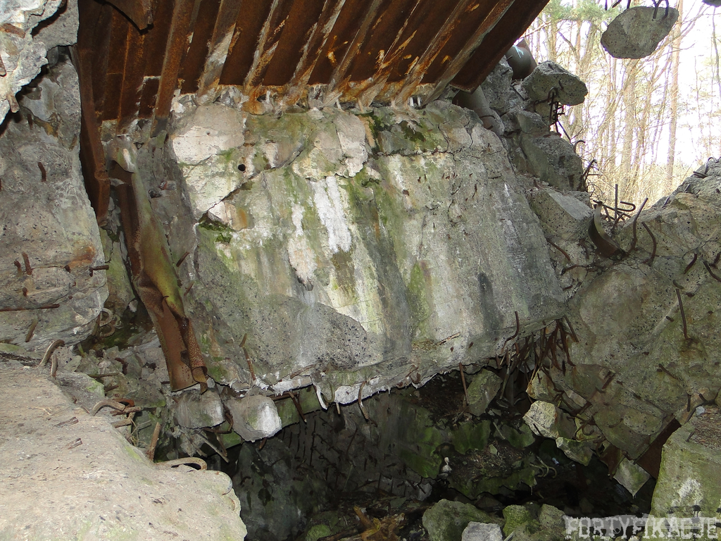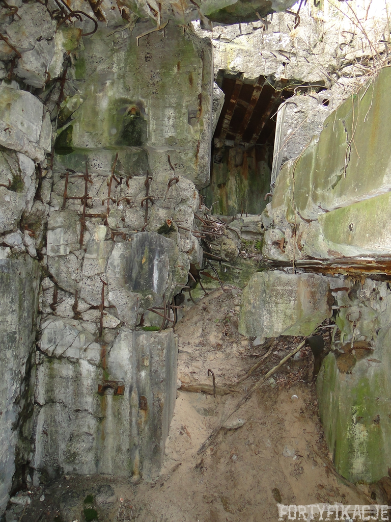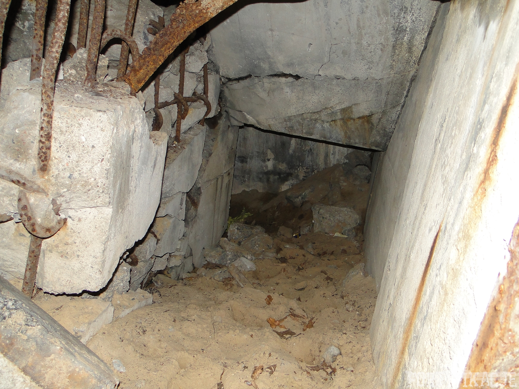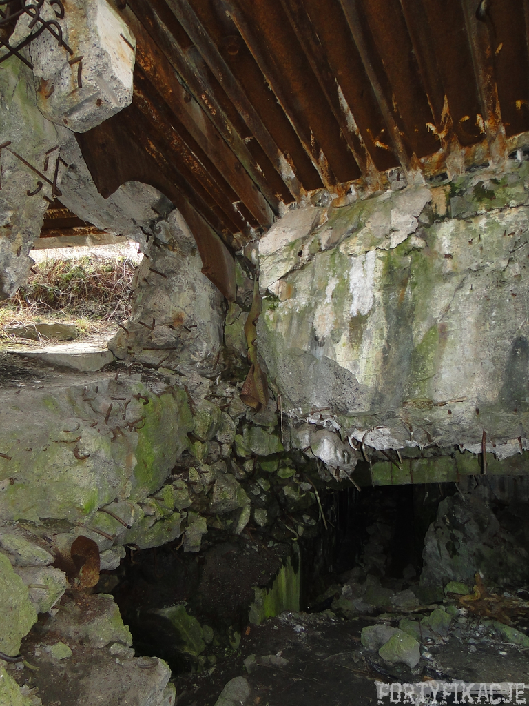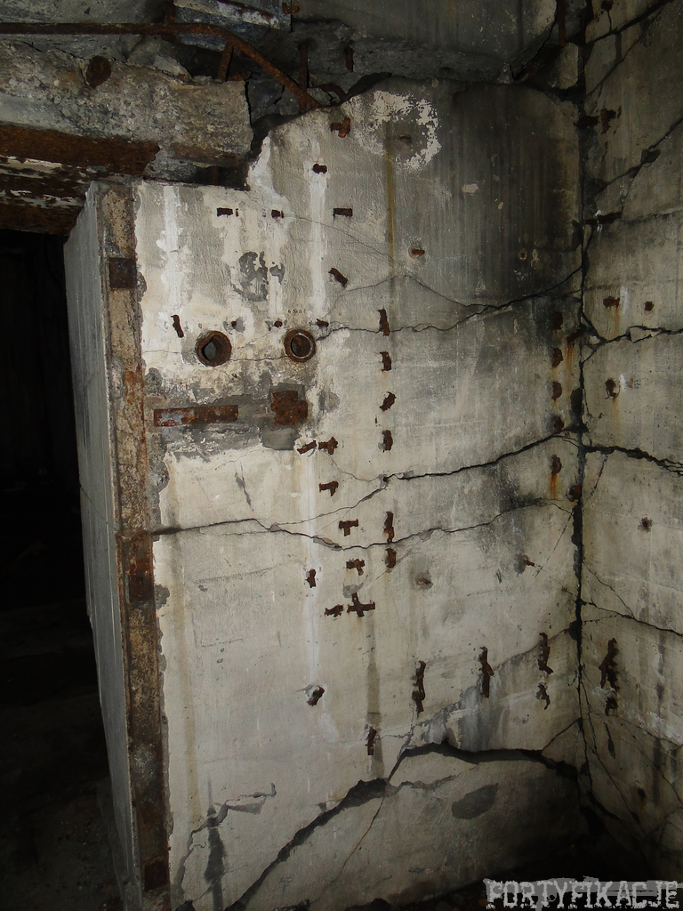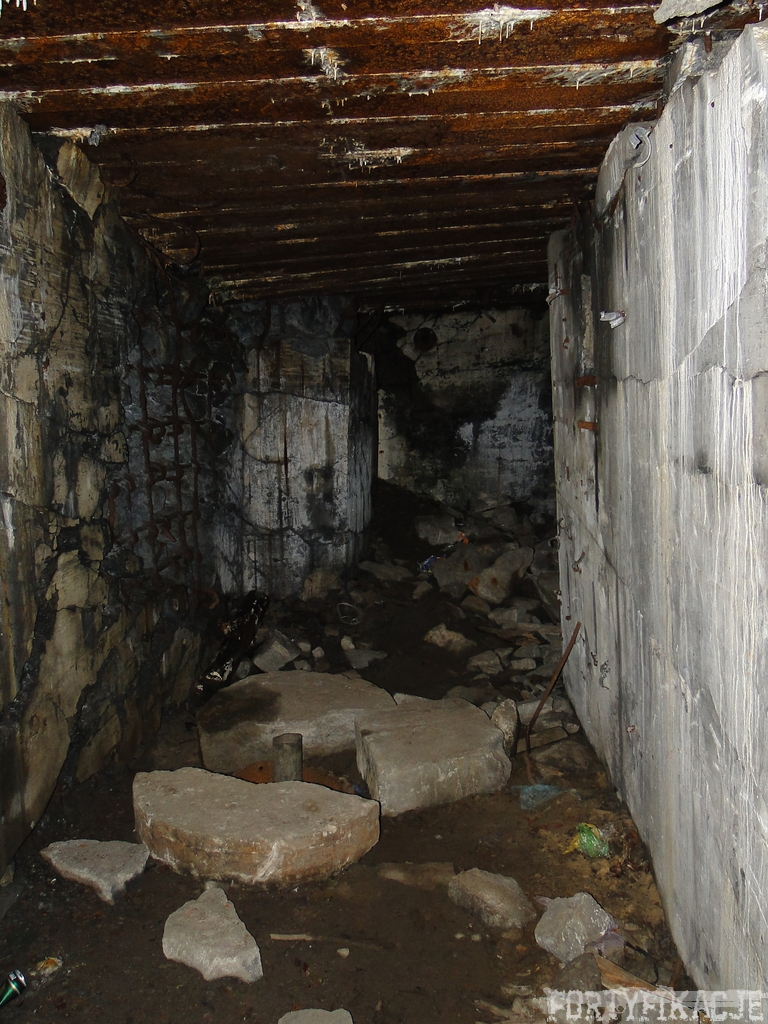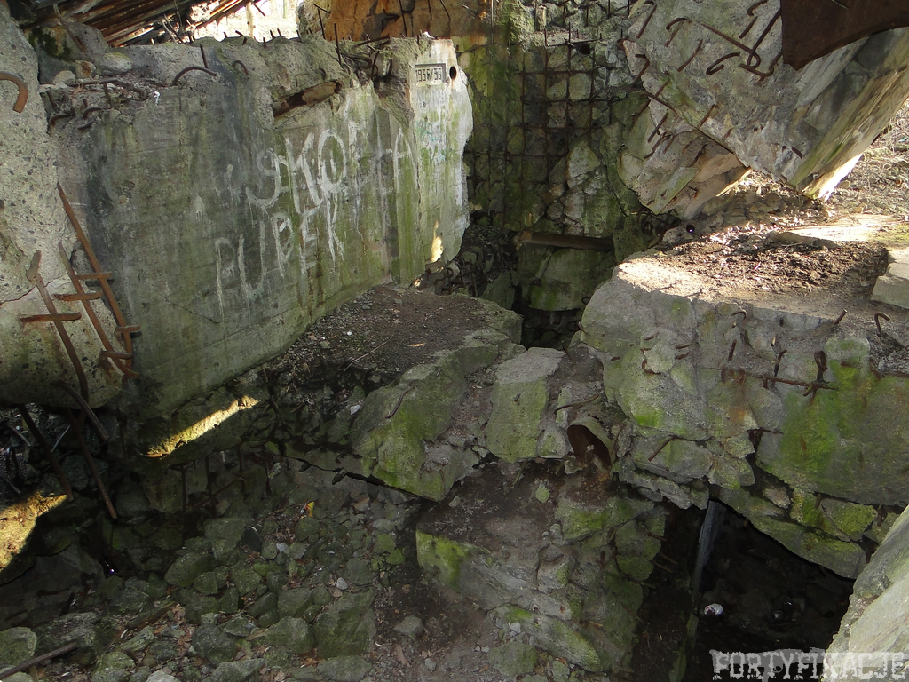 Czas zajrzeć do środka górnej kondygnacji (postarałem się zachować podział na górną i dolną kondygnację, choć wiem, że nie zawsze było to możliwe - zniszczenia poczynione przez saperów zrobiły swoje). Na górną kondygnację można było dostać się dwoma wejściami, które bronione były przez strzelnice osłonięte płytami stalowymi 10P7. Co ciekawe obie płyty osłaniały jedną izbę bojową, która ponadto pełniła rolę łącznika pomiędzy blokiem wejściowym a resztą pomieszczeń górnej kondygnacji. Praktycznie żadna z izb tejże nie przetrwała w całości. Potężne eksplozje uczyniły zeń poskręcany, miejscami mocno nieczytelny przekrój pionowy. To na tej kondygnacji znajdziemy jeden z słynnych symboli FF O-W-B: odciśniętą w żelbecie datę wzniesienia obiektu: "1935/36". Natkniemy się też na częściowo zachowane pancerze: pocięte palnikami płyty stalowe 10P7.