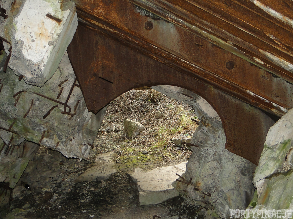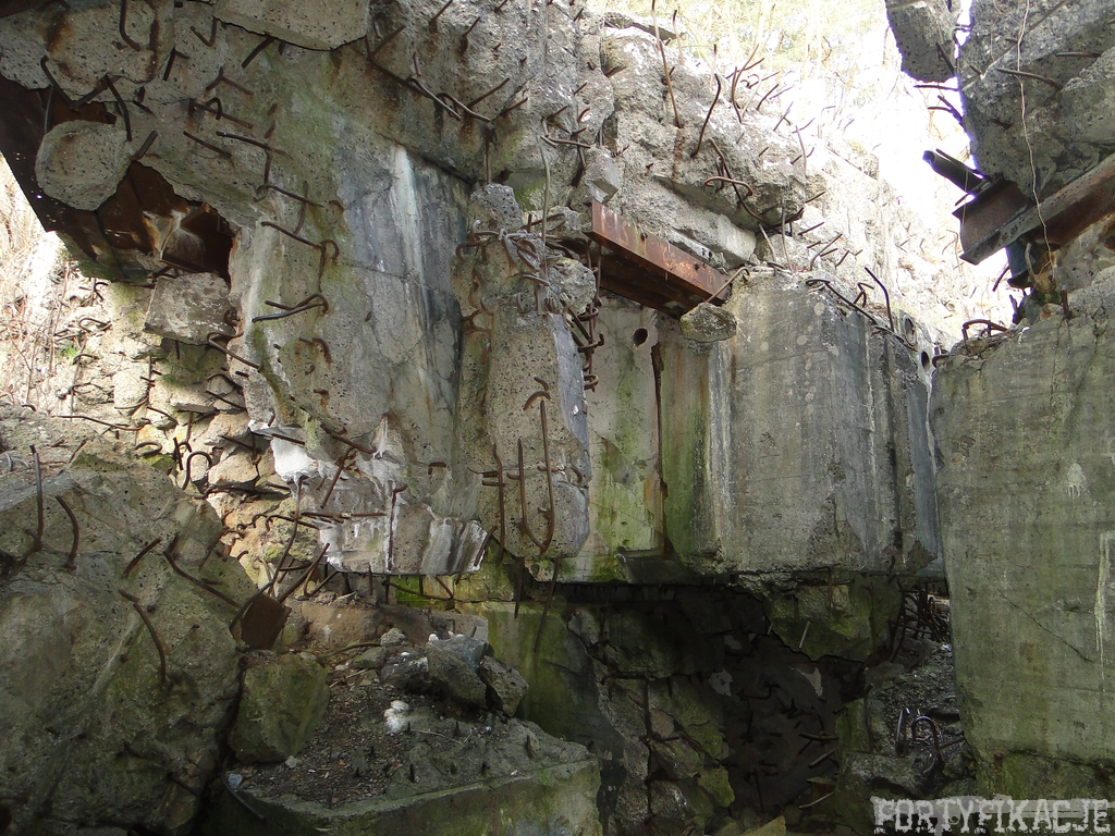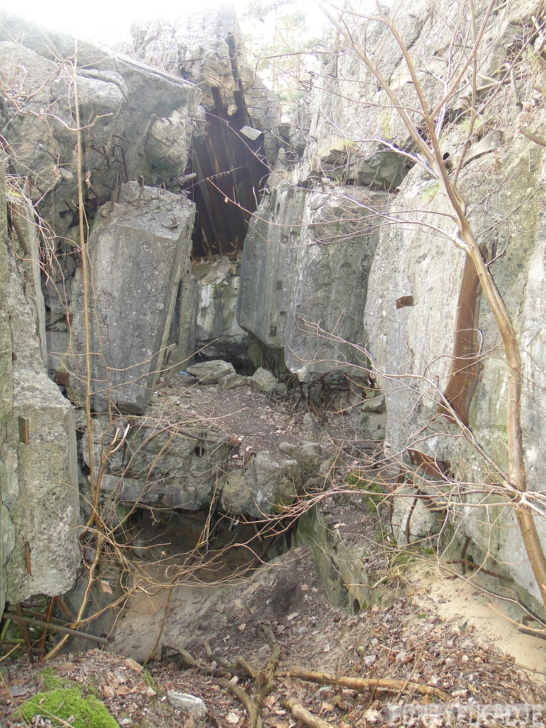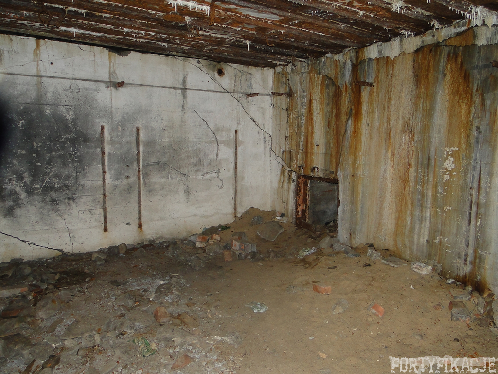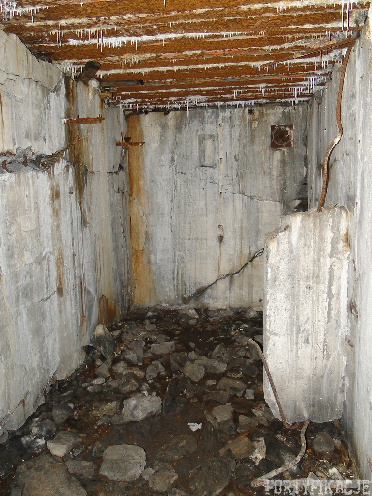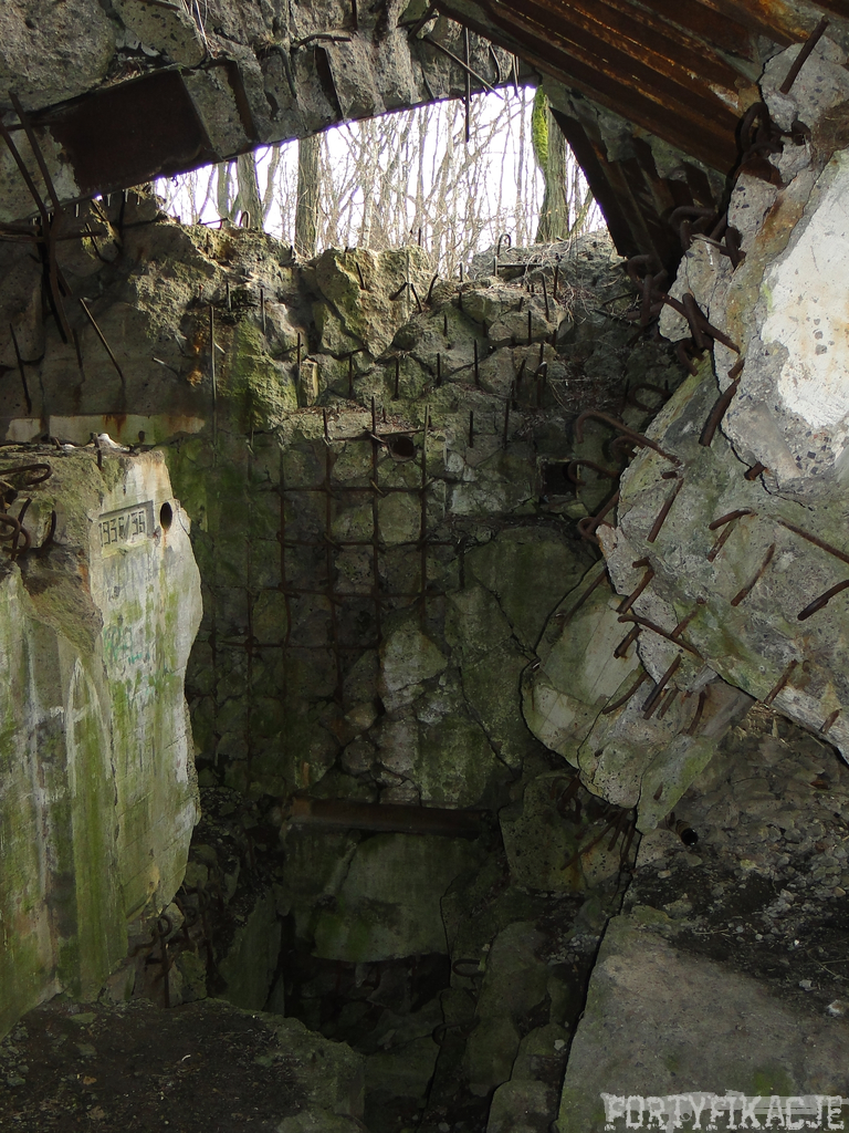 Czas zajrzeć do środka górnej kondygnacji (postarałem się zachować podział na górną i dolną kondygnację, choć wiem, że nie zawsze było to możliwe - zniszczenia poczynione przez saperów zrobiły swoje). Na górną kondygnację można było dostać się dwoma wejściami, które bronione były przez strzelnice osłonięte płytami stalowymi 10P7. Co ciekawe obie płyty osłaniały jedną izbę bojową, która ponadto pełniła rolę łącznika pomiędzy blokiem wejściowym a resztą pomieszczeń górnej kondygnacji. Praktycznie żadna z izb tejże nie przetrwała w całości. Potężne eksplozje uczyniły zeń poskręcany, miejscami mocno nieczytelny przekrój pionowy. To na tej kondygnacji znajdziemy jeden z słynnych symboli FF O-W-B: odciśniętą w żelbecie datę wzniesienia obiektu: "1935/36". Natkniemy się też na częściowo zachowane pancerze: pocięte palnikami płyty stalowe 10P7.