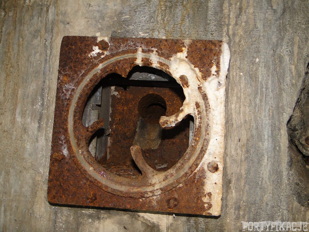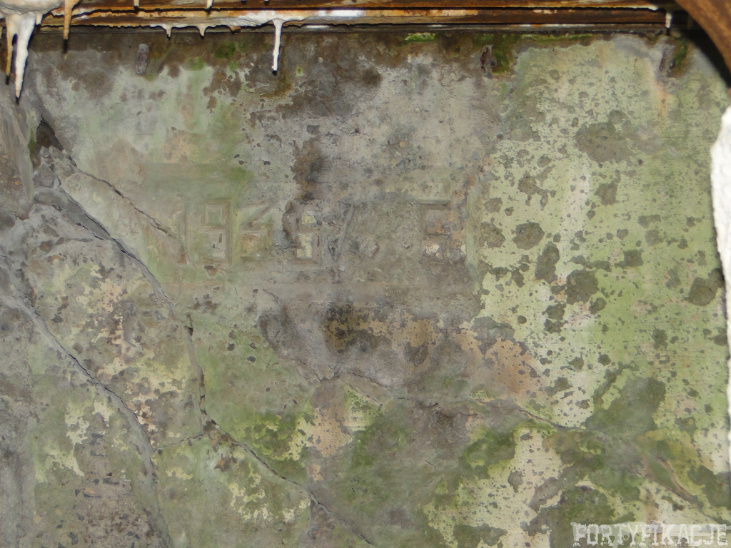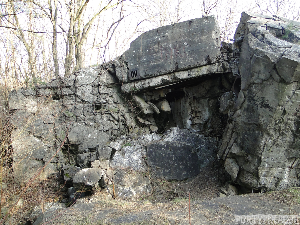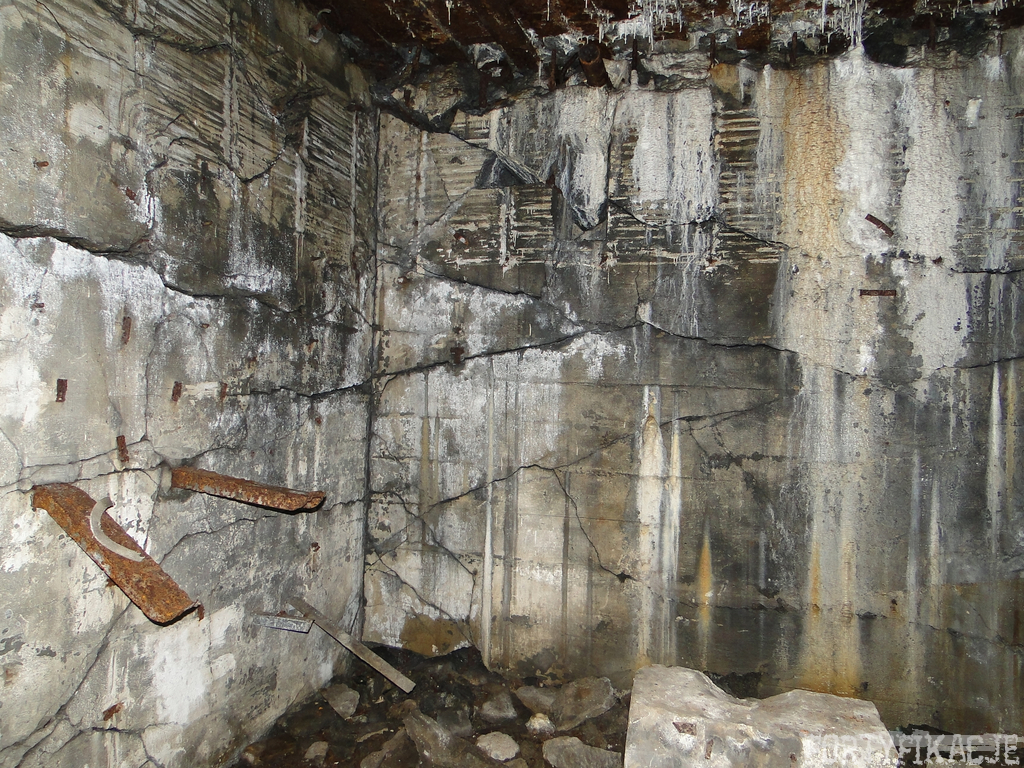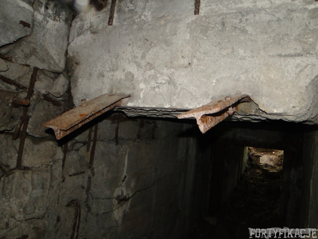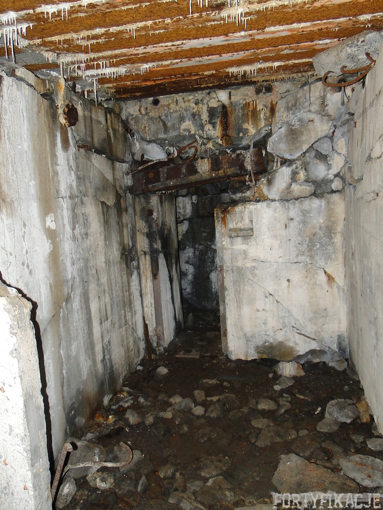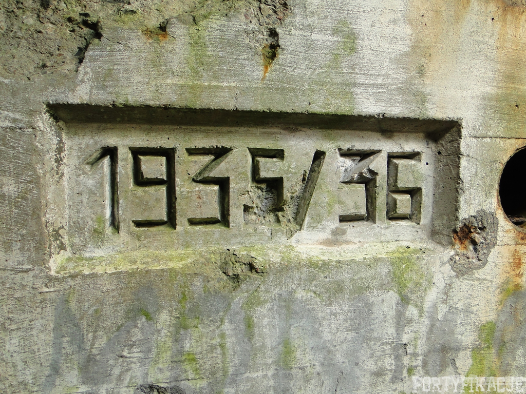 Czas zajrzeć do środka górnej kondygnacji (postarałem się zachować podział na górną i dolną kondygnację, choć wiem, że nie zawsze było to możliwe - zniszczenia poczynione przez saperów zrobiły swoje). Na górną kondygnację można było dostać się dwoma wejściami, które bronione były przez strzelnice osłonięte płytami stalowymi 10P7. Co ciekawe obie płyty osłaniały jedną izbę bojową, która ponadto pełniła rolę łącznika pomiędzy blokiem wejściowym a resztą pomieszczeń górnej kondygnacji. Praktycznie żadna z izb tejże nie przetrwała w całości. Potężne eksplozje uczyniły zeń poskręcany, miejscami mocno nieczytelny przekrój pionowy. To na tej kondygnacji znajdziemy jeden z słynnych symboli FF O-W-B: odciśniętą w żelbecie datę wzniesienia obiektu: "1935/36". Natkniemy się też na częściowo zachowane pancerze: pocięte palnikami płyty stalowe 10P7.