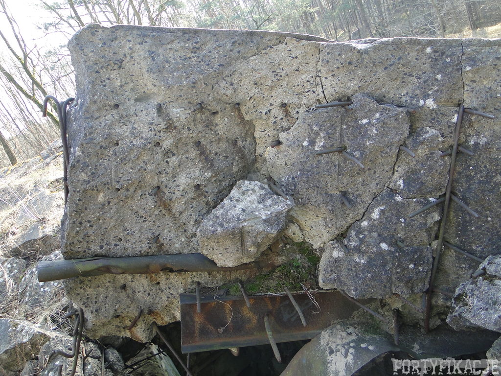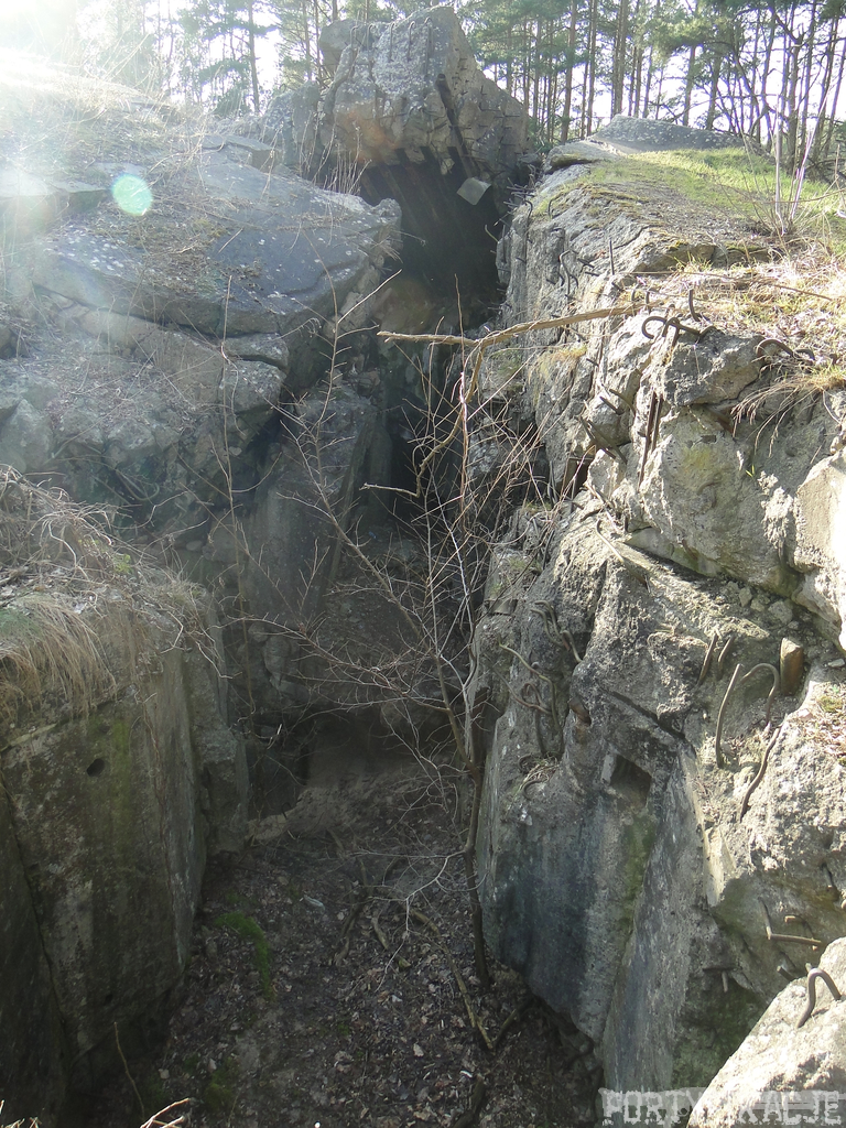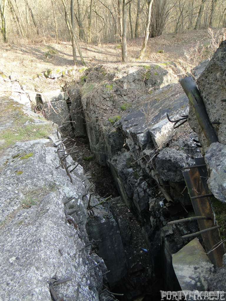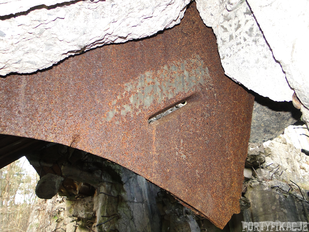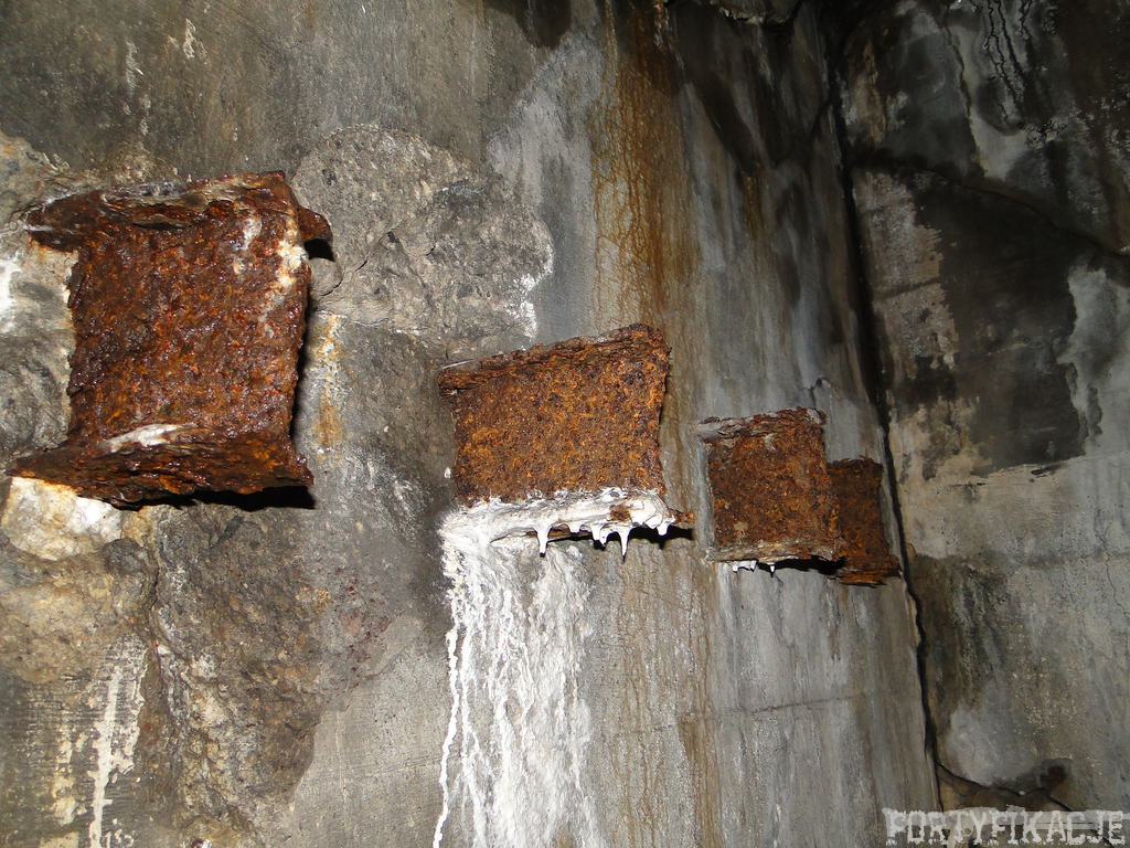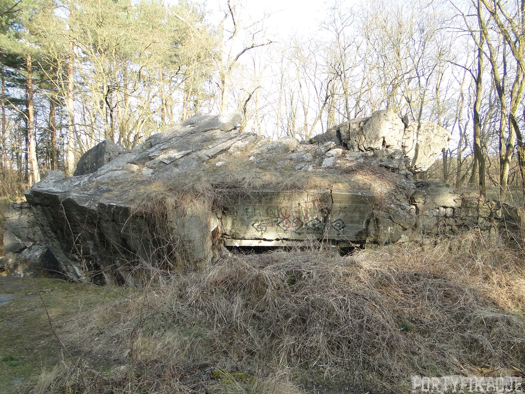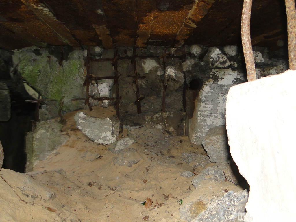 Czas zajrzeć do środka górnej kondygnacji (postarałem się zachować podział na górną i dolną kondygnację, choć wiem, że nie zawsze było to możliwe - zniszczenia poczynione przez saperów zrobiły swoje). Na górną kondygnację można było dostać się dwoma wejściami, które bronione były przez strzelnice osłonięte płytami stalowymi 10P7. Co ciekawe obie płyty osłaniały jedną izbę bojową, która ponadto pełniła rolę łącznika pomiędzy blokiem wejściowym a resztą pomieszczeń górnej kondygnacji. Praktycznie żadna z izb tejże nie przetrwała w całości. Potężne eksplozje uczyniły zeń poskręcany, miejscami mocno nieczytelny przekrój pionowy. To na tej kondygnacji znajdziemy jeden z słynnych symboli FF O-W-B: odciśniętą w żelbecie datę wzniesienia obiektu: "1935/36". Natkniemy się też na częściowo zachowane pancerze: pocięte palnikami płyty stalowe 10P7.