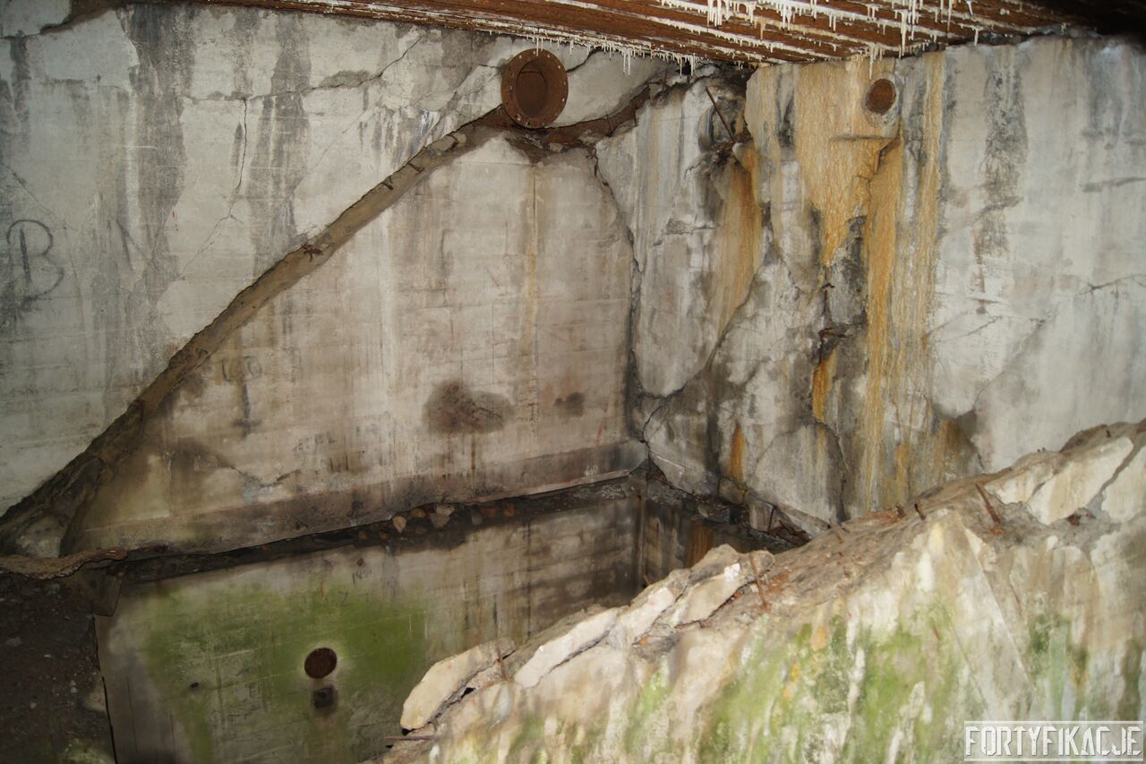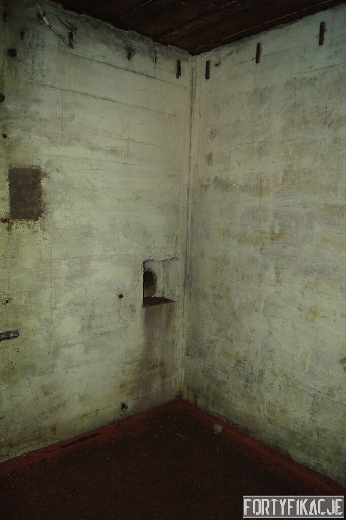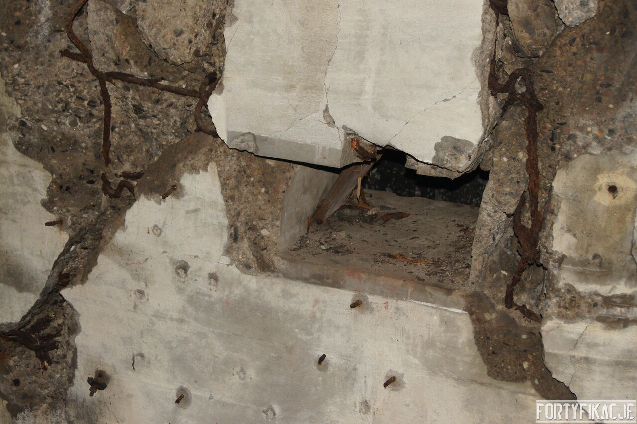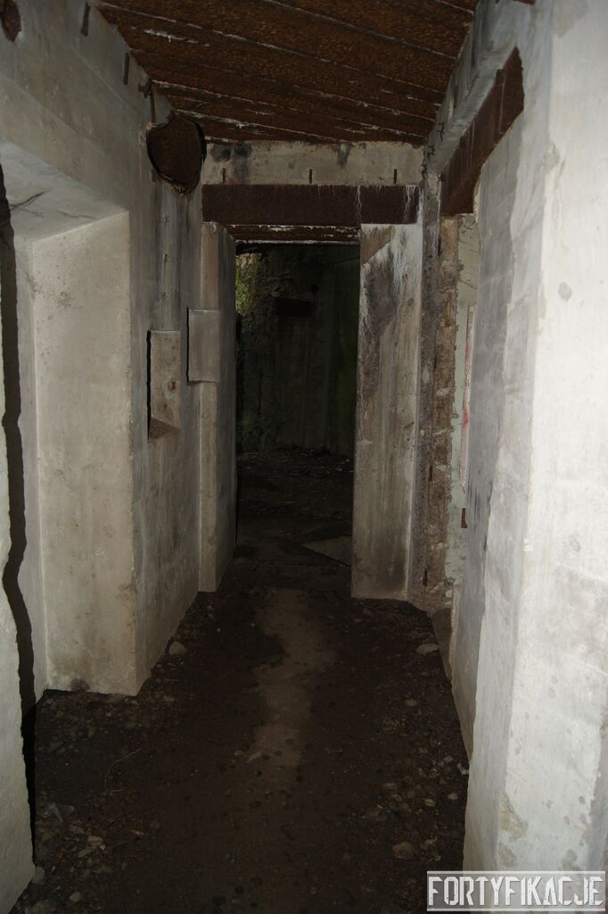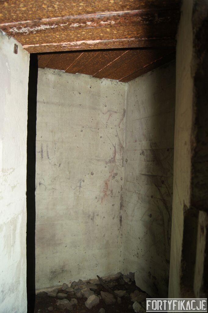 Wejdźmy na górną kondygnację. Tu poczynione zostały największe zniszczenia. Część pomieszczeń pozbawionych jest stropu, a ściany schronu poprzemieszczane. Największym zniszczeniom uległy izby bojowe, szyby kopuł, izba dowódcy oraz maszynownia. Kilka pomieszczeń górnej kondygnacji przetrwała jednak w jako takim stanie. Na wyróżnienie zasługuje m.in. izba łączności, blok wejściowy z dołami-pułapkami, nad którymi wisiały opuszczane drzwi 99P9 oraz kazamata z płytą pancerną 6P7. Był to pancerz o niebagatelnej grubości 20cm. W Pz. W. 712 została ona wycięta palnikami na tyle "delikatnie", że izba przetrwała, a w betonie widoczne są elementy mocowania płyty.