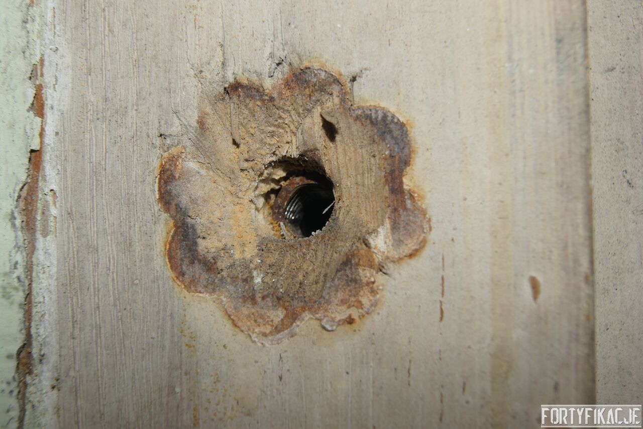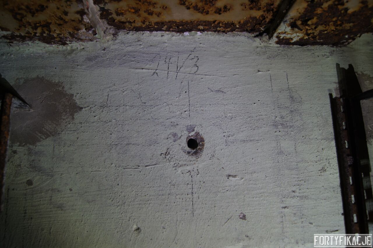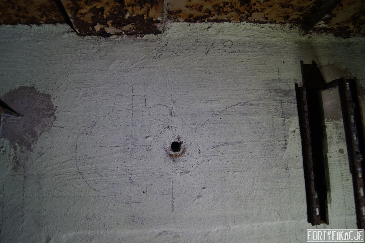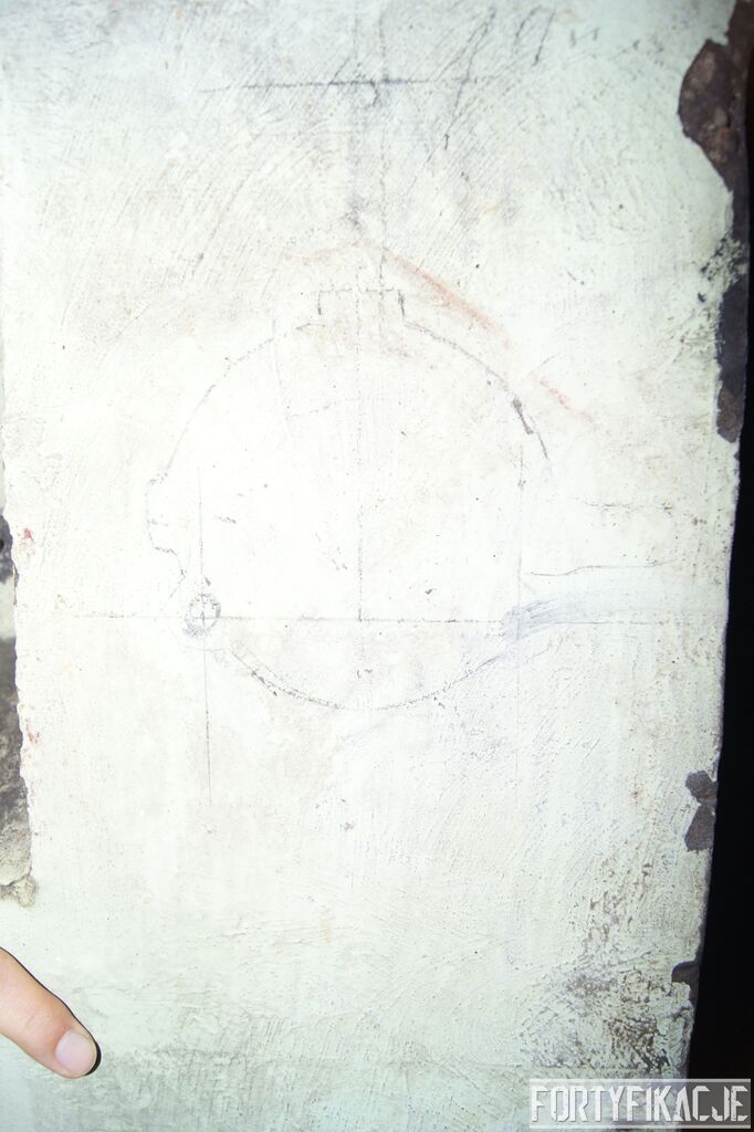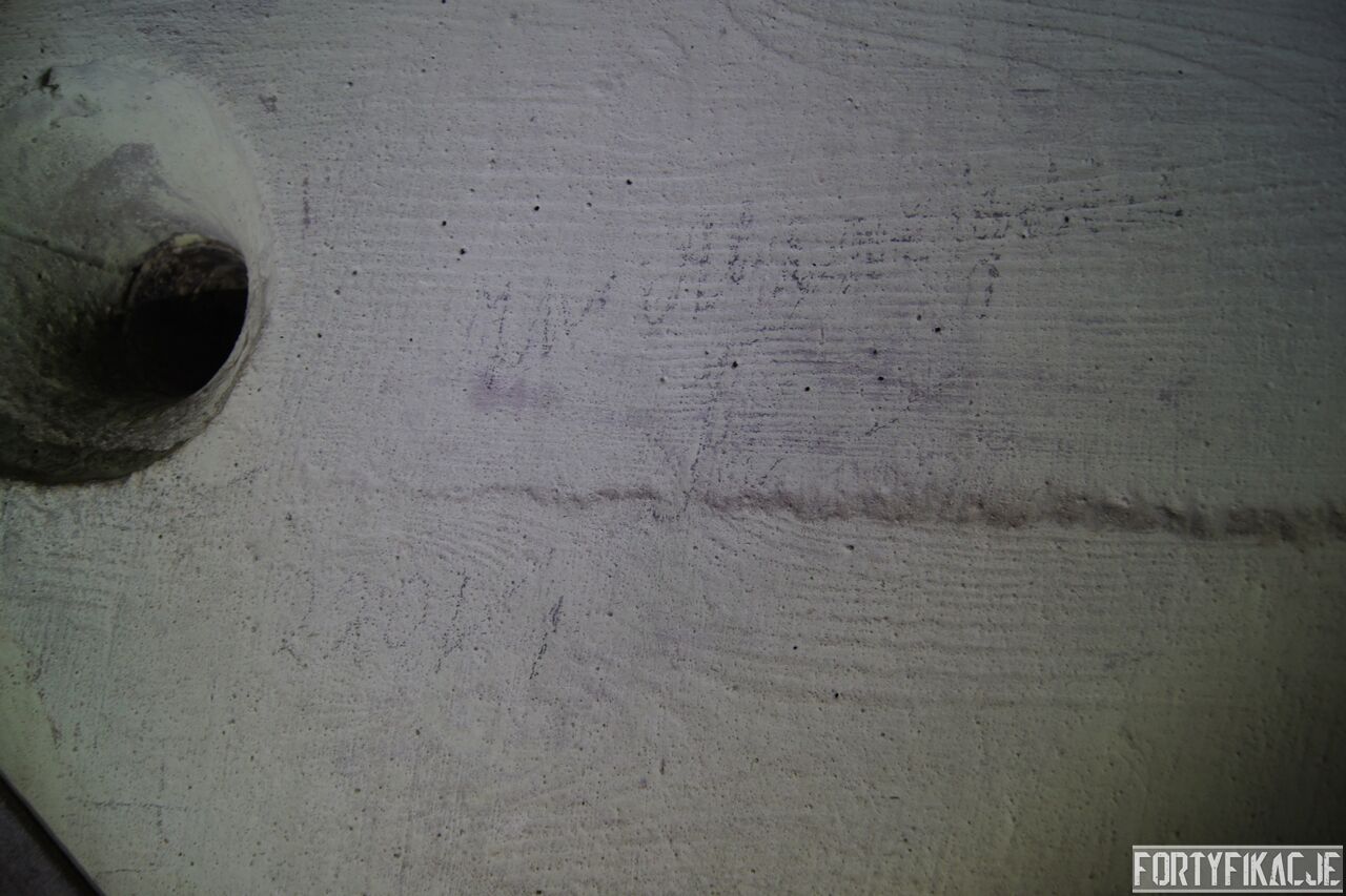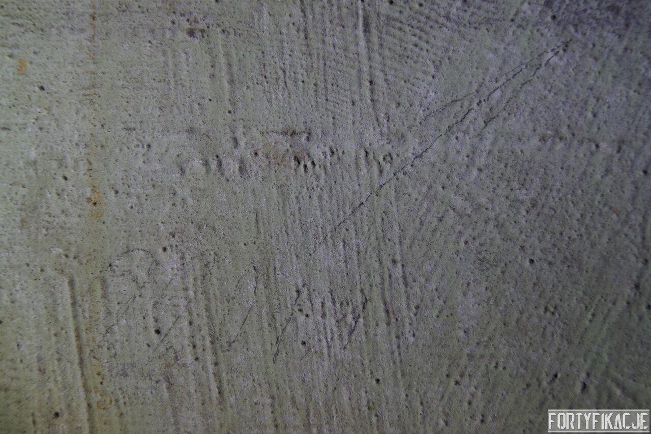 Żeby nie było standardowo i nie popaść w rutynę, wchodząc do środka zaczniemy wyjątkowo od dolnej kondygnacji i jednej z najcenniejszych - wg mnie - rzeczy. Pod pewnymi względami Pz. W. 712 wygląda na nieukończony. Wskazuje na to nie tylko późna data wzniesienia, kiedy to budowę FFOWB już wyciszano, ale również sam wygląd ścian, szczególnie dolnej kondygnacji. Zachowały się na nich, czynione ołówkiem, uwagi i schematy technika, który prawdopodobnie miał montować instalację elektryczną i/lub telefoniczną. Na ścianach widzimy narysowane linie, informacje dotyczące napięcia, adnotacje lub bardziej rozbudowane komentarze. Ponadto zaznaczone są miejsca wierceń. Jest to niebywała gratka dla każdego miłośnika MRU! Niniejsze ryciny znajdują się na dolnej kondygnacji w większości pomieszczeń.