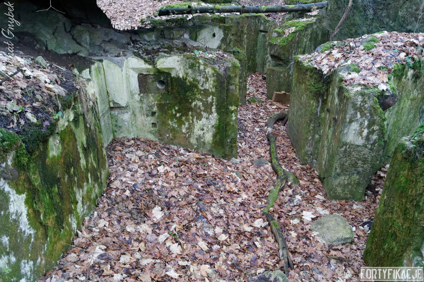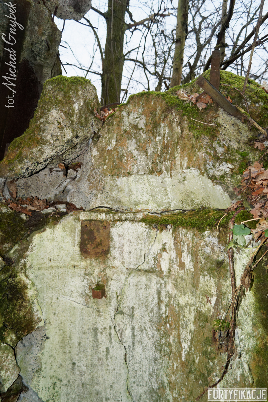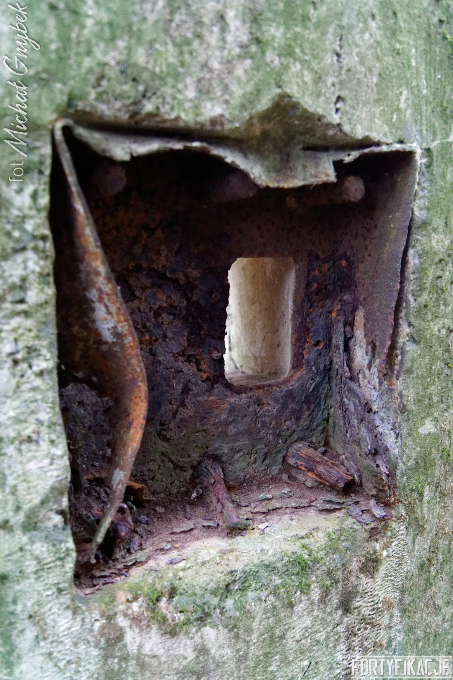 Praktycznie został całkowicie pozbawiony stropu, który rozerwany wybuchem łoży się w bliskiej okolicy obiektu. Więcej szczęścia miały ściany pionowe: wytrzymały napór energii ładunków wybuchowych, dzięki czemu obecnie schron stanowi intrygujący przekrój poziomy. Jest to tym bardziej cenne, że układ aż 5 pomieszczeń, z których się składał, był dość nietypowy, a z pewnością asymetryczny. Przede wszystkim obiekt spełniał kilka ról: posiadał dwie izby bojowe, w obu załoga chroniona była przez płyty stalowe 7P7 (ich pozostałości zachowały się); pomieszczenie obserwatora, zabezpieczone małą kopułą typu 9P7 (nie zachowała się) oraz - dla mnie najciekawszą, bo o fantazyjnym narysie - izbę załogi.