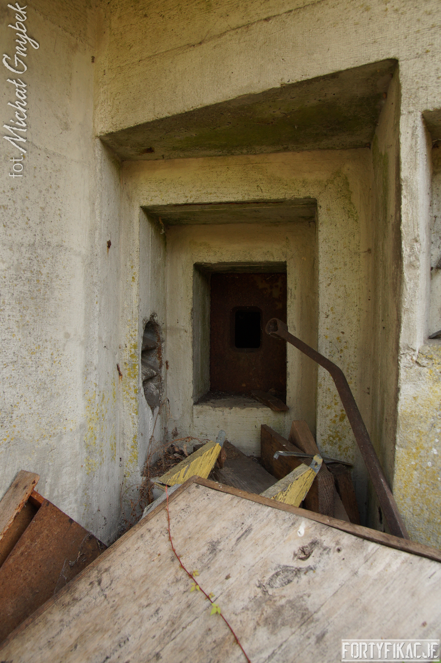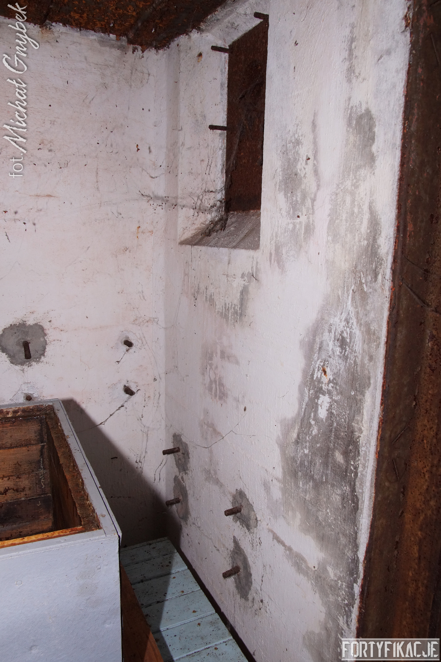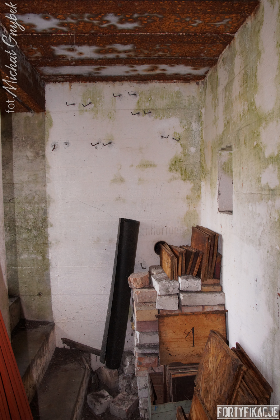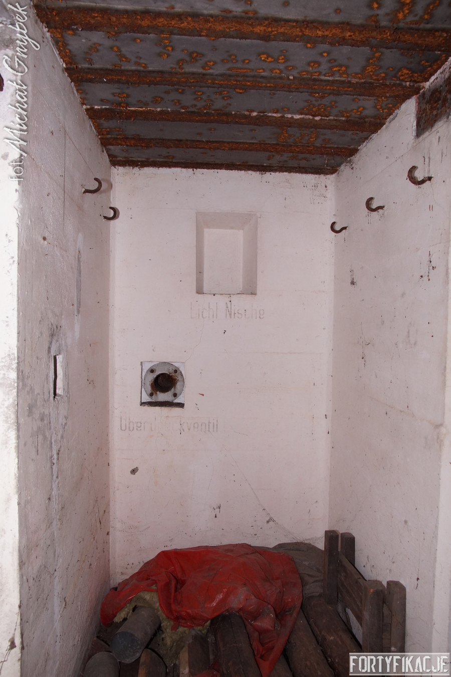 Obejrzymy izbę załogi, wartownię oraz blok wejściowy. Ten ostatni był niewielkich rozmiarów, wszak na zewnątrz prowadziło tylko jedno wyjście zamykane niegdyś drzwiami stalowymi 14P7. Na jego ścianach znajdziemy cenną sygnaturę oraz datę wzniesienia obiektu. Izba wypoczynku była sporych rozmiarów. Prócz funkcji socjalnej pomieszczenie to pełniło również role bojowe: znajdowało się tu stanowisko flankujące wejście do schronu ze stalową tarczą ze strzelnicą broni ręcznej 48P8 oraz wydzielona wartownia ze stanowiskiem obrony wewnętrznej z tarczą 57P8. Z izby załogi wyprowadzone było również wyjście ewakuacyjne. Mimo że schron służy jako magazyn, to wydaje się, że nie dotknęły jego wnętrz żadne powojenne i dotkliwe modyfikacje. Na ścianach można obejrzeć wiele zachowanych napisów eksploatacyjnych.