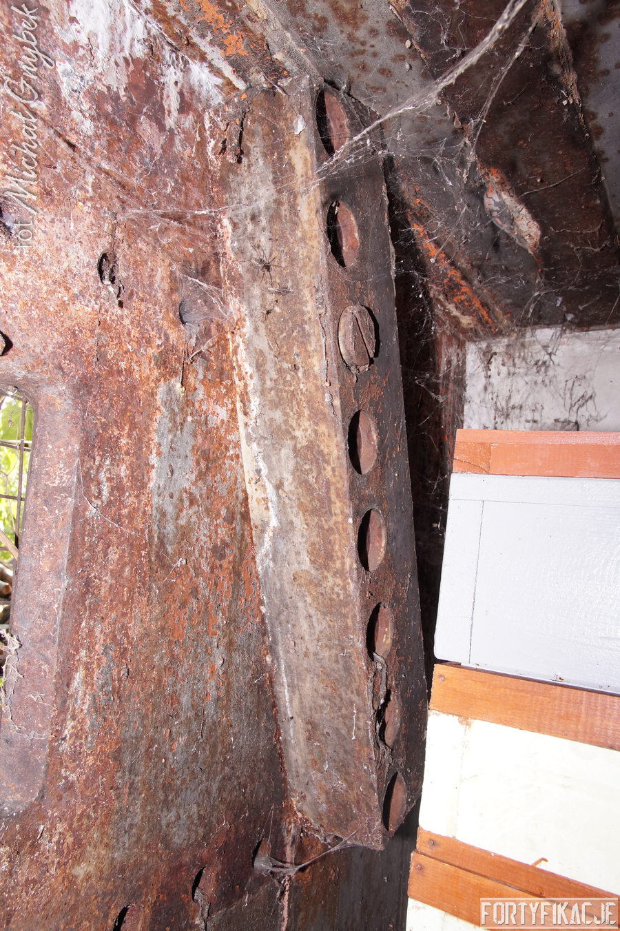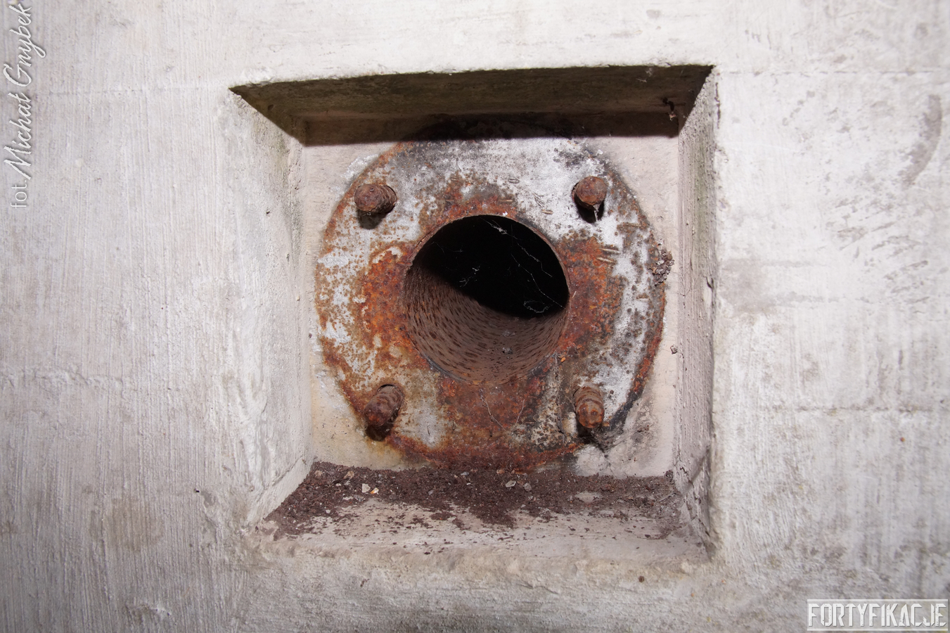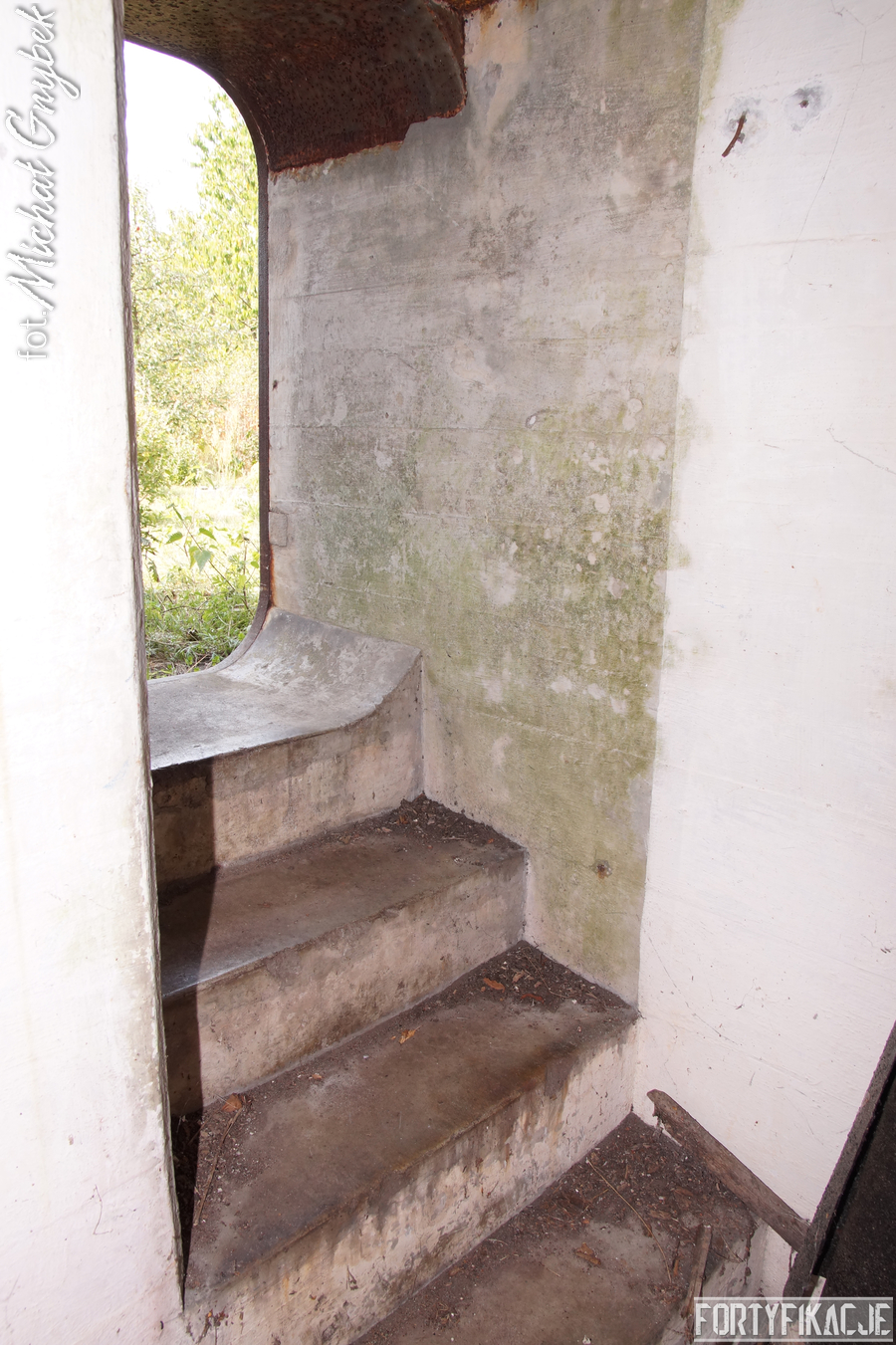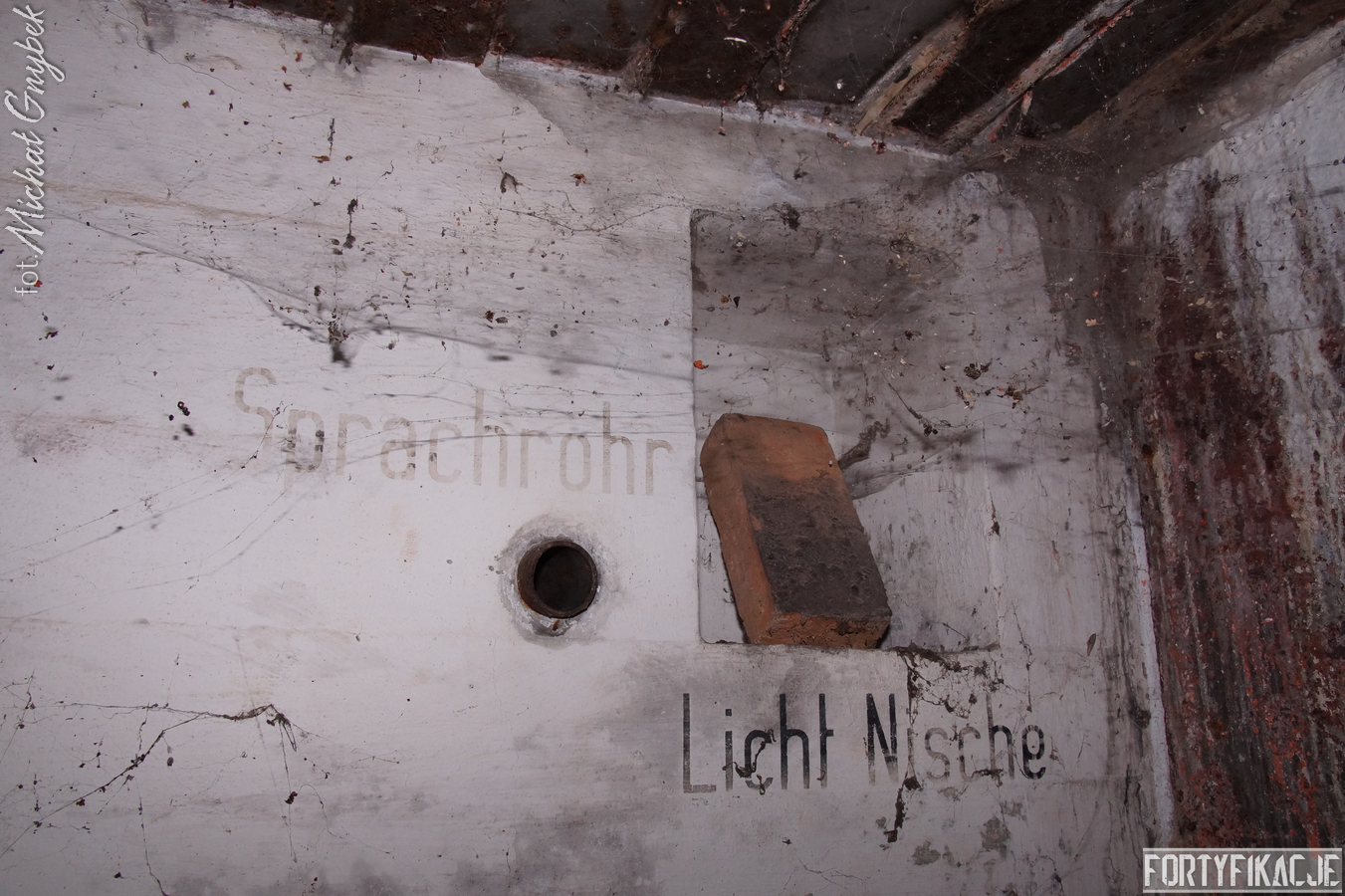 Obejrzymy izbę załogi, wartownię oraz blok wejściowy. Ten ostatni był niewielkich rozmiarów, wszak na zewnątrz prowadziło tylko jedno wyjście zamykane niegdyś drzwiami stalowymi 14P7. Na jego ścianach znajdziemy cenną sygnaturę oraz datę wzniesienia obiektu. Izba wypoczynku była sporych rozmiarów. Prócz funkcji socjalnej pomieszczenie to pełniło również role bojowe: znajdowało się tu stanowisko flankujące wejście do schronu ze stalową tarczą ze strzelnicą broni ręcznej 48P8 oraz wydzielona wartownia ze stanowiskiem obrony wewnętrznej z tarczą 57P8. Z izby załogi wyprowadzone było również wyjście ewakuacyjne. Mimo że schron służy jako magazyn, to wydaje się, że nie dotknęły jego wnętrz żadne powojenne i dotkliwe modyfikacje. Na ścianach można obejrzeć wiele zachowanych napisów eksploatacyjnych.