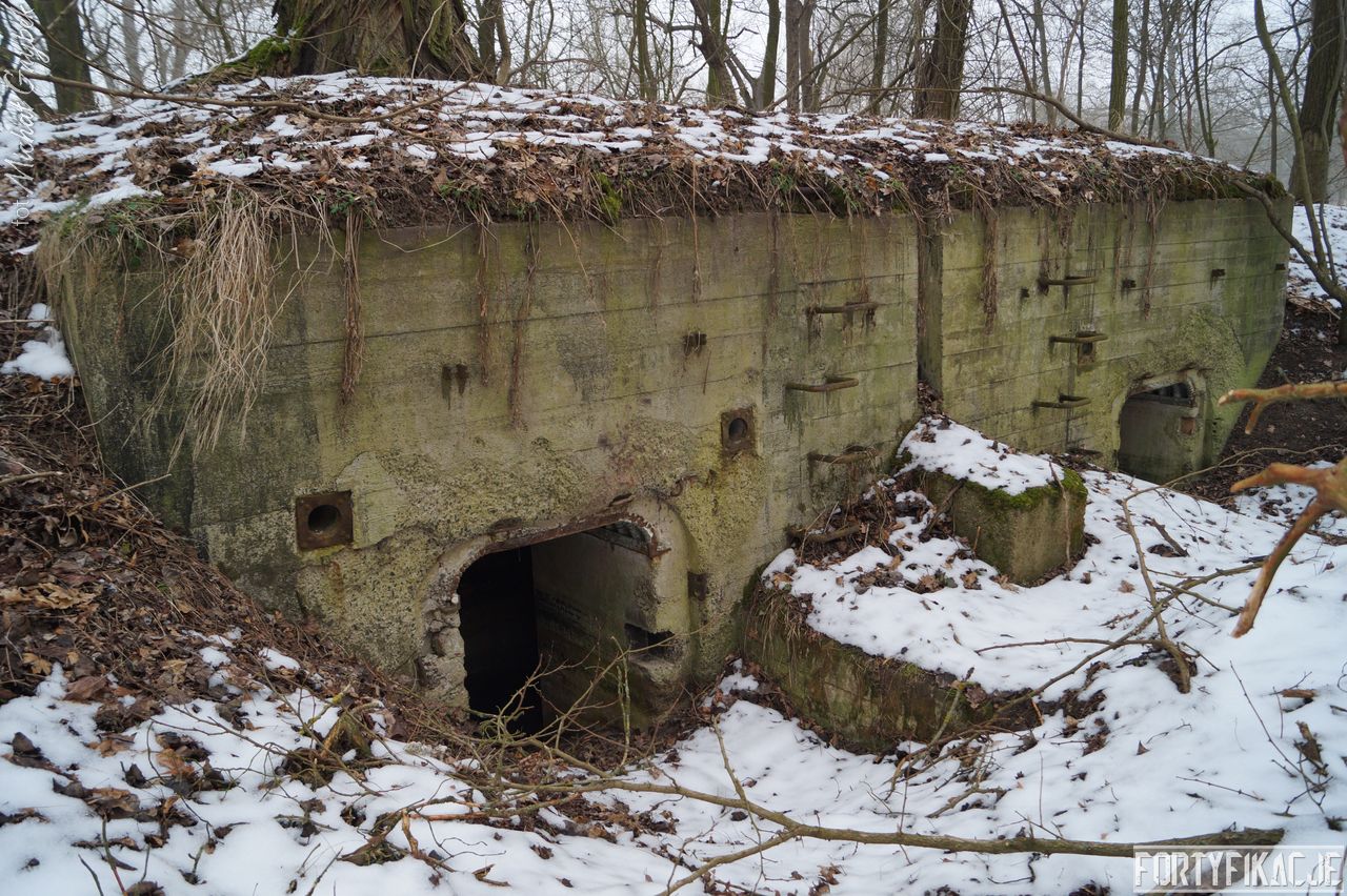 mógłby ktoś powiedzieć, ale kryje w sobie małą niespodziankę! Stand oczywiście zachowany jest bardzo dobrze. Położony w pobliżu brzegu Odry Stąd okresowo - nierzadko bardzo mocno - zalewany. Wzniesiony został w 1935r. I ten Unterstand był znakomicie skryty przed okiem przeciwnika. Zagłębiony w gruncie posiadał jedynie częściowo odsłoniętą elewację wejściową. Dziś niestety pozbawiony drzwi 14P7 wraz z ościeżnicami. Szczęśliwie zachowały się (styczeń 2017r.) stalowe klamry prowadzące na strop... Wejścia zabezpieczone zostały przed zalaniem dwiema schodniami.
