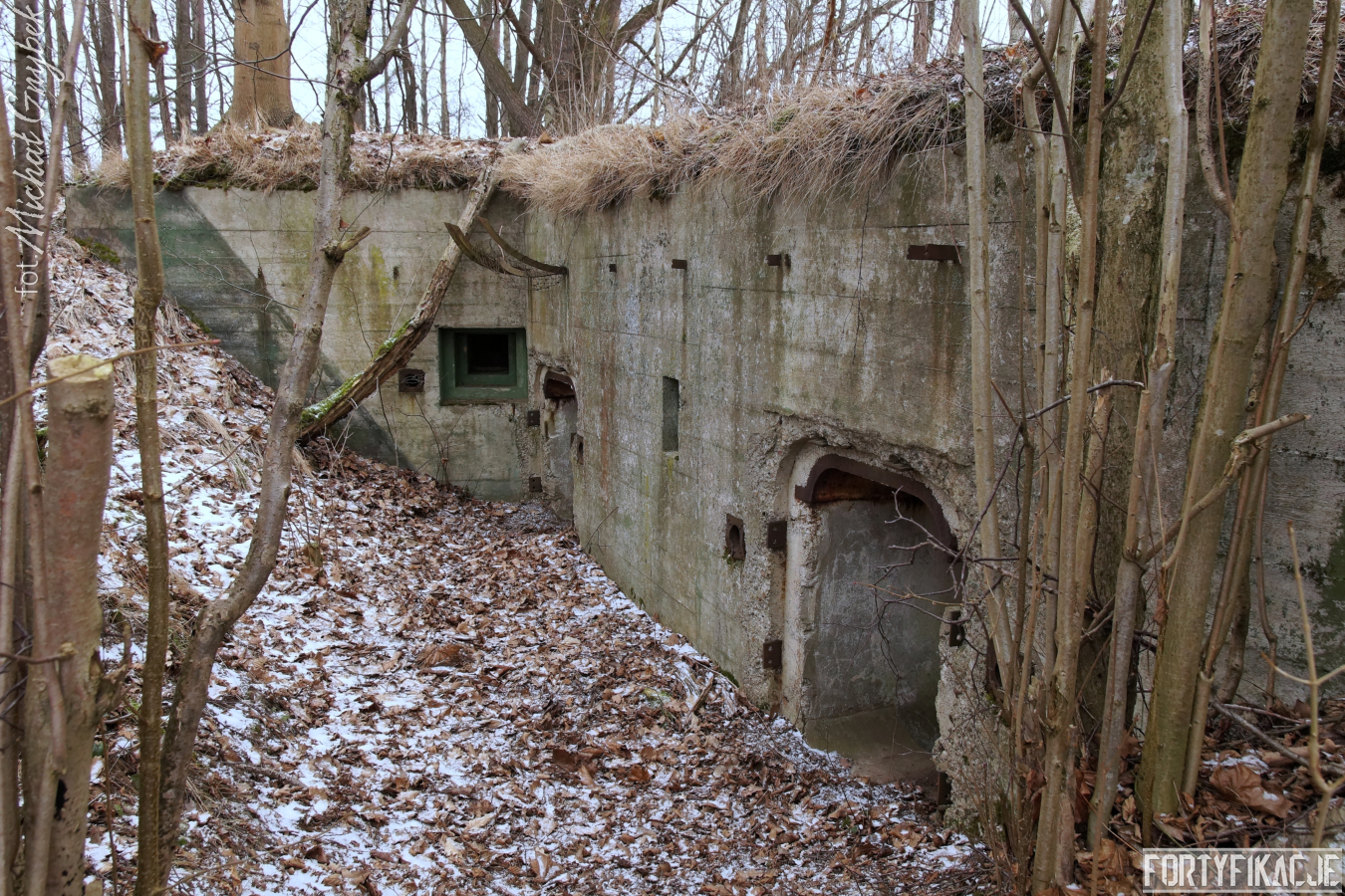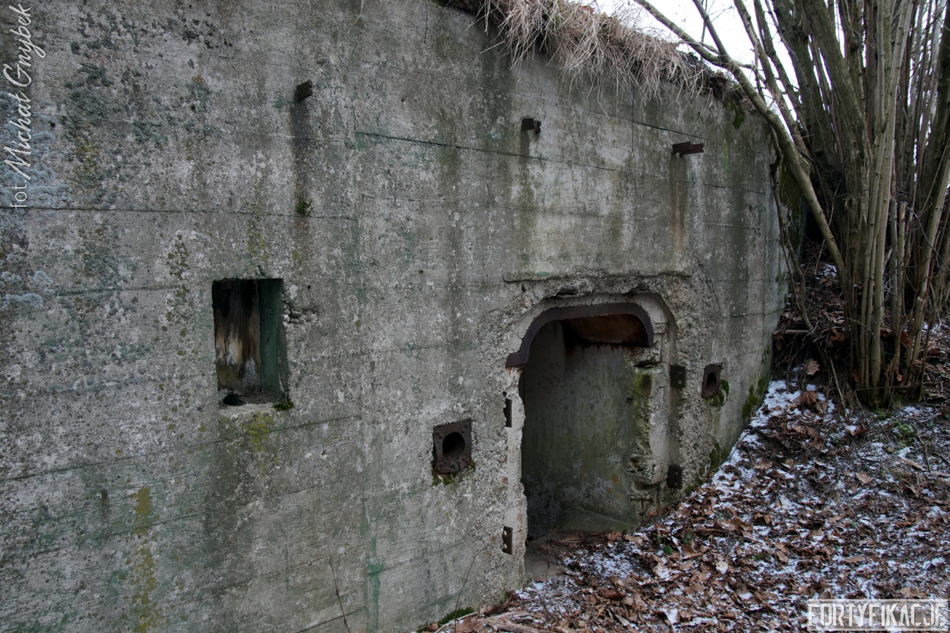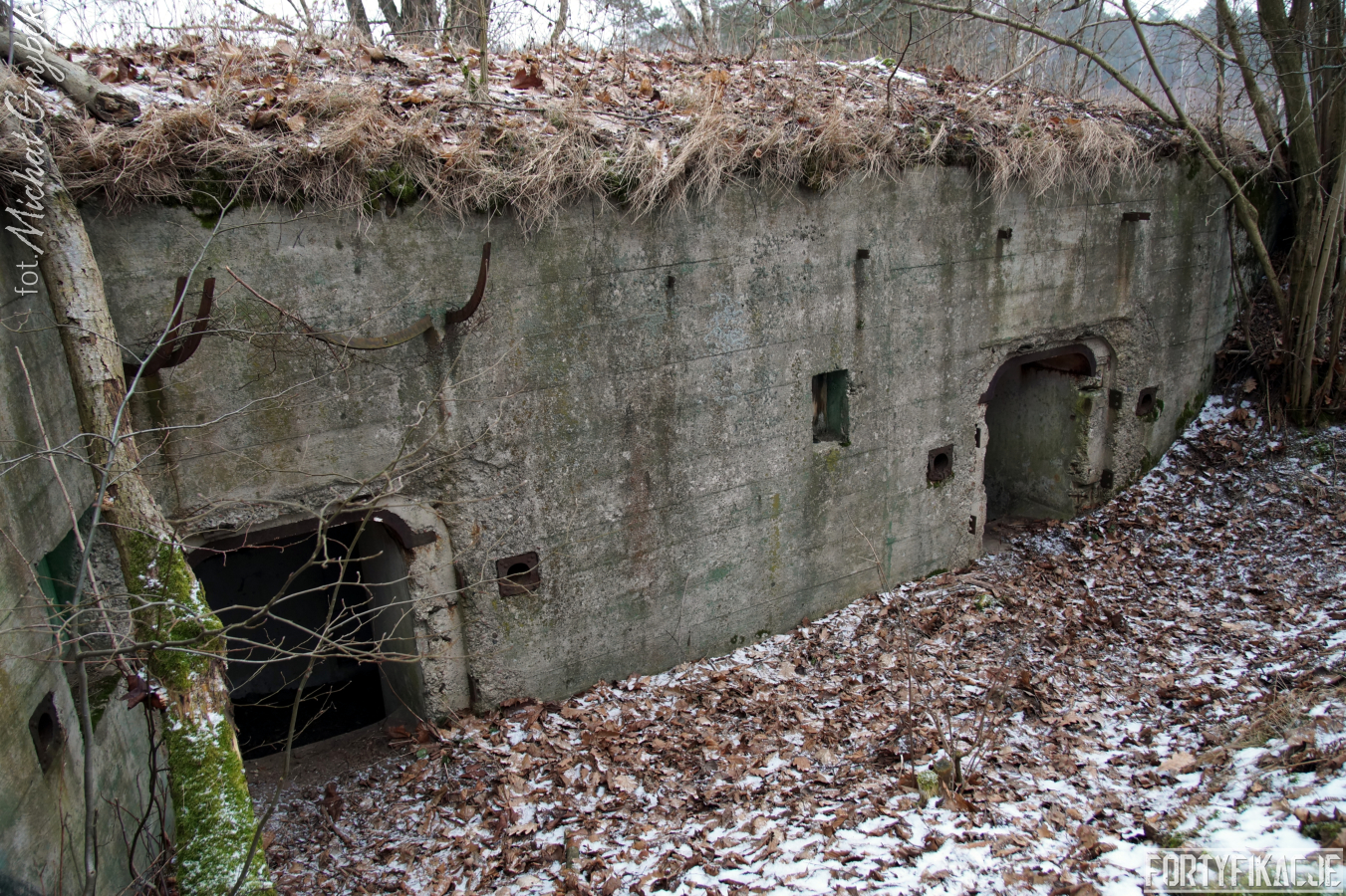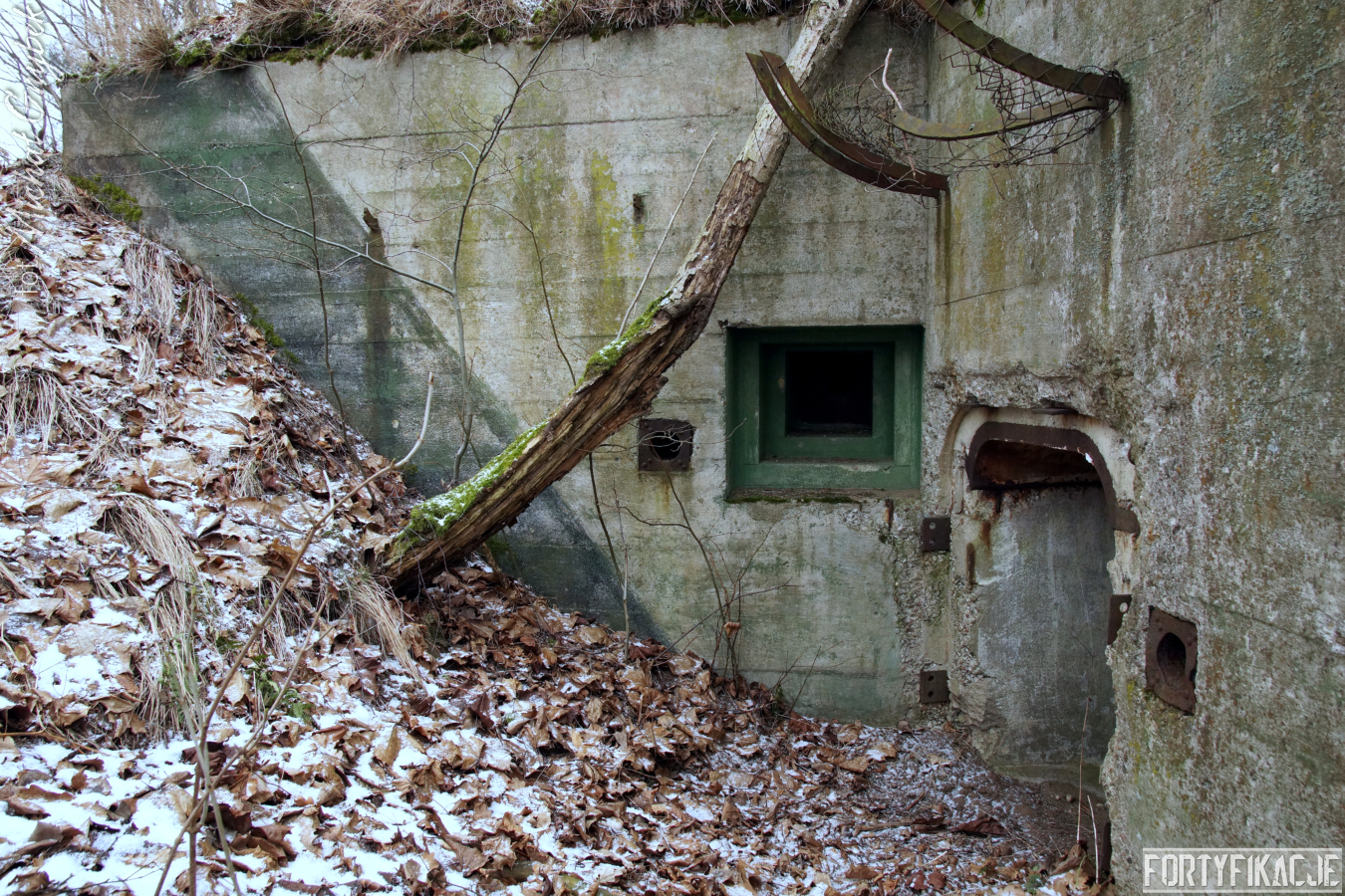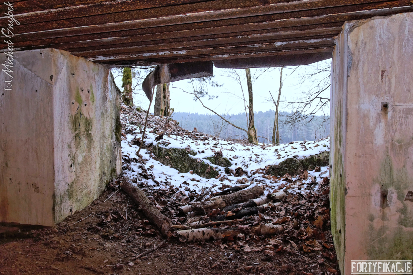 Przy tym jest to schron bardzo ciekawy, a przede wszystkim bardzo dobrze zachowany! Jego zadaniem była obrona w/w drogi, a oś pola ostrzału przebiegała równolegle do szosy. Szczególnie efektownie wygląda elewacja wejściowa: z dwoma wejściami i flankującym je oraz bliskie zapole stanowiskiem bojowym. W elewacji bojowej zionie niestety smutny otwór po usuniętej płycie stalowej 7P7. Wchodzimy do środka?