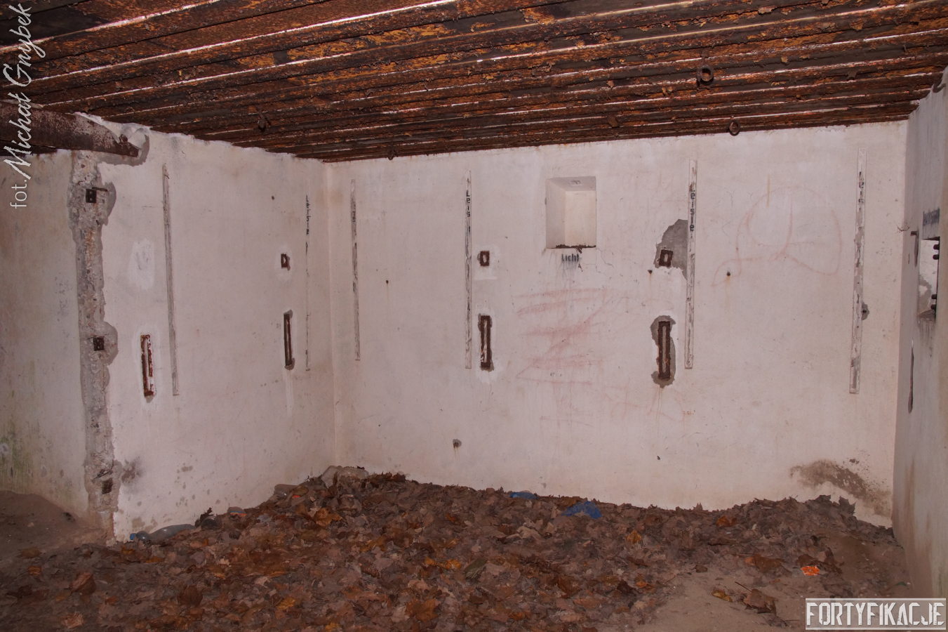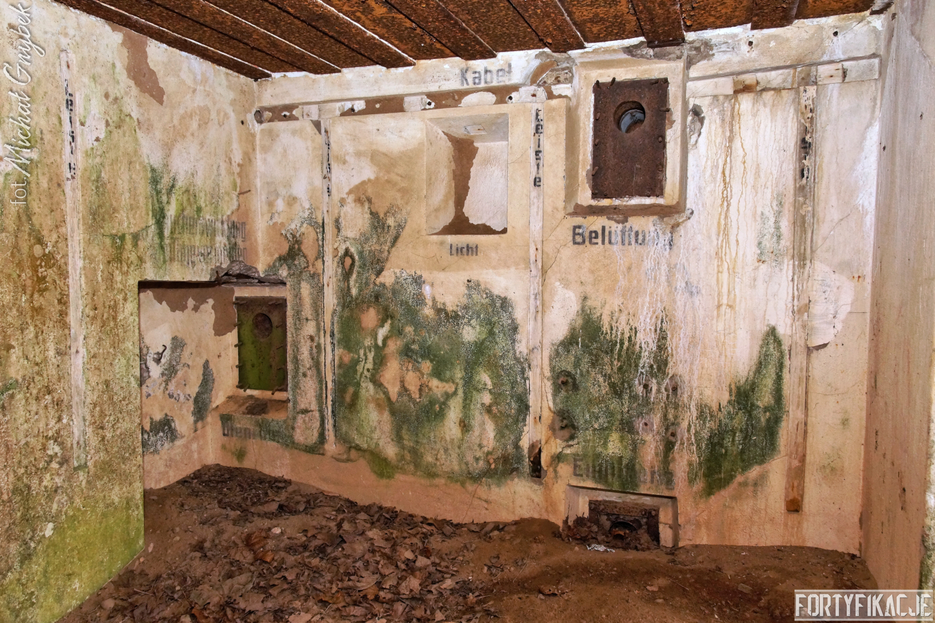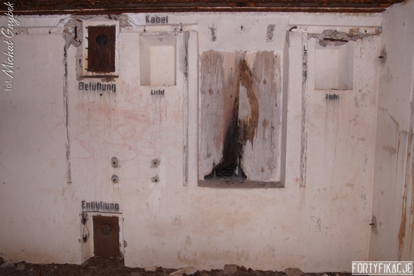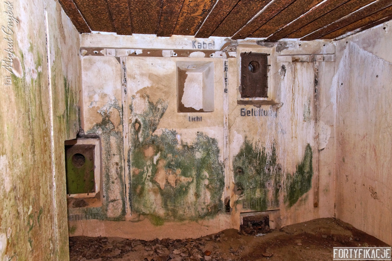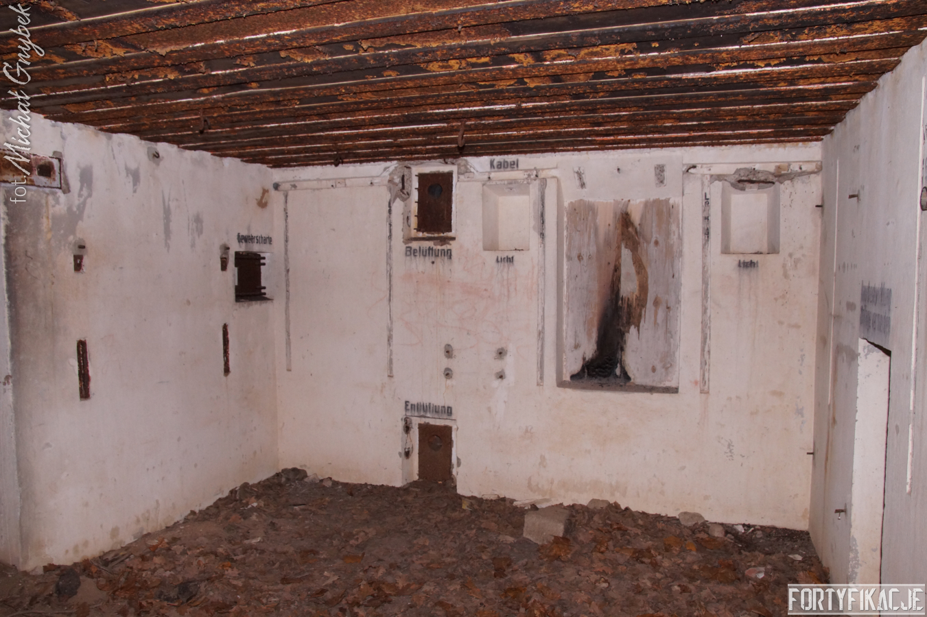 Wejdźmy do środka! Schron posiadał odporność w kat. "B1". Była to budowla średniej wielkości. Wnętrza kryją cztery pomieszczenia. Każde z nich co najmniej w dostatecznym stopniu zachowane. Nawet sporej wielkości izba bojowa, mimo że pozbawiona płyty stalowej, zachowana jest jest przyzwoicie. Niestety - coraz bardziej widocznym problemem jest w niej grzyb - zagrażający szczególnie napisom eksploatacyjnym! Warto zaznaczyć, że w każdym pomieszczeniu zachowanych jest mnóstwo napisów eksploatacyjnych. Docelowo miały ono ułatwić działania niewprawionym w walce fortecznej żołnierzom. Na uwagę zasługuje izba wypoczynku, gdzie w stanowiskach obrony wewnętrznej zachowały się dwie stalowe tarcze - tzw. "ramki". Podobnie w wartowni - tu zachowała się tarcza typu 48P8.