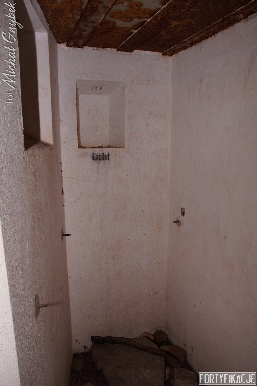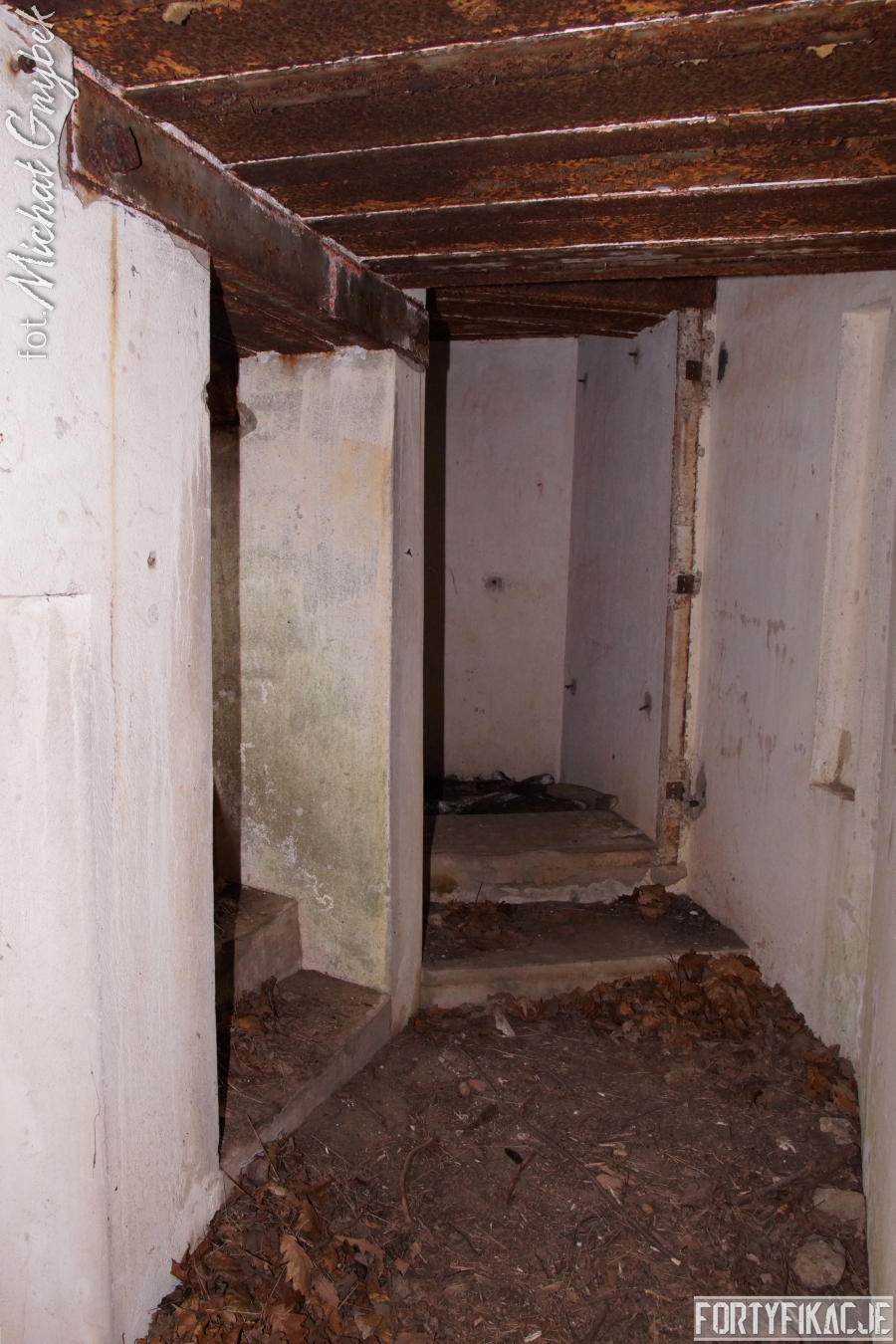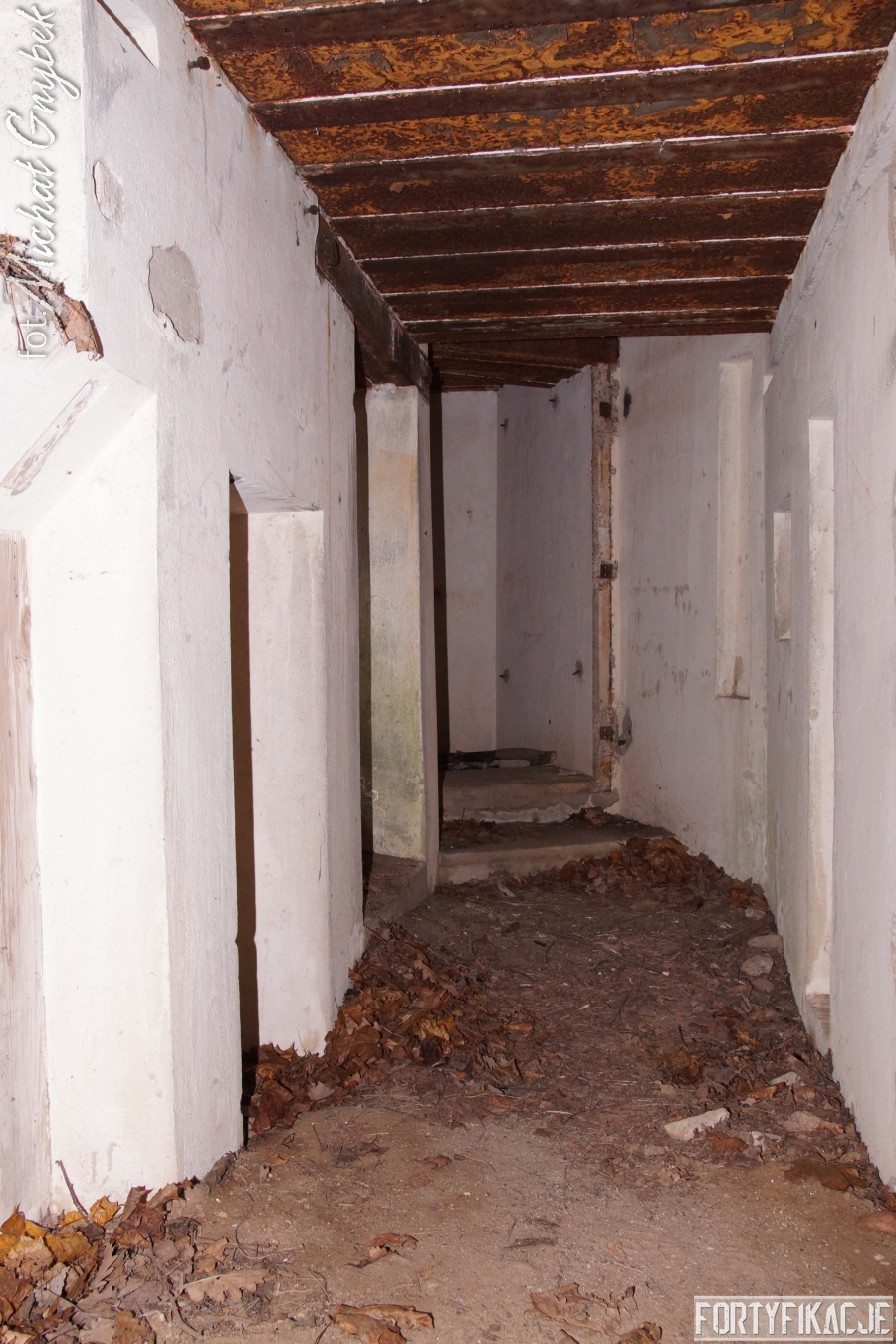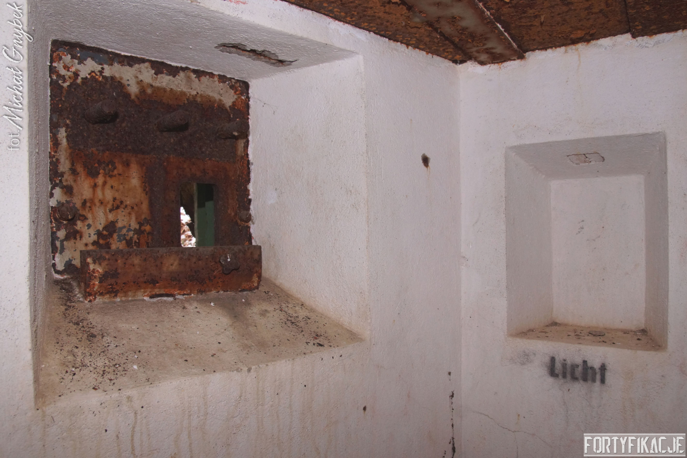 Wejdźmy do środka! Schron posiadał odporność w kat. "B1". Była to budowla średniej wielkości. Wnętrza kryją cztery pomieszczenia. Każde z nich co najmniej w dostatecznym stopniu zachowane. Nawet sporej wielkości izba bojowa, mimo że pozbawiona płyty stalowej, zachowana jest jest przyzwoicie. Niestety - coraz bardziej widocznym problemem jest w niej grzyb - zagrażający szczególnie napisom eksploatacyjnym! Warto zaznaczyć, że w każdym pomieszczeniu zachowanych jest mnóstwo napisów eksploatacyjnych. Docelowo miały ono ułatwić działania niewprawionym w walce fortecznej żołnierzom. Na uwagę zasługuje izba wypoczynku, gdzie w stanowiskach obrony wewnętrznej zachowały się dwie stalowe tarcze - tzw. "ramki". Podobnie w wartowni - tu zachowała się tarcza typu 48P8.