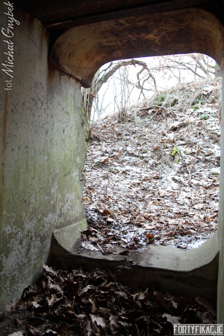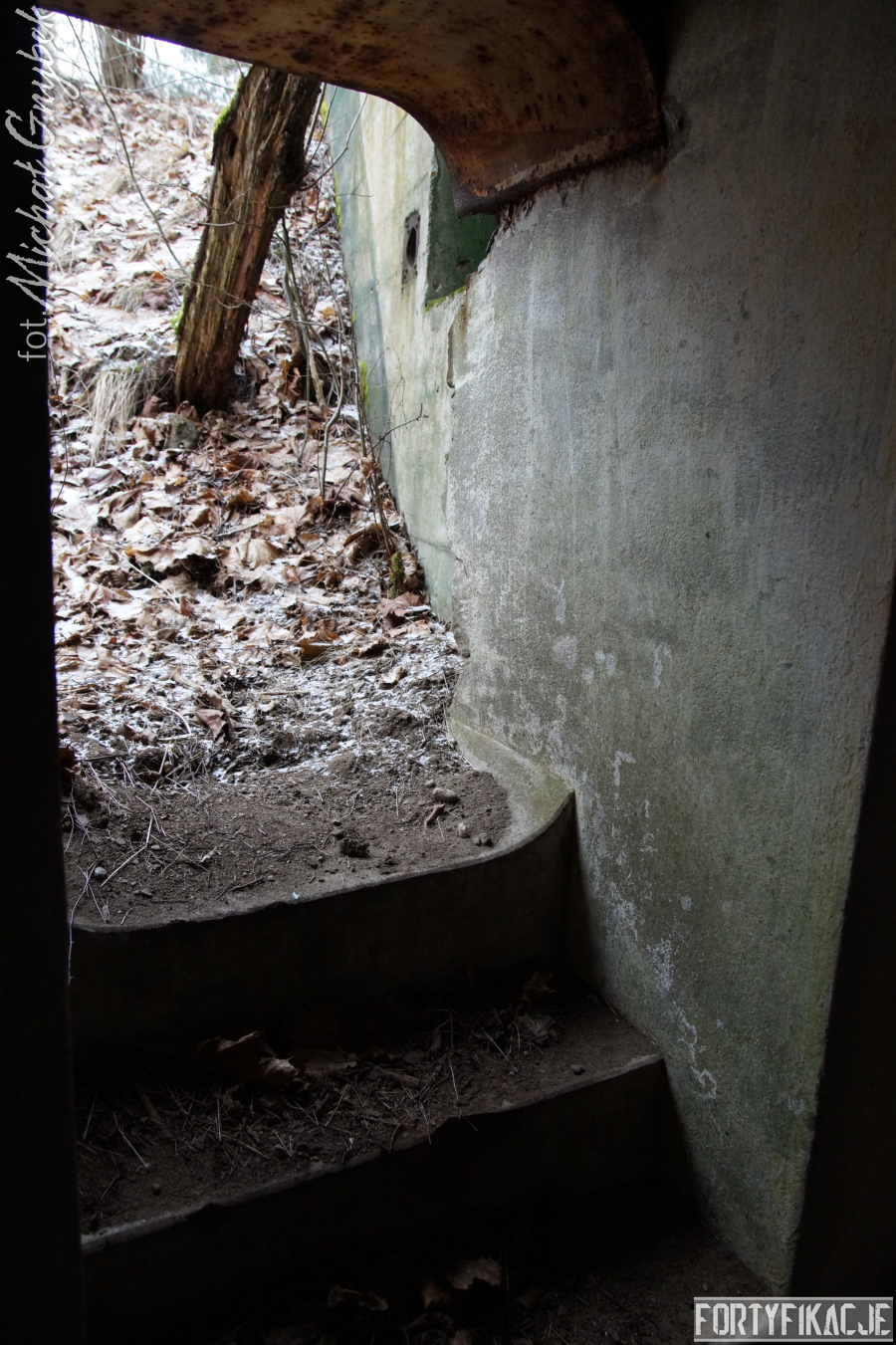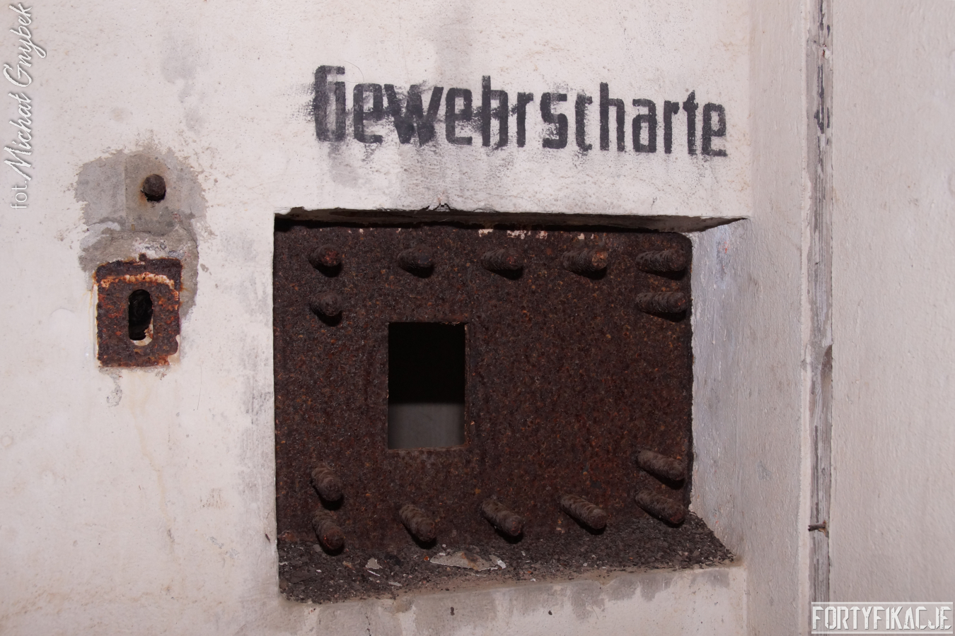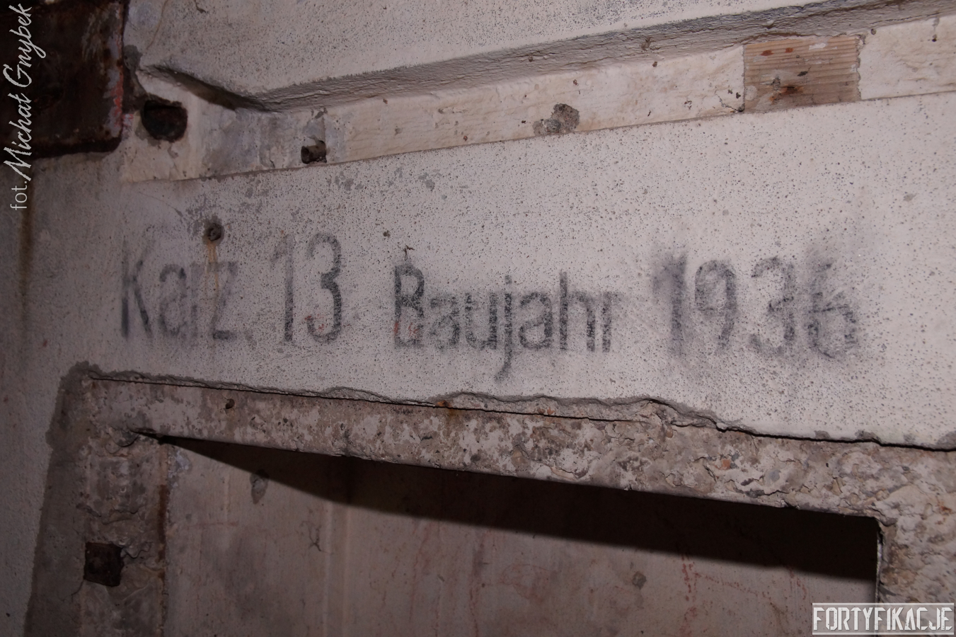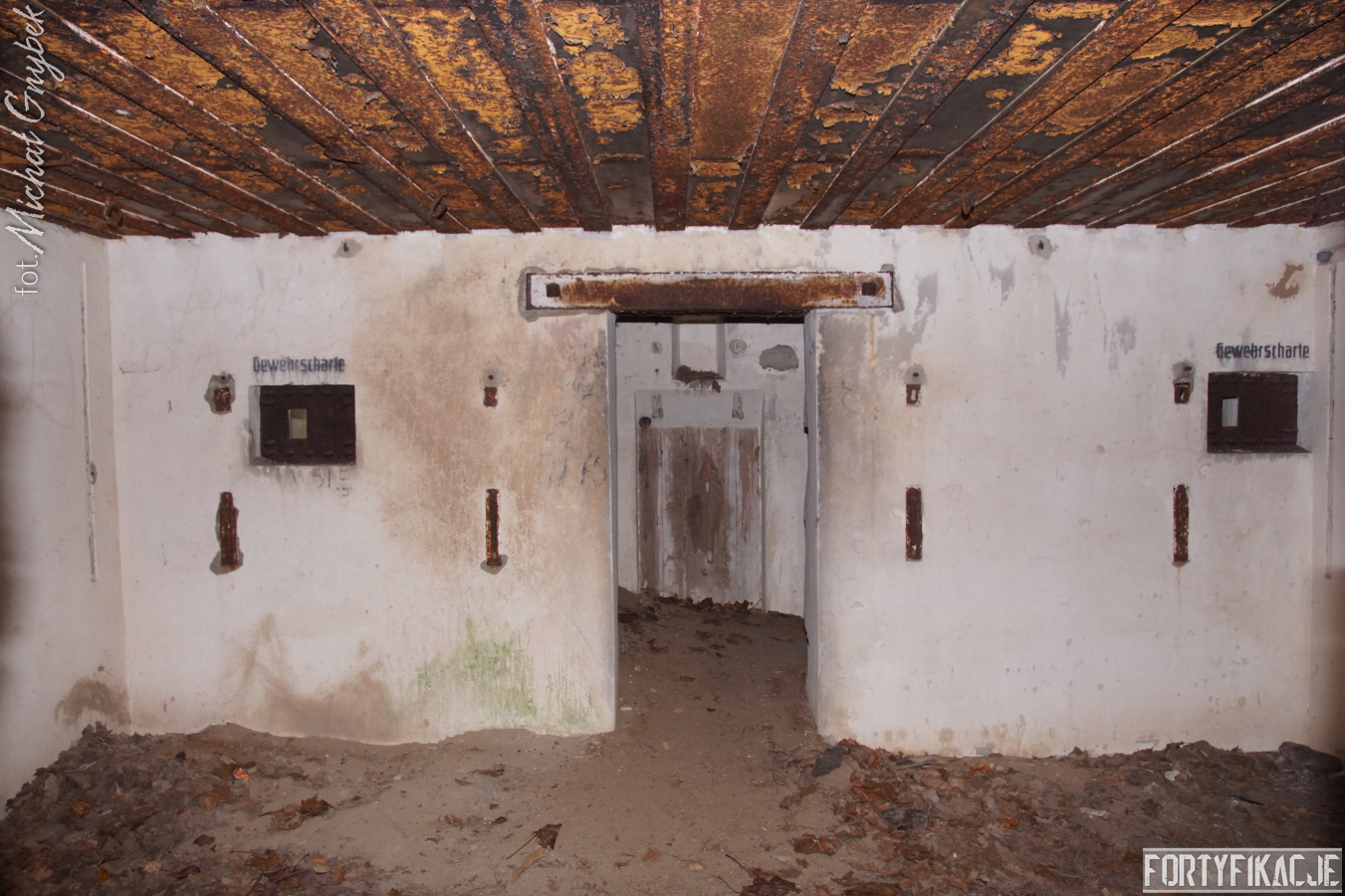 Wejdźmy do środka! Schron posiadał odporność w kat. "B1". Była to budowla średniej wielkości. Wnętrza kryją cztery pomieszczenia. Każde z nich co najmniej w dostatecznym stopniu zachowane. Nawet sporej wielkości izba bojowa, mimo że pozbawiona płyty stalowej, zachowana jest jest przyzwoicie. Niestety - coraz bardziej widocznym problemem jest w niej grzyb - zagrażający szczególnie napisom eksploatacyjnym! Warto zaznaczyć, że w każdym pomieszczeniu zachowanych jest mnóstwo napisów eksploatacyjnych. Docelowo miały ono ułatwić działania niewprawionym w walce fortecznej żołnierzom. Na uwagę zasługuje izba wypoczynku, gdzie w stanowiskach obrony wewnętrznej zachowały się dwie stalowe tarcze - tzw. "ramki". Podobnie w wartowni - tu zachowała się tarcza typu 48P8.