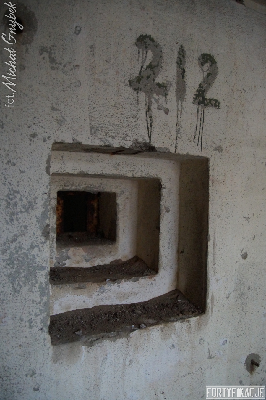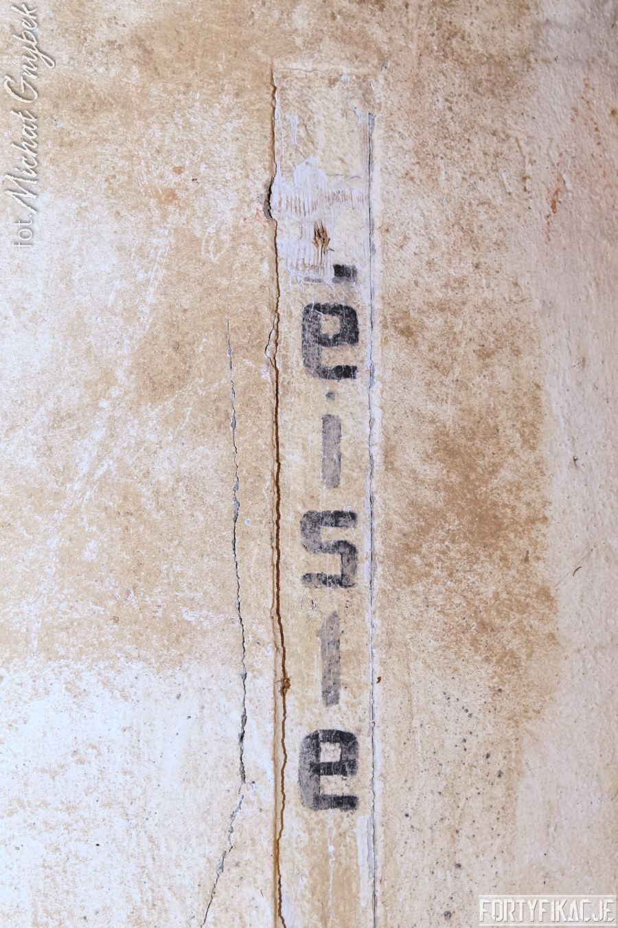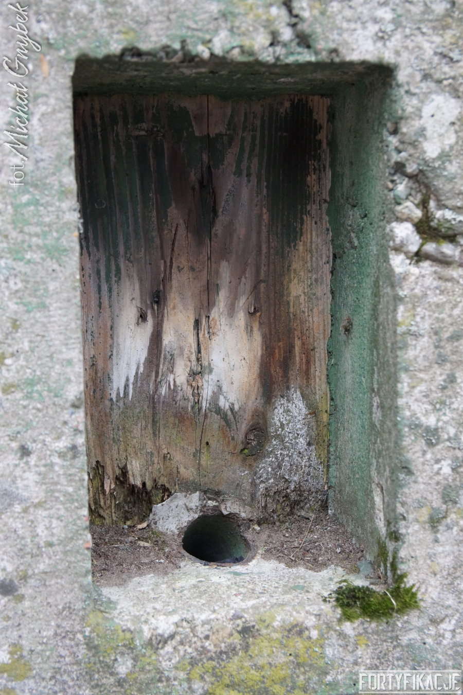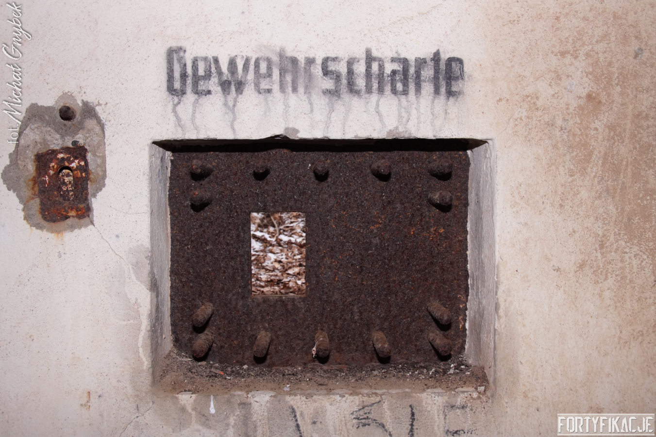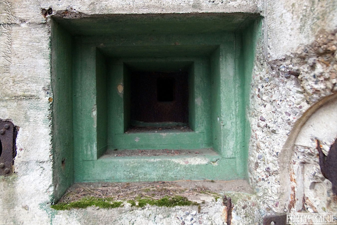 Wejdźmy do środka! Schron posiadał odporność w kat. "B1". Była to budowla średniej wielkości. Wnętrza kryją cztery pomieszczenia. Każde z nich co najmniej w dostatecznym stopniu zachowane. Nawet sporej wielkości izba bojowa, mimo że pozbawiona płyty stalowej, zachowana jest jest przyzwoicie. Niestety - coraz bardziej widocznym problemem jest w niej grzyb - zagrażający szczególnie napisom eksploatacyjnym! Warto zaznaczyć, że w każdym pomieszczeniu zachowanych jest mnóstwo napisów eksploatacyjnych. Docelowo miały ono ułatwić działania niewprawionym w walce fortecznej żołnierzom. Na uwagę zasługuje izba wypoczynku, gdzie w stanowiskach obrony wewnętrznej zachowały się dwie stalowe tarcze - tzw. "ramki". Podobnie w wartowni - tu zachowała się tarcza typu 48P8.