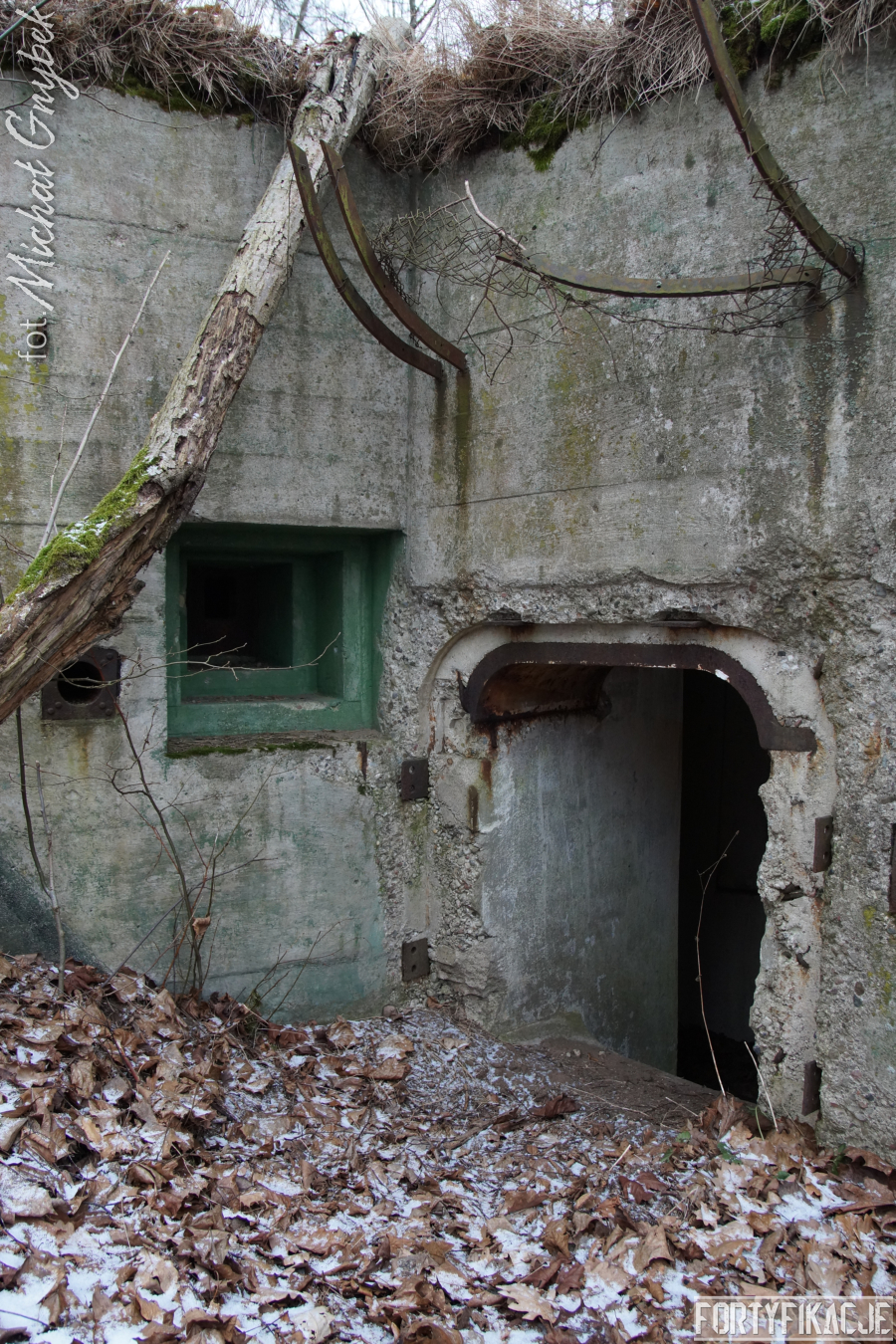 Przy tym jest to schron bardzo ciekawy, a przede wszystkim bardzo dobrze zachowany! Jego zadaniem była obrona w/w drogi, a oś pola ostrzału przebiegała równolegle do szosy. Szczególnie efektownie wygląda elewacja wejściowa: z dwoma wejściami i flankującym je oraz bliskie zapole stanowiskiem bojowym. W elewacji bojowej zionie niestety smutny otwór po usuniętej płycie stalowej 7P7. Wchodzimy do środka?