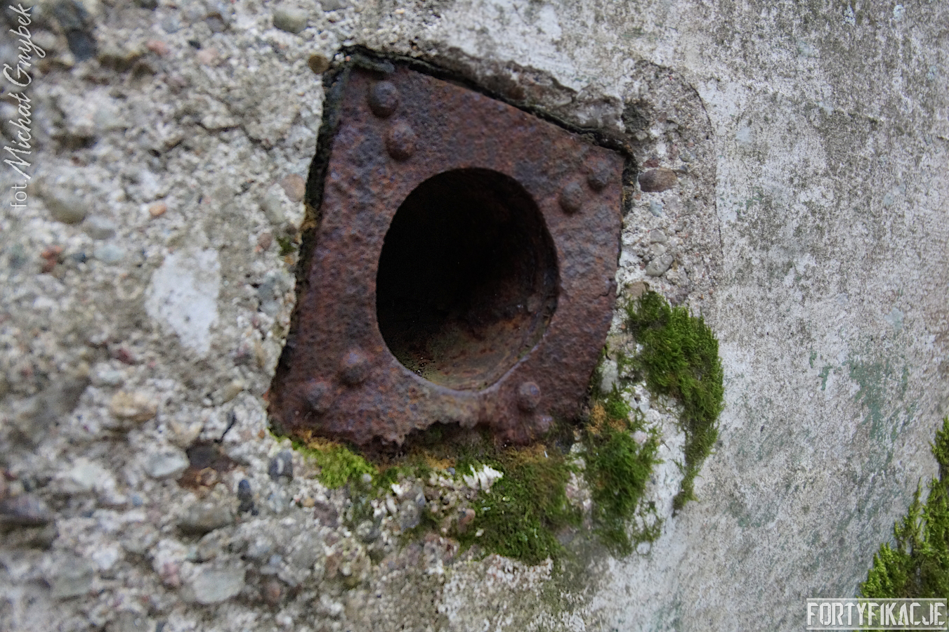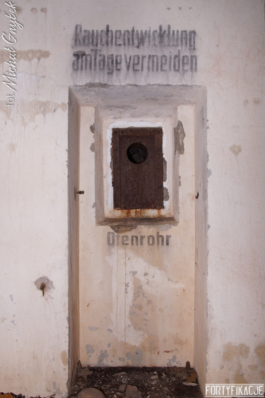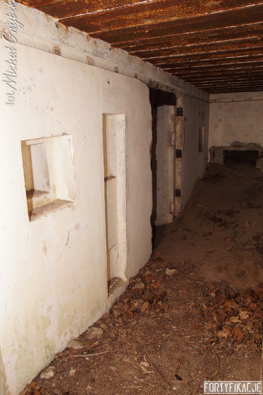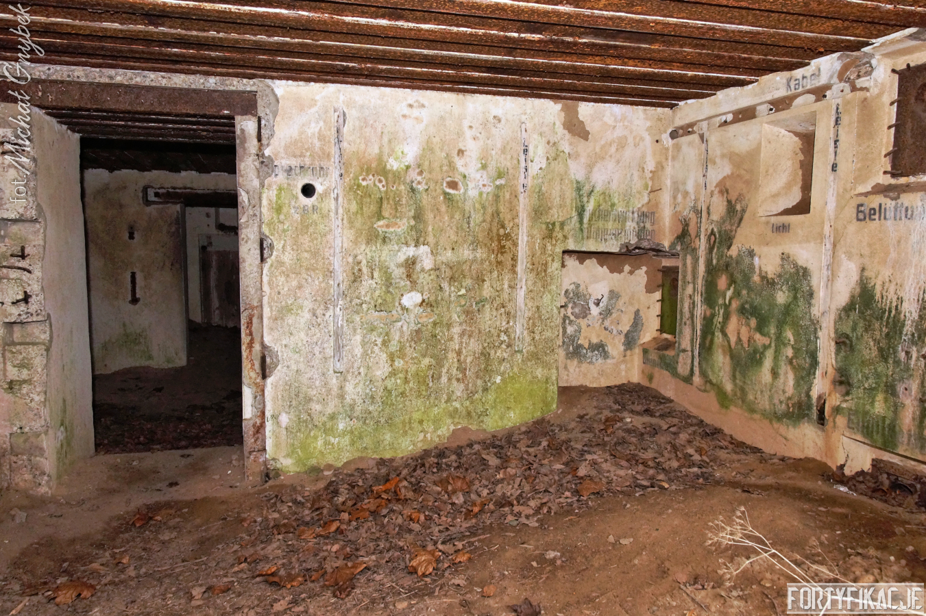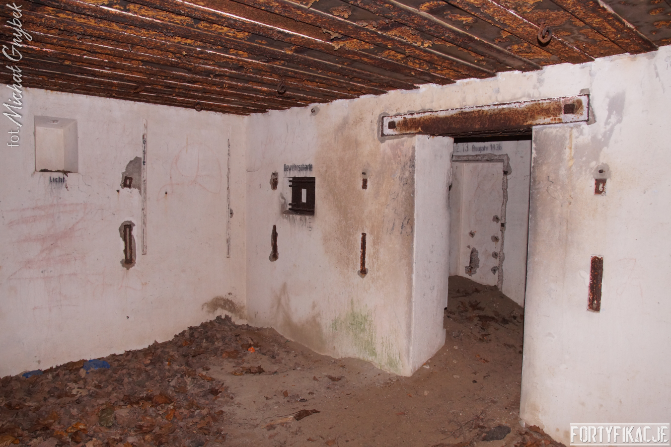 Wejdźmy do środka! Schron posiadał odporność w kat. "B1". Była to budowla średniej wielkości. Wnętrza kryją cztery pomieszczenia. Każde z nich co najmniej w dostatecznym stopniu zachowane. Nawet sporej wielkości izba bojowa, mimo że pozbawiona płyty stalowej, zachowana jest jest przyzwoicie. Niestety - coraz bardziej widocznym problemem jest w niej grzyb - zagrażający szczególnie napisom eksploatacyjnym! Warto zaznaczyć, że w każdym pomieszczeniu zachowanych jest mnóstwo napisów eksploatacyjnych. Docelowo miały ono ułatwić działania niewprawionym w walce fortecznej żołnierzom. Na uwagę zasługuje izba wypoczynku, gdzie w stanowiskach obrony wewnętrznej zachowały się dwie stalowe tarcze - tzw. "ramki". Podobnie w wartowni - tu zachowała się tarcza typu 48P8.