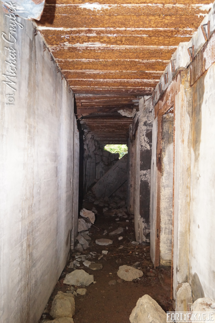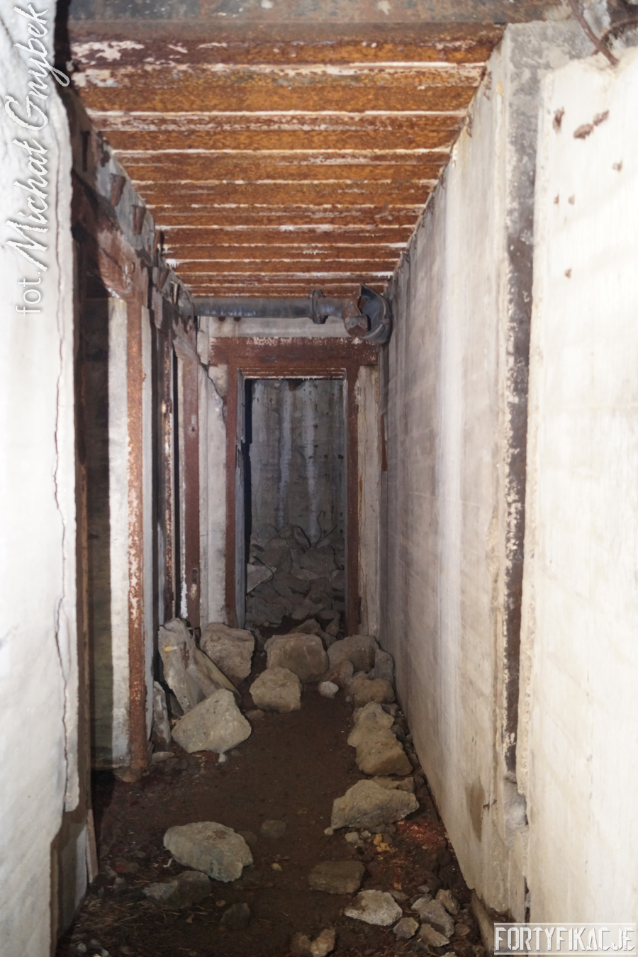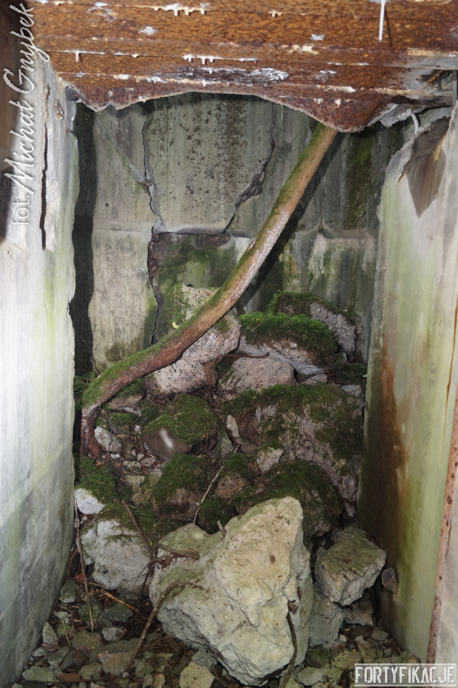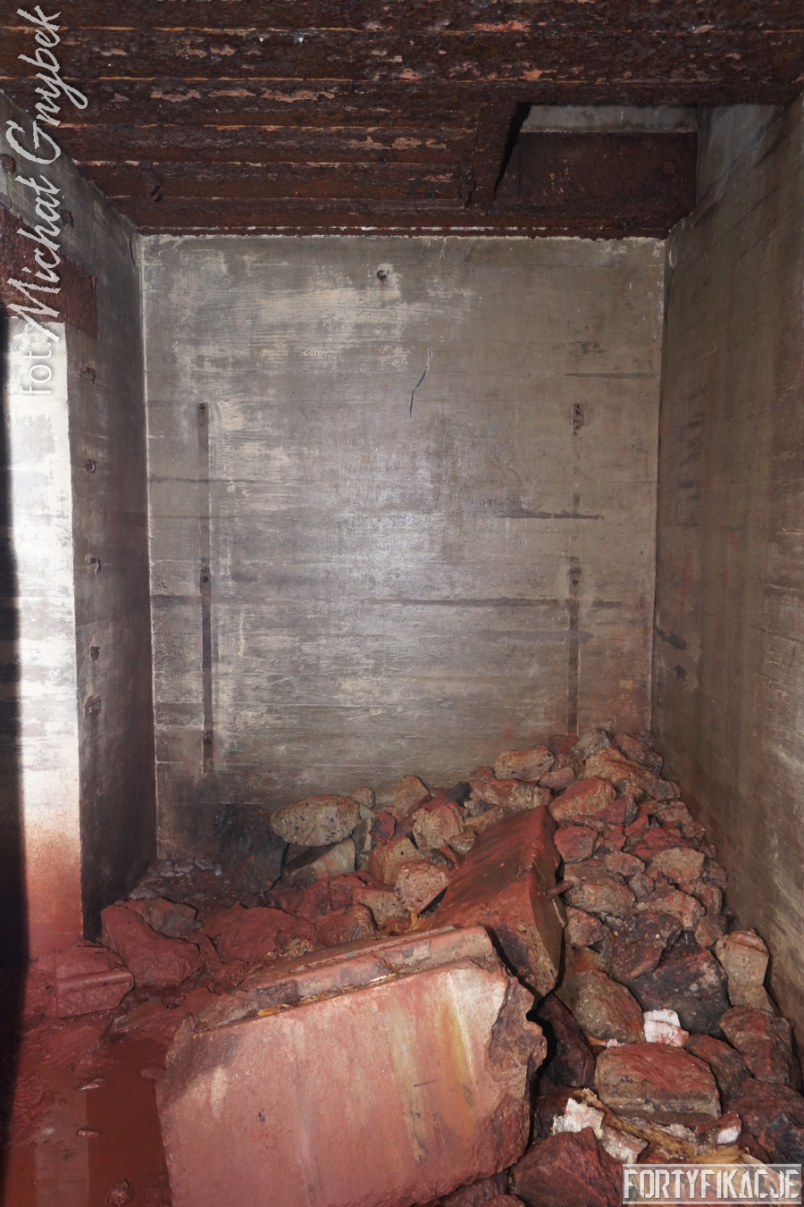 Czas też wyjaśnić skąd asymetria w kształcie pomiędzy górną a dolną kondygnacją. Przy tym warto również zadać kolejne pytanie: jaka była zasadność istnienia w obiekcie tak licznych pomieszczeń załogi? Docelowo B-Werk miał być wzmocniony wieżą lub izbą bojową uzbrojoną w armatę przeciwpancerną, prawdopodobnie kal. 50mm. Gdyby schron w rzeczywistości otrzymał takie uzbrojenie, niewątpliwie potrzebna byłaby wówczas większa załoga. Asymetrię w schronie widać właśnie tam, gdzie miało być ulokowane przejście do planowanej izby bojowej. Niestety planów nie zrealizowano... ![]()