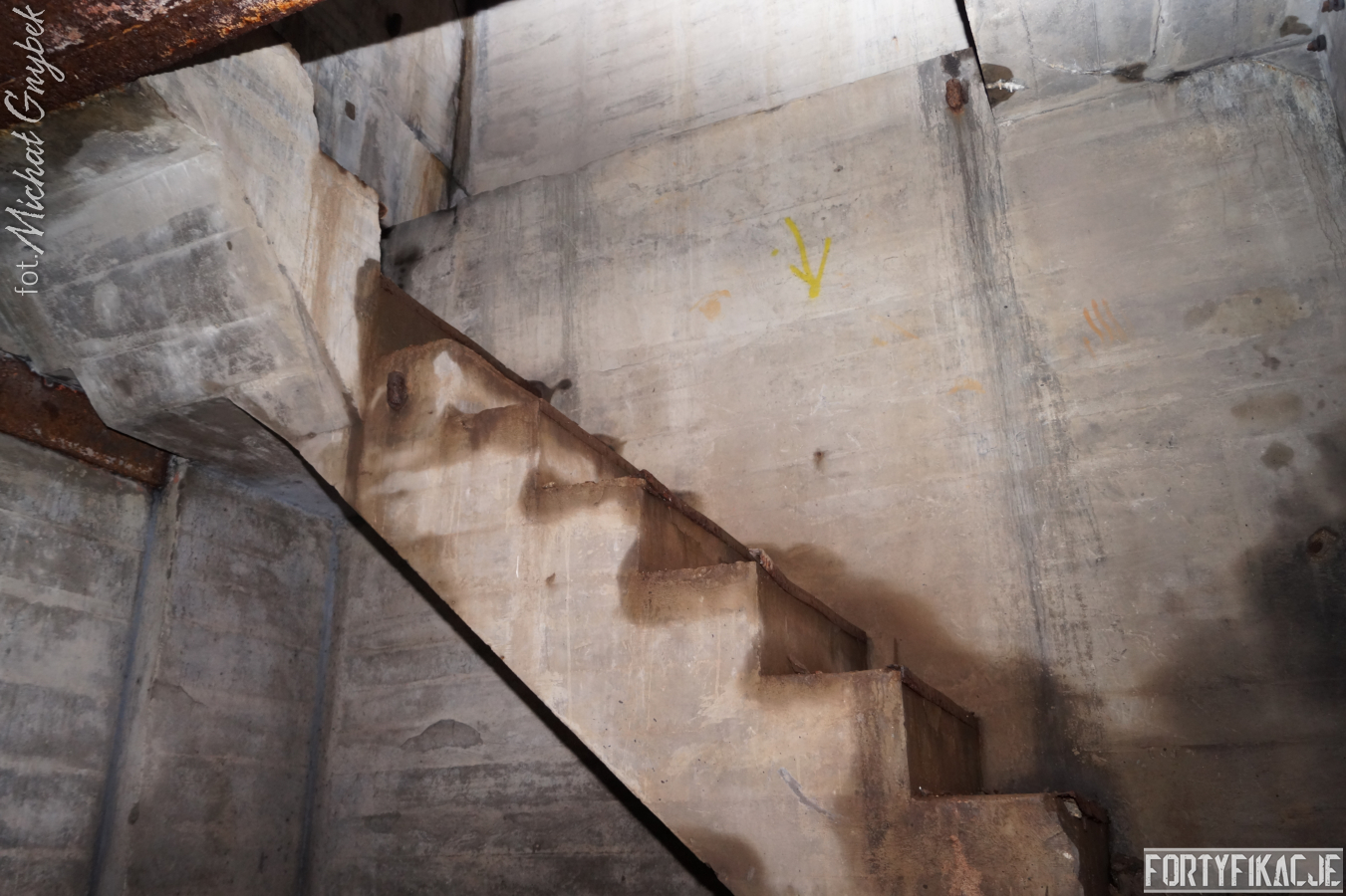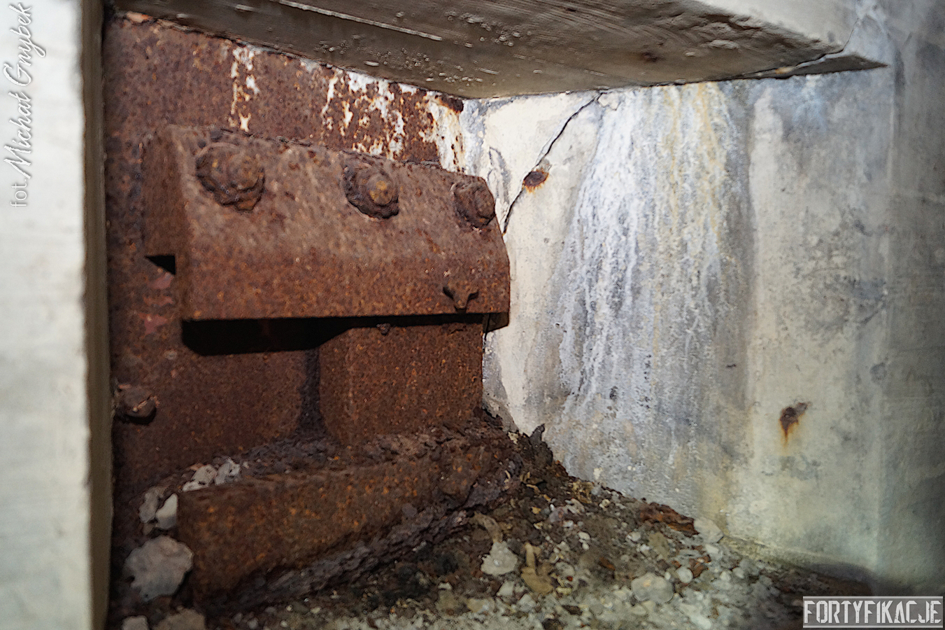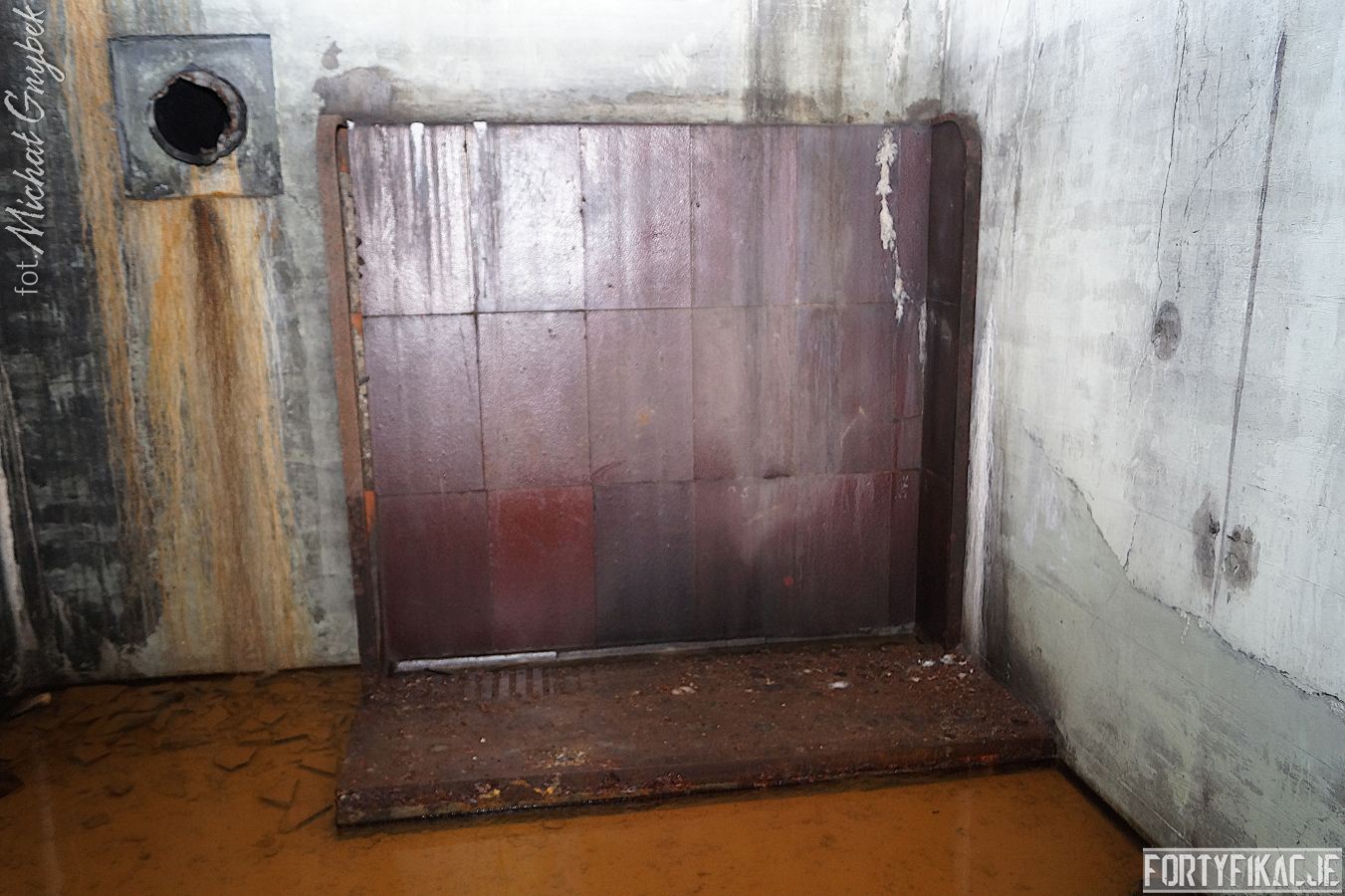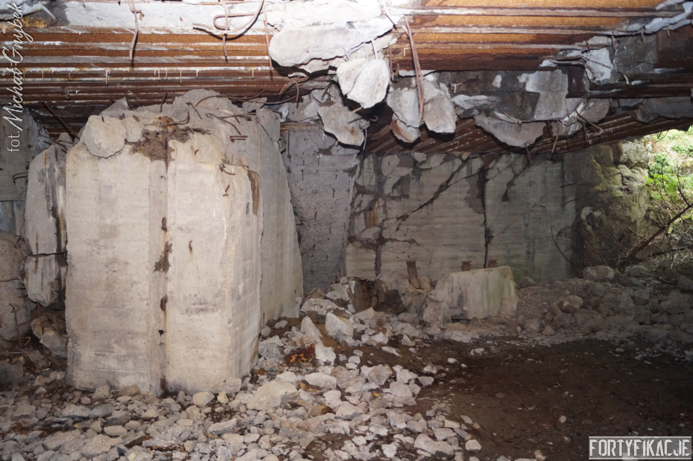 Czas też wyjaśnić skąd asymetria w kształcie pomiędzy górną a dolną kondygnacją. Przy tym warto również zadać kolejne pytanie: jaka była zasadność istnienia w obiekcie tak licznych pomieszczeń załogi? Docelowo B-Werk miał być wzmocniony wieżą lub izbą bojową uzbrojoną w armatę przeciwpancerną, prawdopodobnie kal. 50mm. Gdyby schron w rzeczywistości otrzymał takie uzbrojenie, niewątpliwie potrzebna byłaby wówczas większa załoga. Asymetrię w schronie widać właśnie tam, gdzie miało być ulokowane przejście do planowanej izby bojowej. Niestety planów nie zrealizowano... ![]()