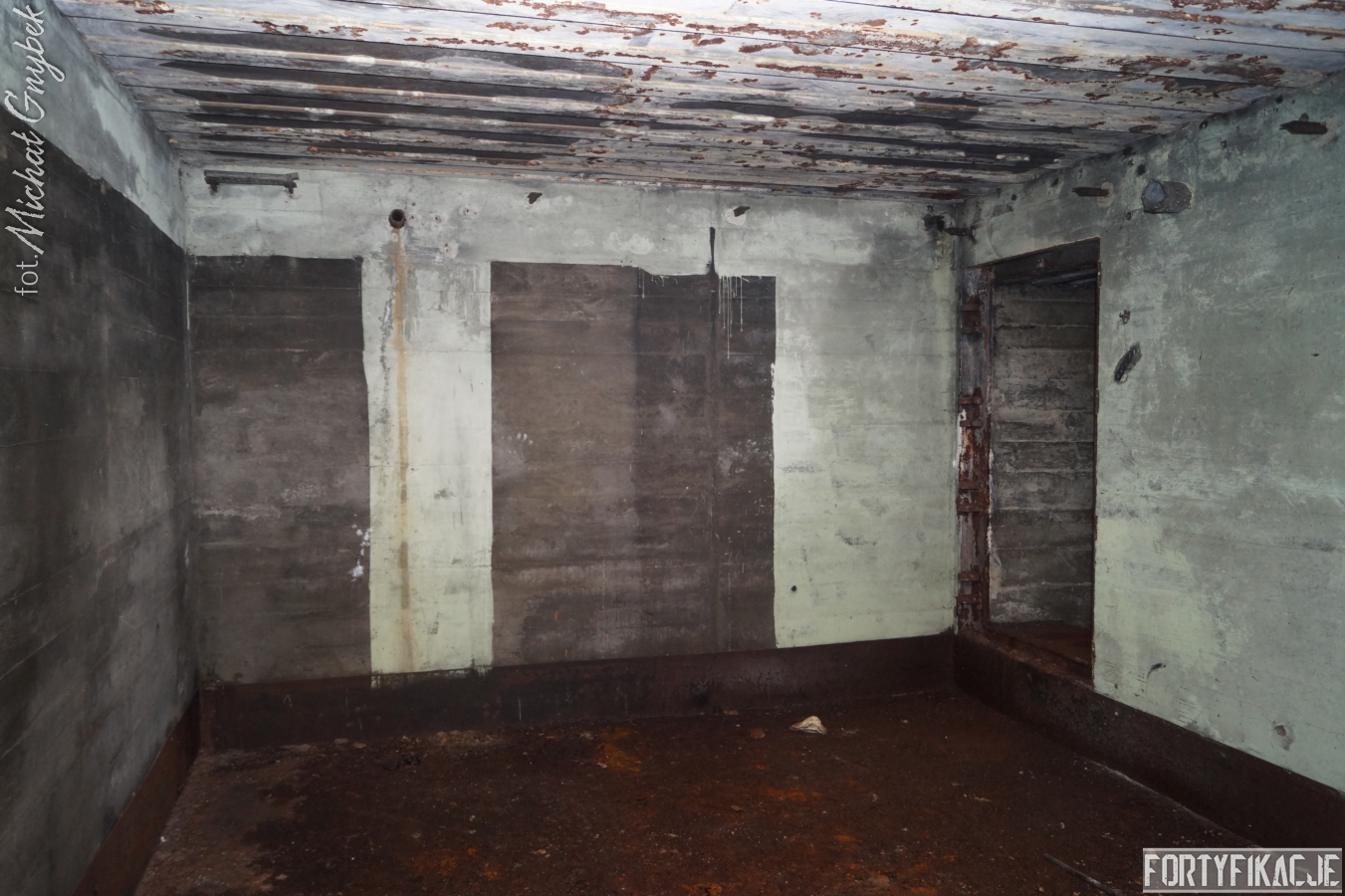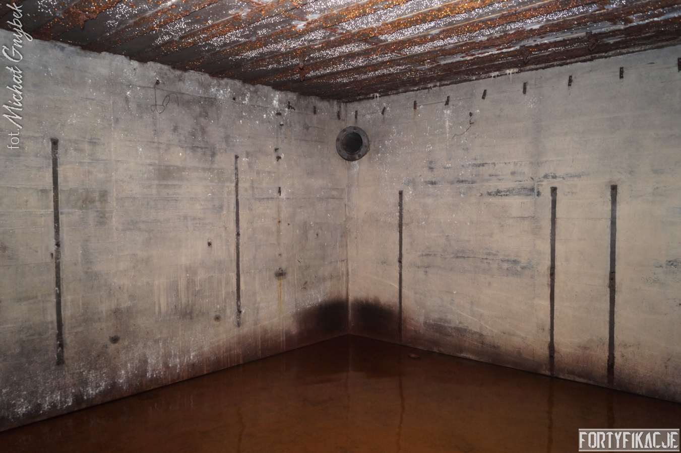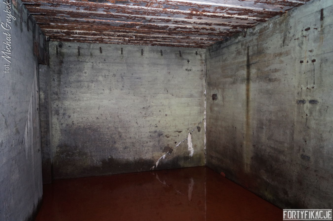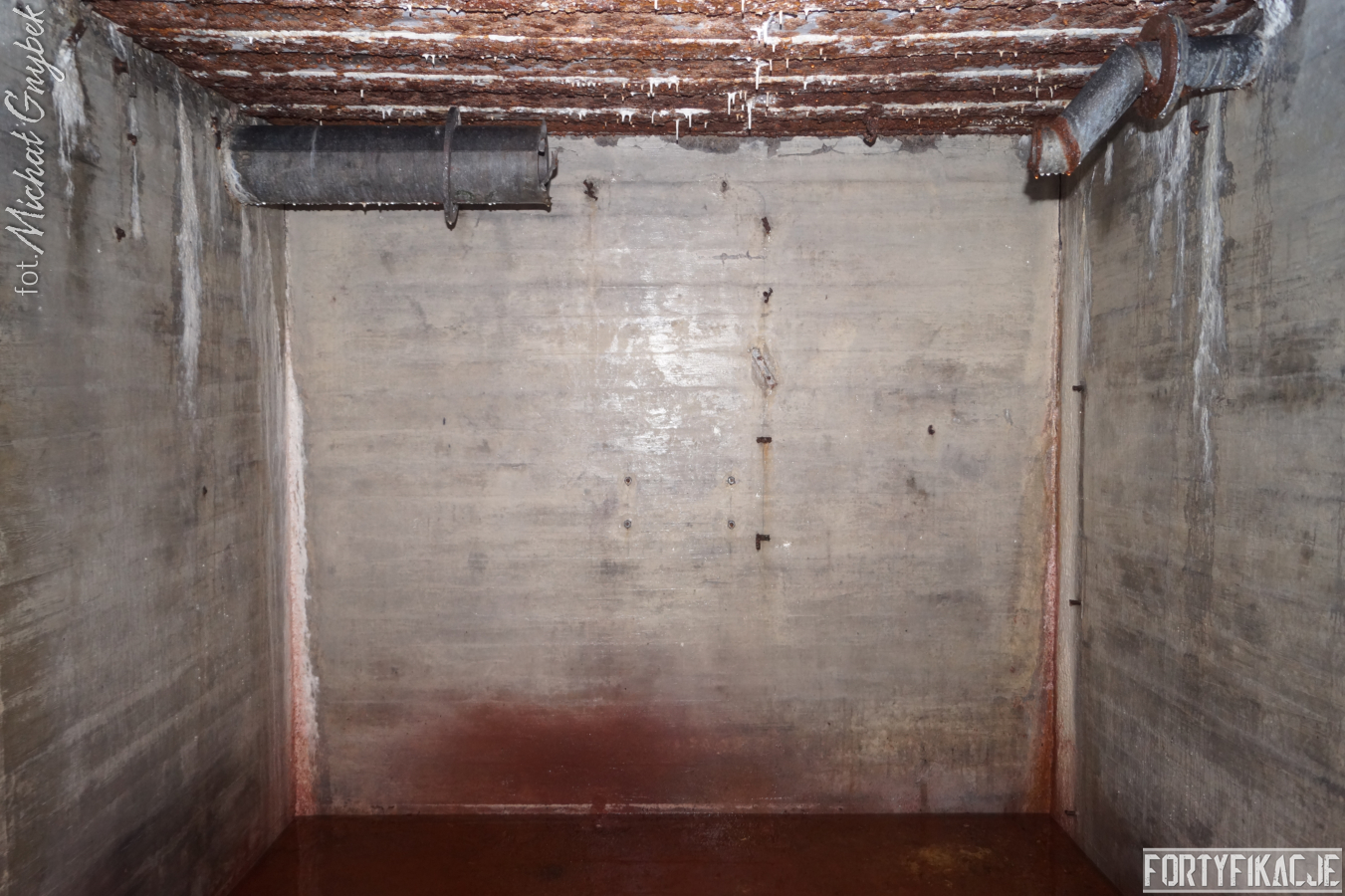 Uwagę w oglądanych pomieszczeniach przyciąga zachowane malowanie. Co ciekawe na ścianach nie zobaczymy praktycznie żadnych napisów eksploatacyjnych... Schron wygląda pod tym względem na nieukończony. Jak ukazują poniższe zdjęcia w rozmaitych izbach zachowały się pojedyncze stalowe elementy, w tym pozostałości dwóch zbiorników na wodę. Na kondygnacji tej znajdziemy stosunkowo dużą liczbę izb załogi. Było ich tu siedem i dawały ukrycie co najmniej 51 żołnierzom! Na szczególną uwagę eksploratora dolnej kondygnacji zasługują pomieszczenia sanitarne. W ich skład wchodziły umywalnie i toalety. W jednym i drugim pomieszczeniu zachowały się ceramiczne elementy wyposażenia: duży pisuar ścienny oraz zlewozmywak.