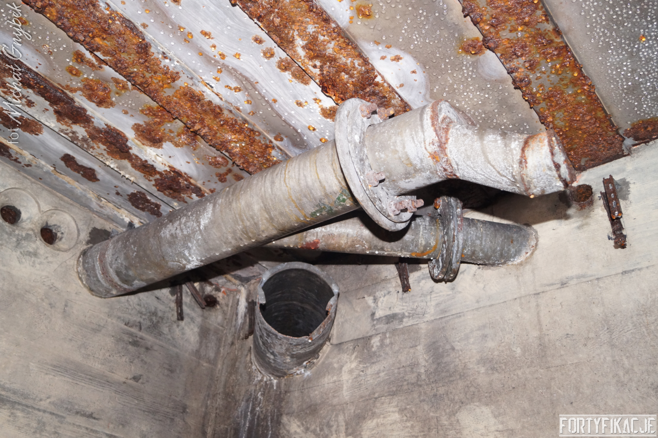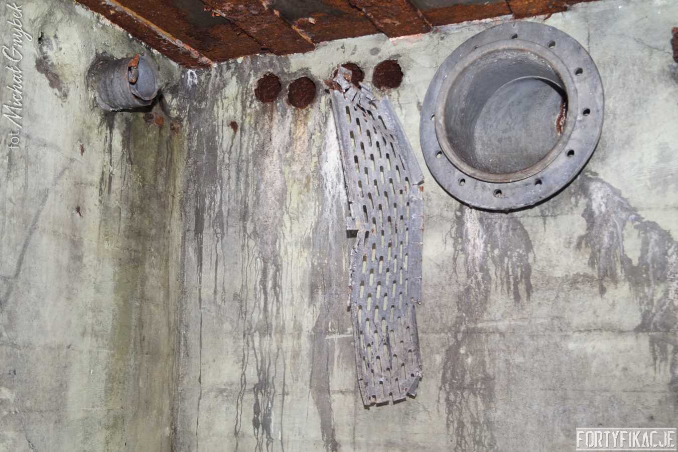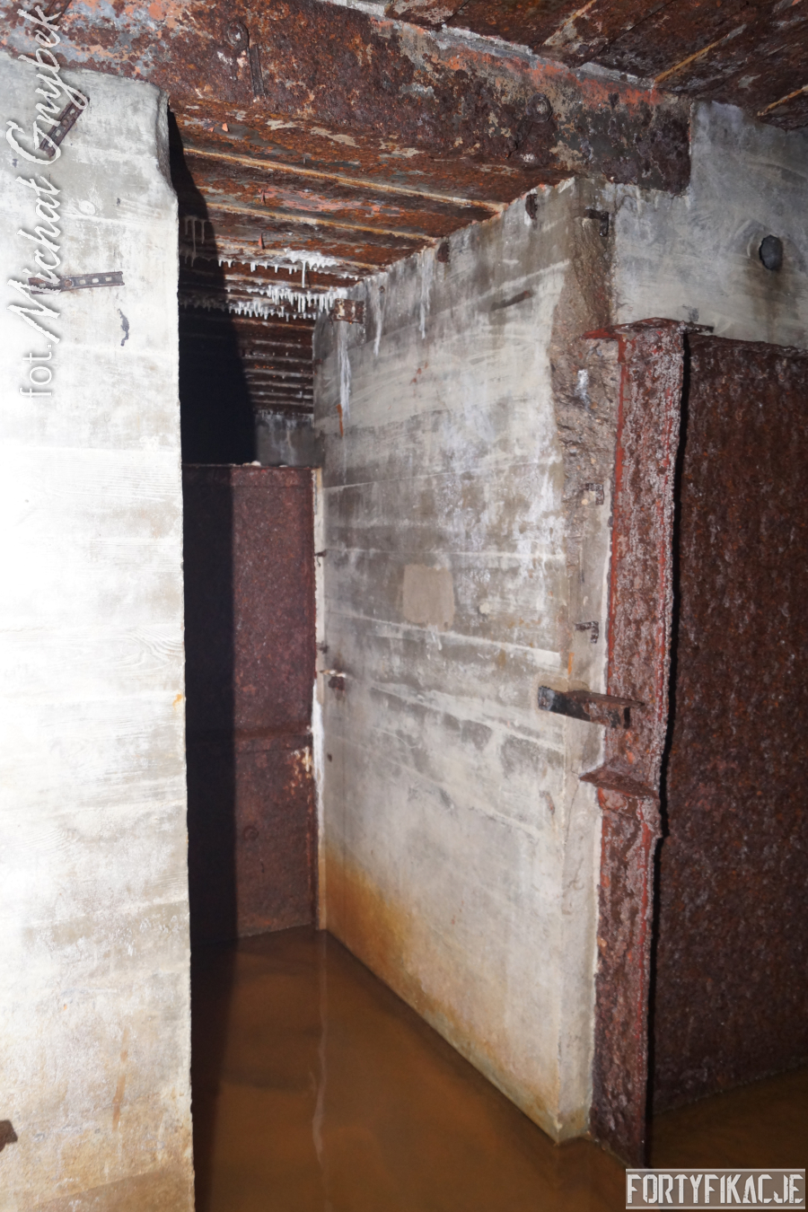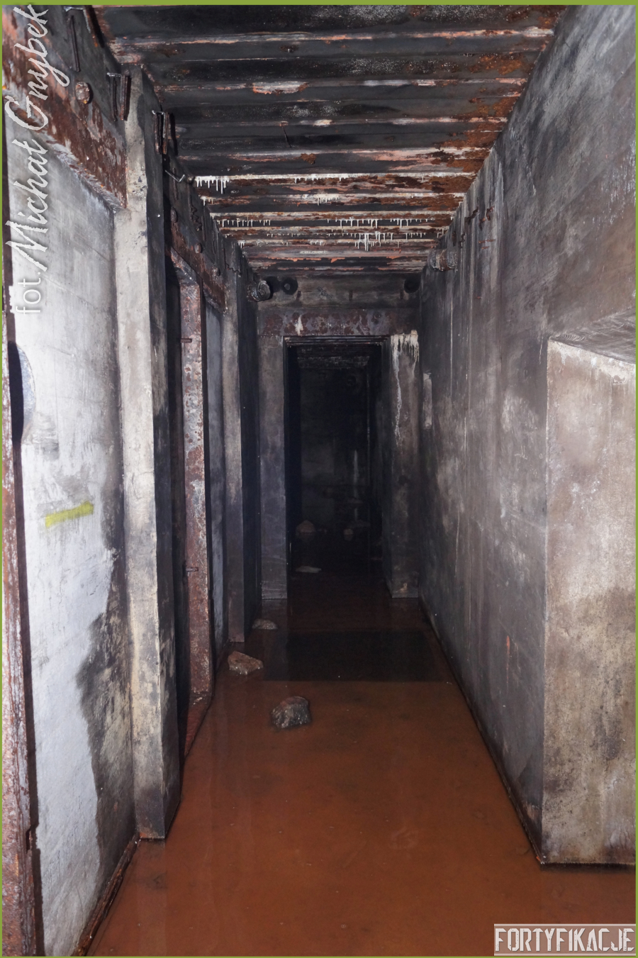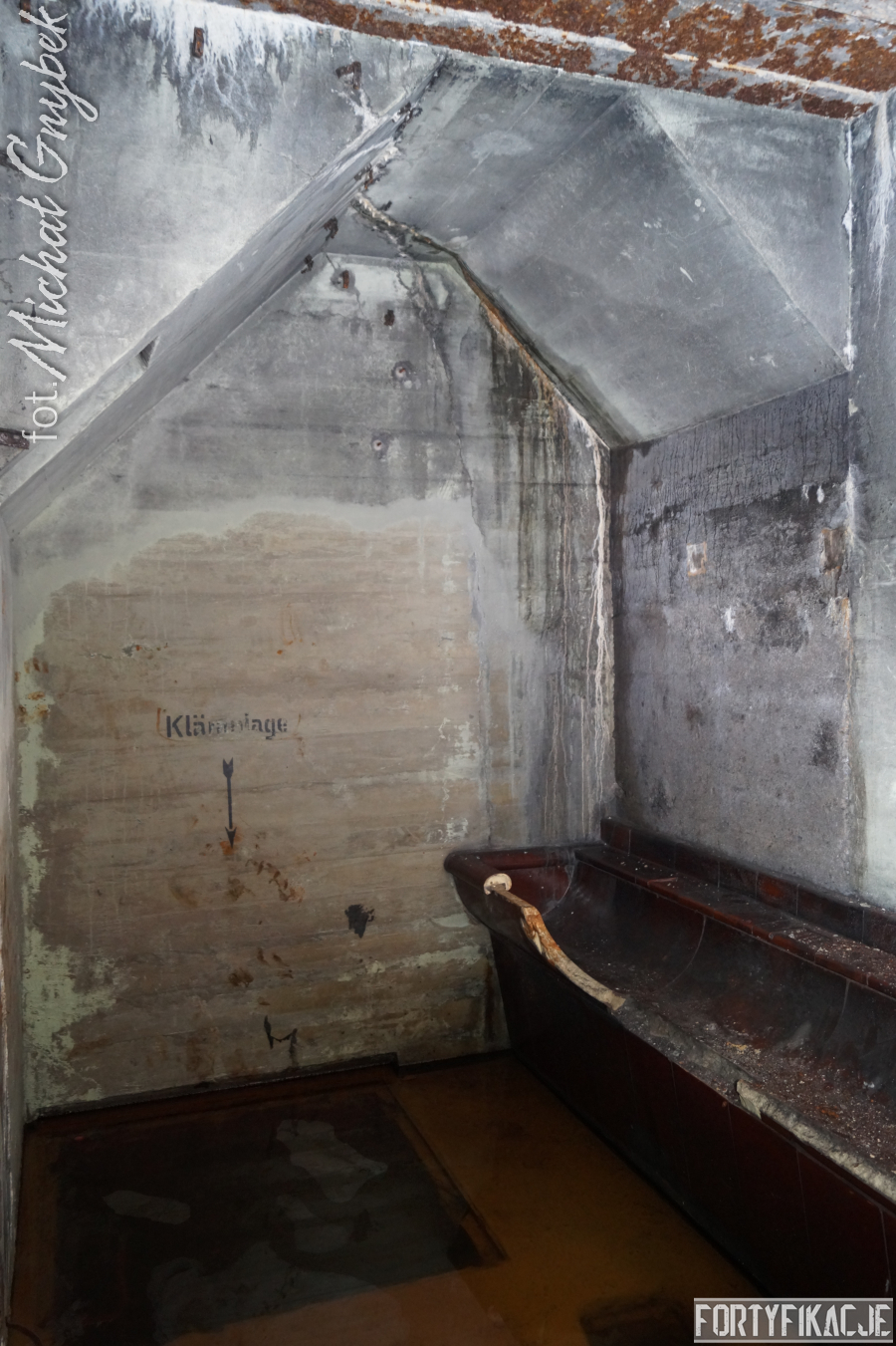 Uwagę w oglądanych pomieszczeniach przyciąga zachowane malowanie. Co ciekawe na ścianach nie zobaczymy praktycznie żadnych napisów eksploatacyjnych... Schron wygląda pod tym względem na nieukończony. Jak ukazują poniższe zdjęcia w rozmaitych izbach zachowały się pojedyncze stalowe elementy, w tym pozostałości dwóch zbiorników na wodę. Na kondygnacji tej znajdziemy stosunkowo dużą liczbę izb załogi. Było ich tu siedem i dawały ukrycie co najmniej 51 żołnierzom! Na szczególną uwagę eksploratora dolnej kondygnacji zasługują pomieszczenia sanitarne. W ich skład wchodziły umywalnie i toalety. W jednym i drugim pomieszczeniu zachowały się ceramiczne elementy wyposażenia: duży pisuar ścienny oraz zlewozmywak.
