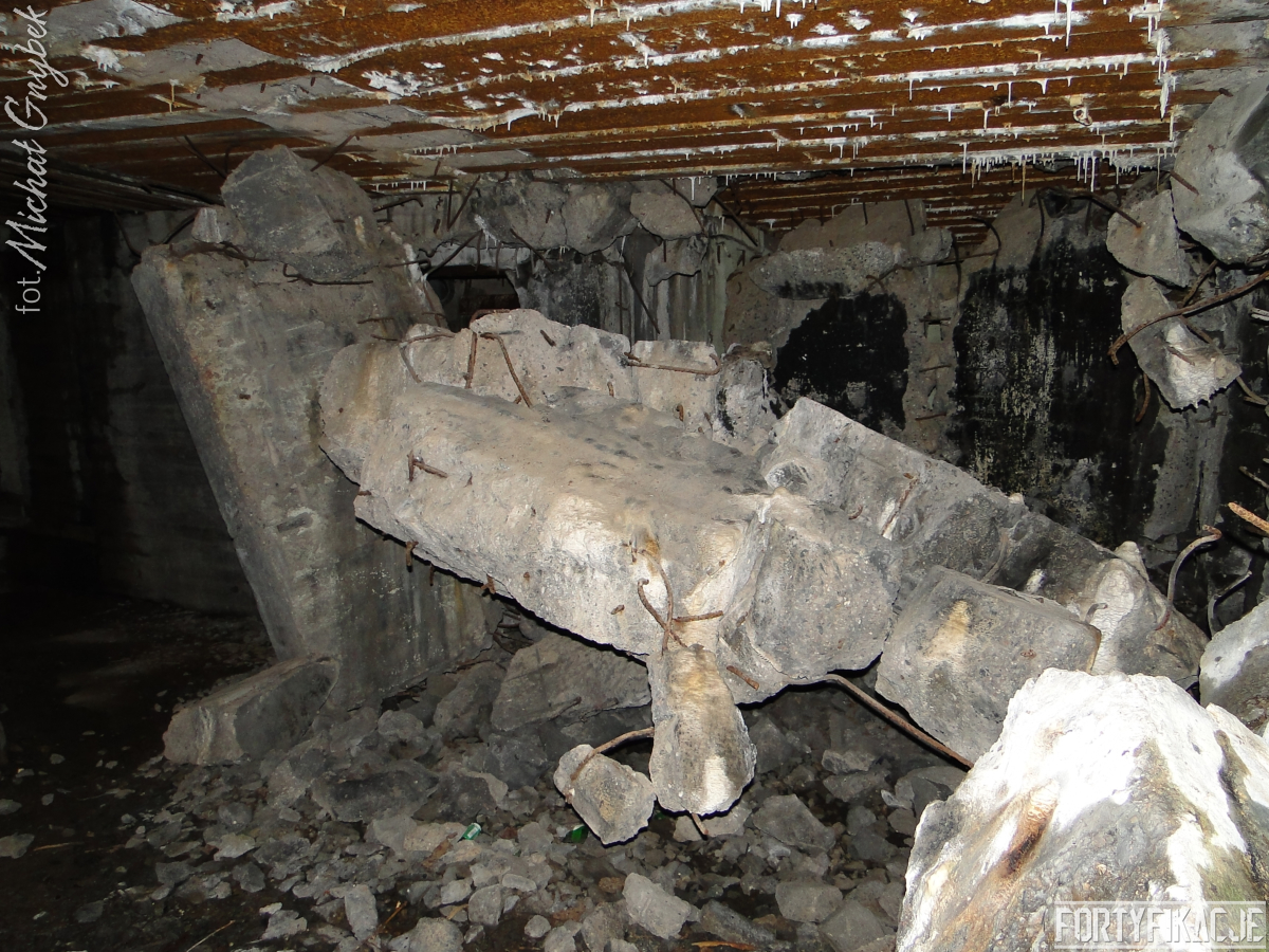 Przyjrzyjmy się zatem kondygnacji górnej: uległa dosyć sporym zniszczeniom. Z tego powodu część pomieszczeń obecnie nie istnieje lub jest niedostępna. Wiele ścian zostało przez eksplozję przemieszczonych lub stoją pod nienaturalnym kątem... Mimo to w wielu zachowanych izbach zachowały się ślady ich pierwotnych funkcji. Moją uwagę przyciągnęły szczególnie pomieszczenia związane z szeroko rozumianym dowodzeniem obiektem i łącznością. Z pewnością są to najlepiej zachowane pomieszczenia górnej kondygnacji.