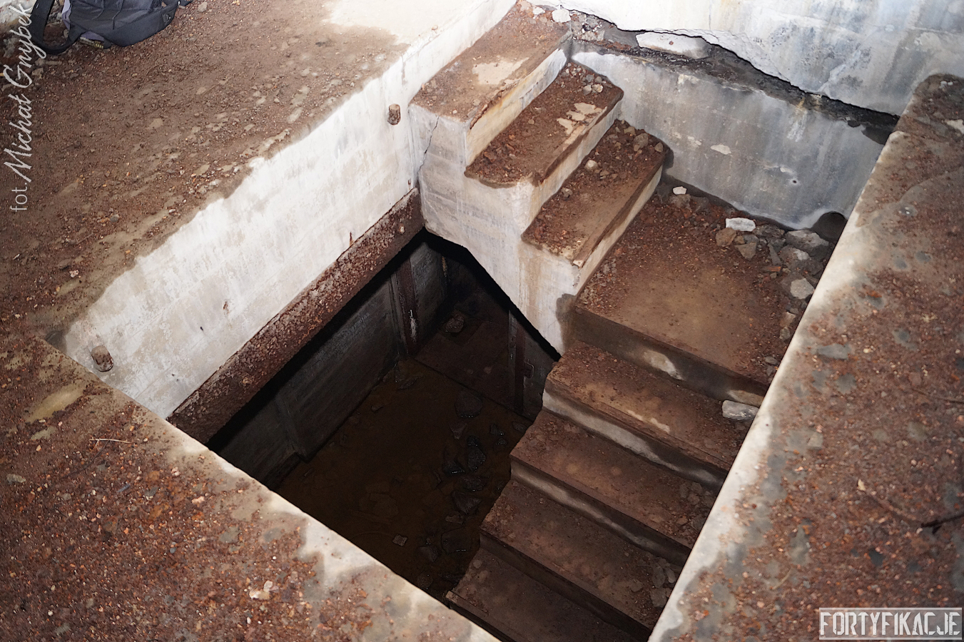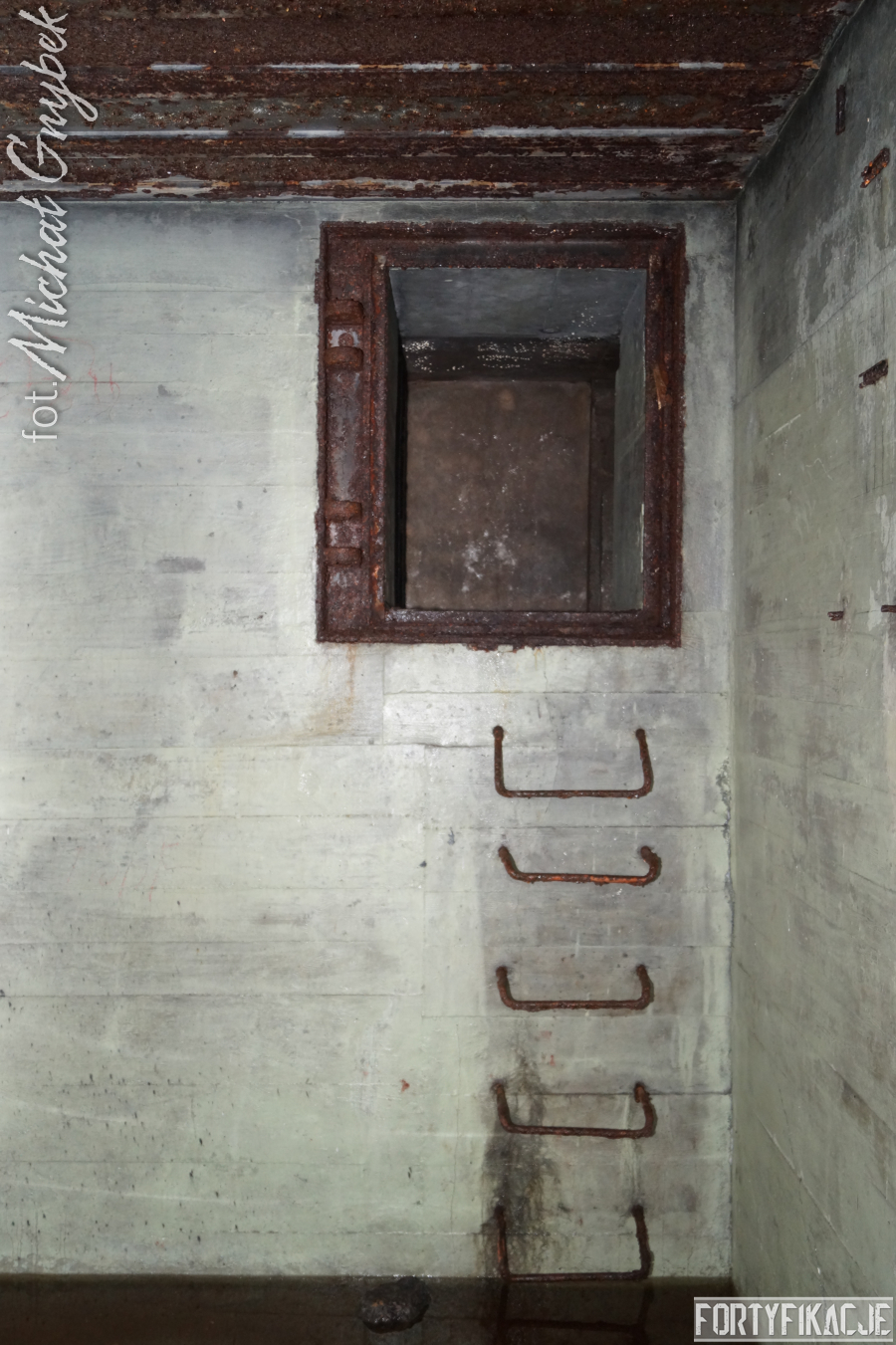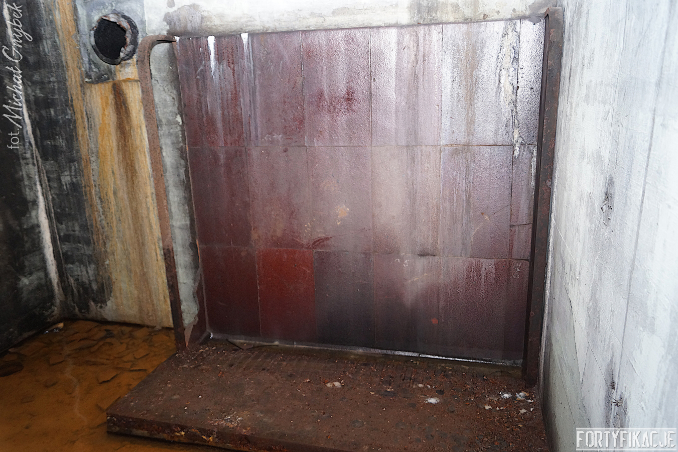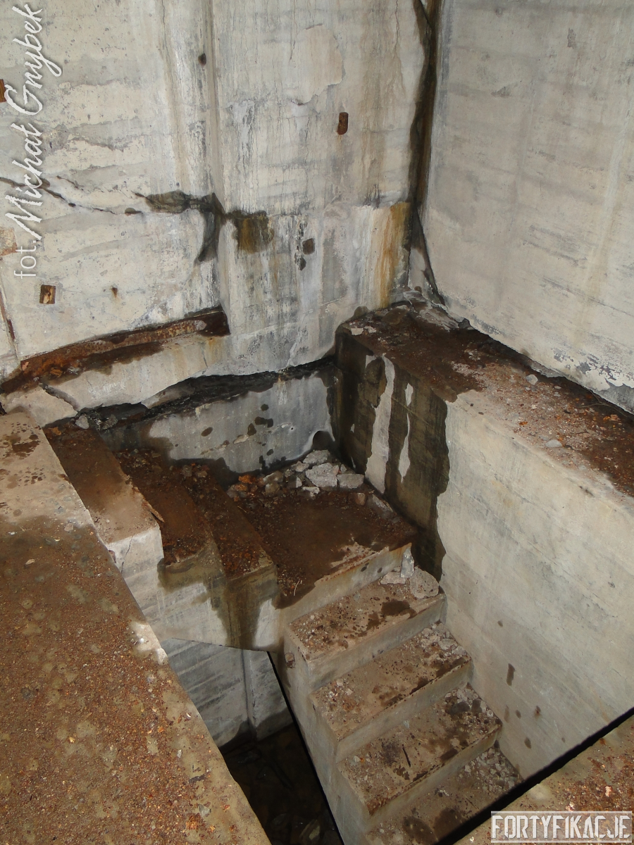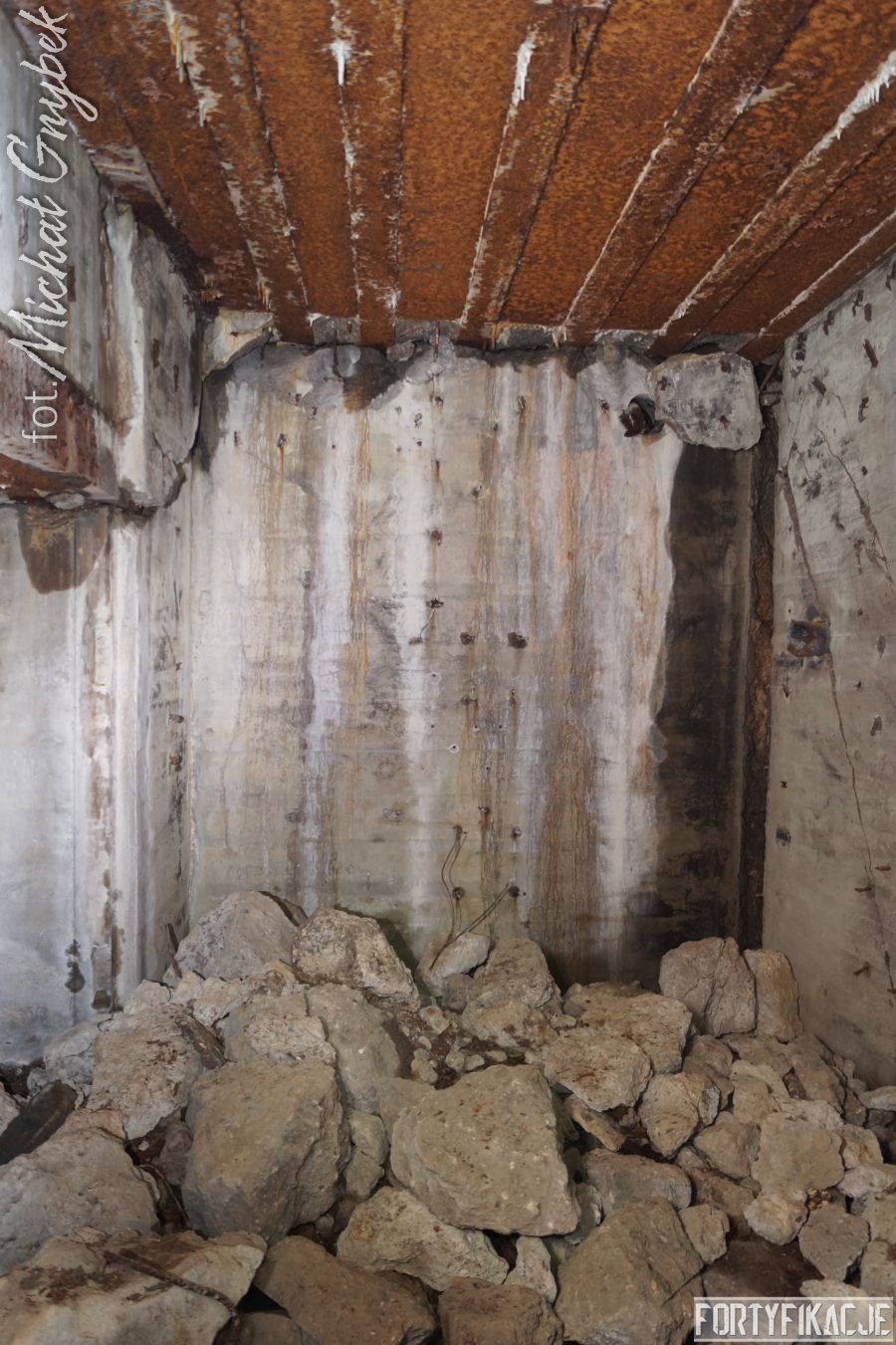 Czas też wyjaśnić skąd asymetria w kształcie pomiędzy górną a dolną kondygnacją. Przy tym warto również zadać kolejne pytanie: jaka była zasadność istnienia w obiekcie tak licznych pomieszczeń załogi? Docelowo B-Werk miał być wzmocniony wieżą lub izbą bojową uzbrojoną w armatę przeciwpancerną, prawdopodobnie kal. 50mm. Gdyby schron w rzeczywistości otrzymał takie uzbrojenie, niewątpliwie potrzebna byłaby wówczas większa załoga. Asymetrię w schronie widać właśnie tam, gdzie miało być ulokowane przejście do planowanej izby bojowej. Niestety planów nie zrealizowano... ![]()
