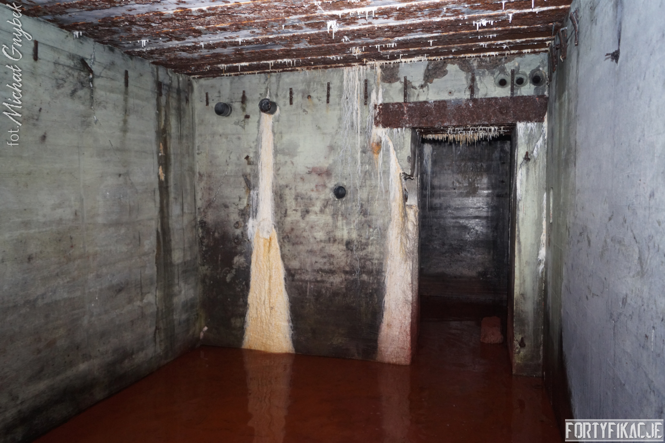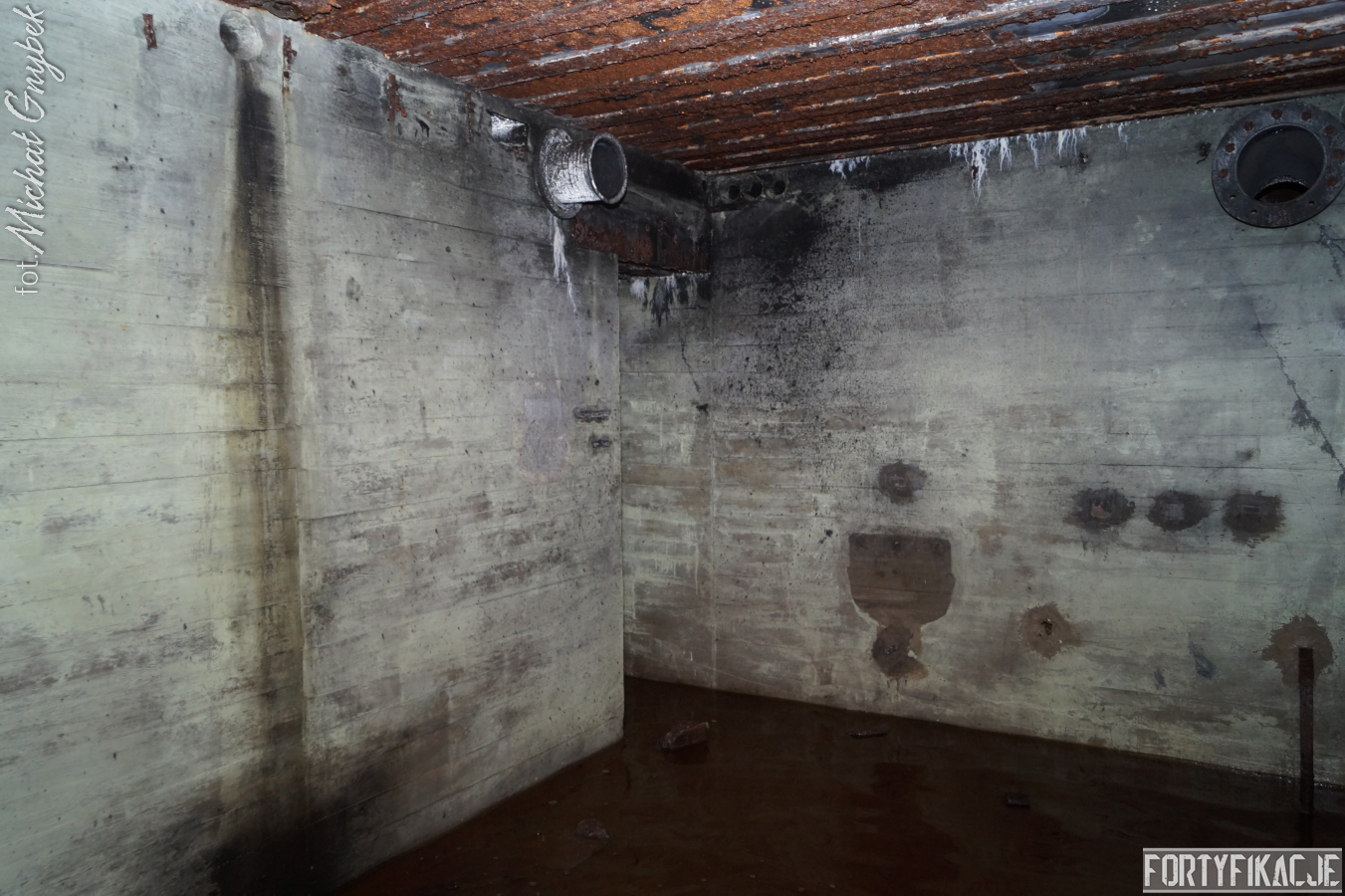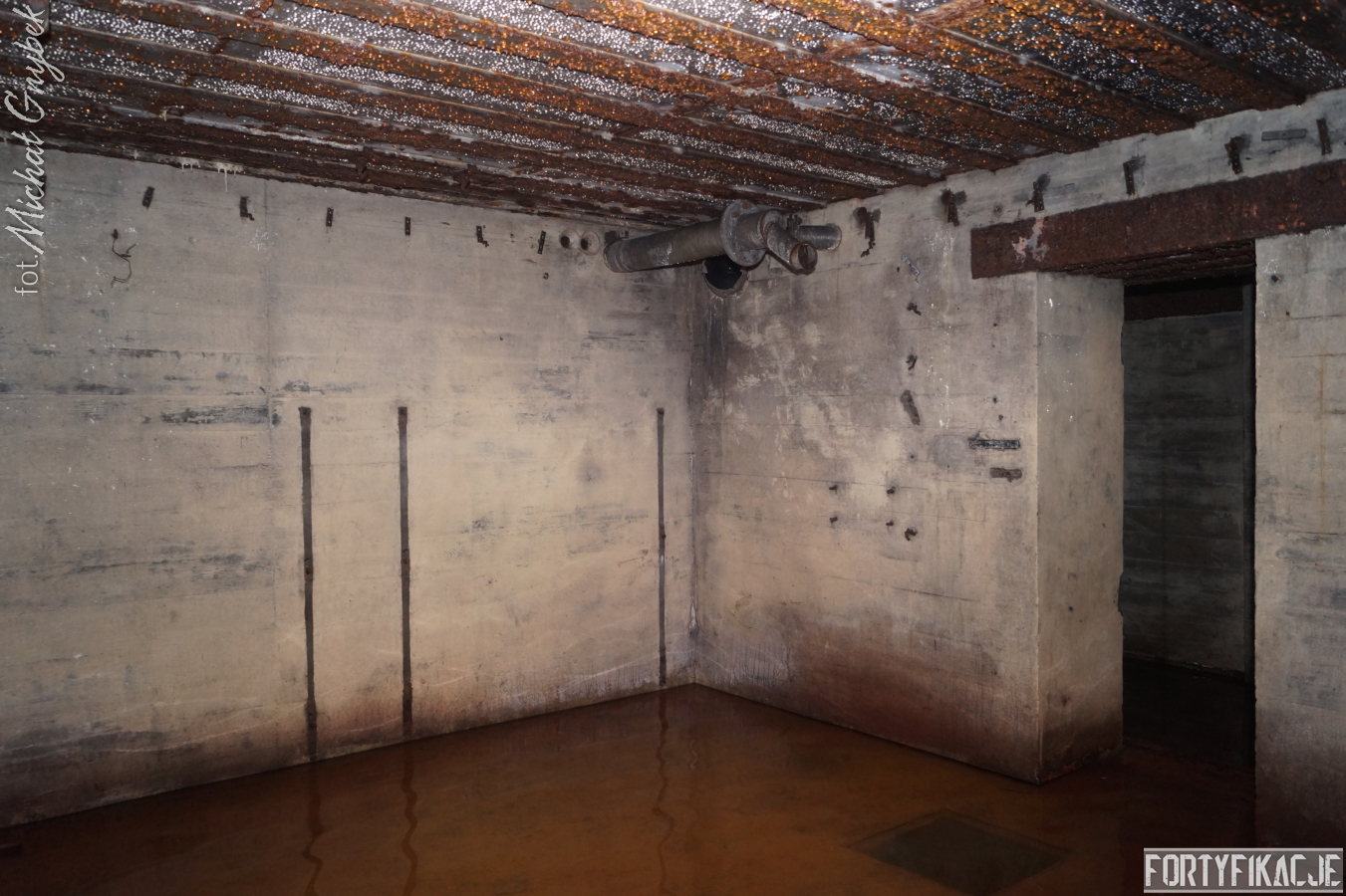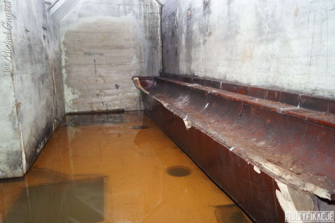Uwagę w oglądanych pomieszczeniach przyciąga zachowane malowanie. Co ciekawe na ścianach nie zobaczymy praktycznie żadnych napisów eksploatacyjnych... Schron wygląda pod tym względem na nieukończony. Jak ukazują poniższe zdjęcia w rozmaitych izbach zachowały się pojedyncze stalowe elementy, w tym pozostałości dwóch zbiorników na wodę. Na kondygnacji tej znajdziemy stosunkowo dużą liczbę izb załogi. Było ich tu siedem i dawały ukrycie co najmniej 51 żołnierzom! Na szczególną uwagę eksploratora dolnej kondygnacji zasługują pomieszczenia sanitarne. W ich skład wchodziły umywalnie i toalety. W jednym i drugim pomieszczeniu zachowały się ceramiczne elementy wyposażenia: duży pisuar ścienny oraz zlewozmywak.