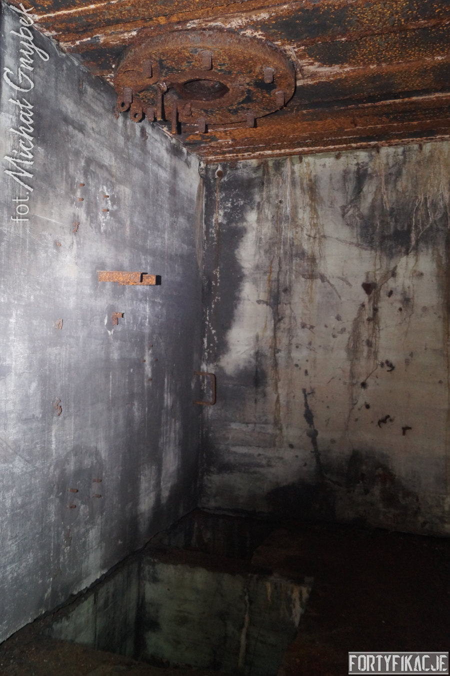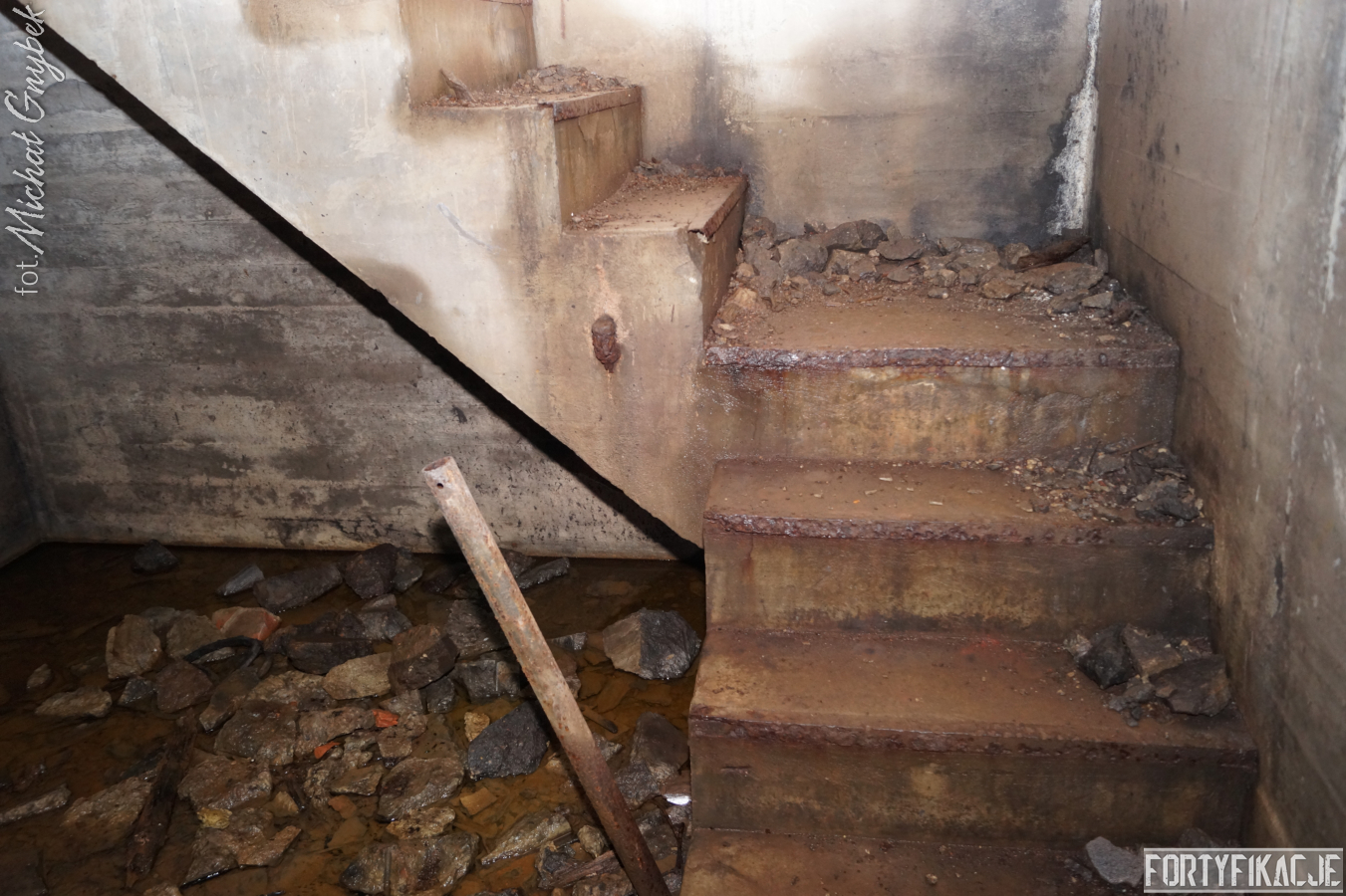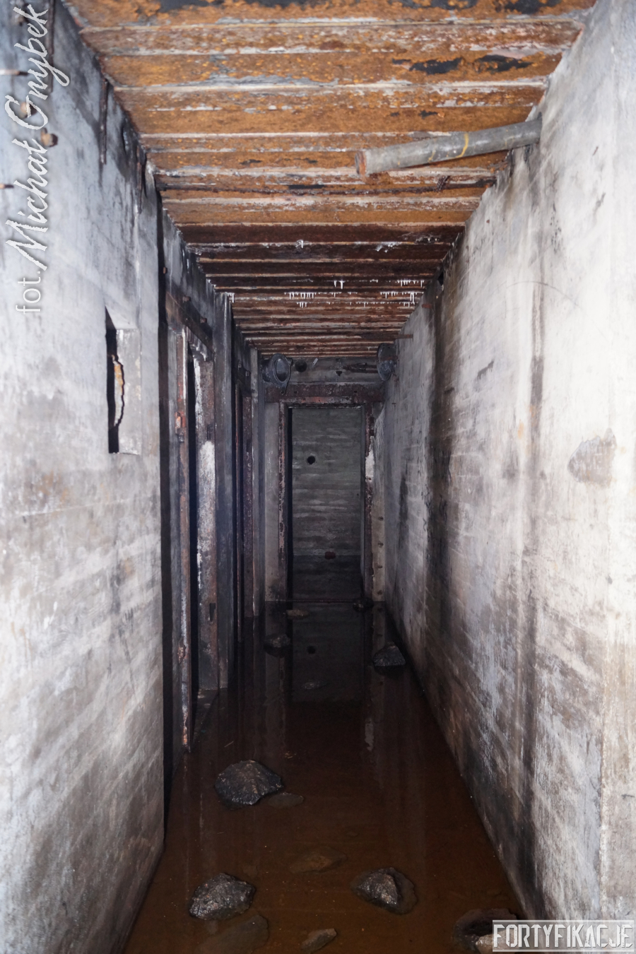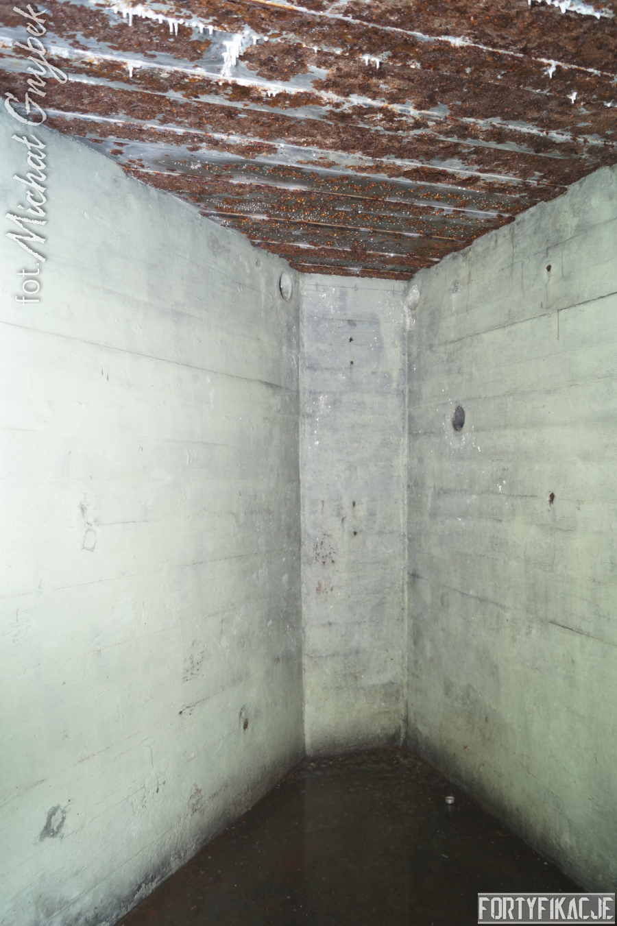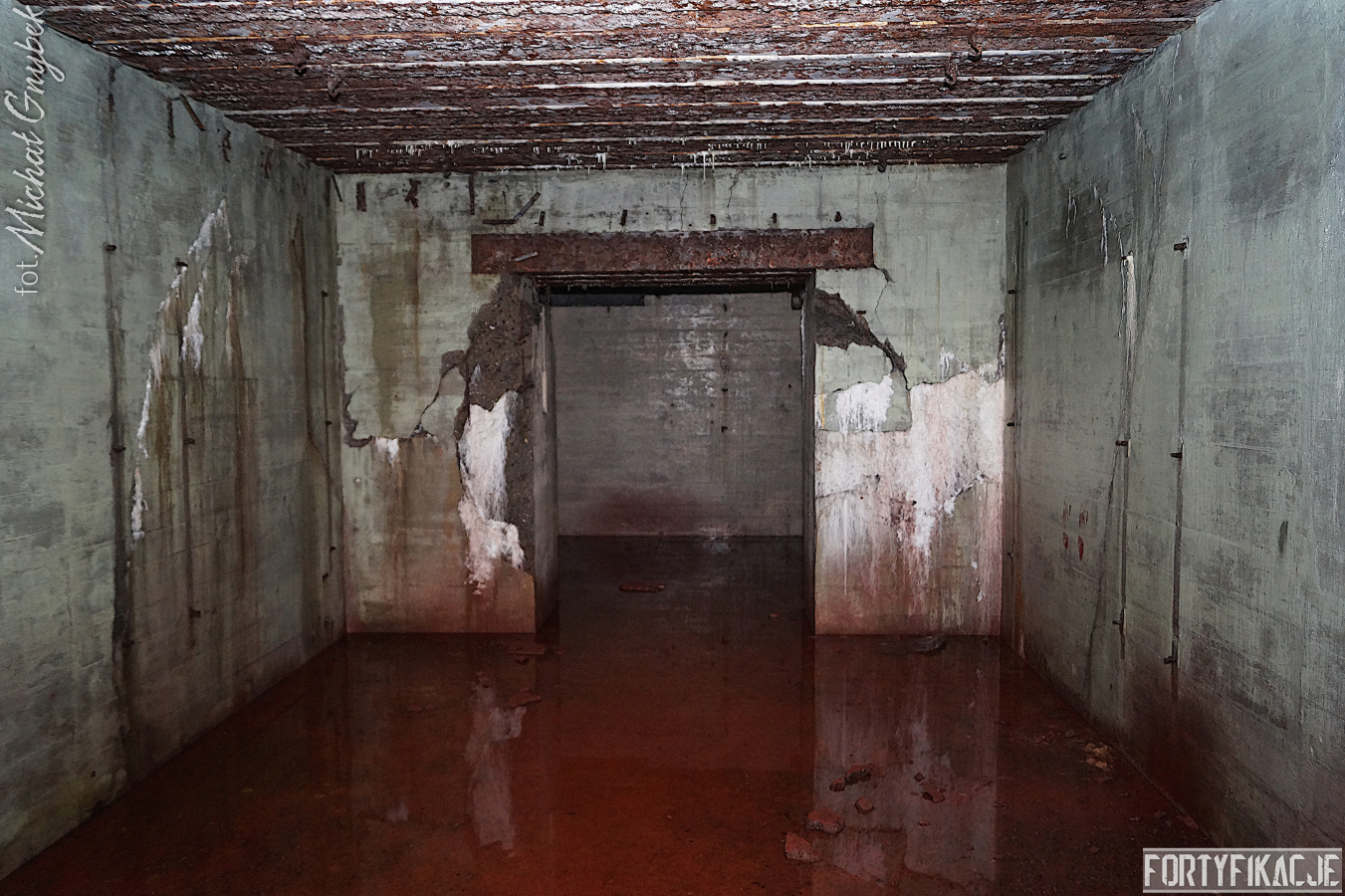 Uwagę w oglądanych pomieszczeniach przyciąga zachowane malowanie. Co ciekawe na ścianach nie zobaczymy praktycznie żadnych napisów eksploatacyjnych... Schron wygląda pod tym względem na nieukończony. Jak ukazują poniższe zdjęcia w rozmaitych izbach zachowały się pojedyncze stalowe elementy, w tym pozostałości dwóch zbiorników na wodę. Na kondygnacji tej znajdziemy stosunkowo dużą liczbę izb załogi. Było ich tu siedem i dawały ukrycie co najmniej 51 żołnierzom! Na szczególną uwagę eksploratora dolnej kondygnacji zasługują pomieszczenia sanitarne. W ich skład wchodziły umywalnie i toalety. W jednym i drugim pomieszczeniu zachowały się ceramiczne elementy wyposażenia: duży pisuar ścienny oraz zlewozmywak.
