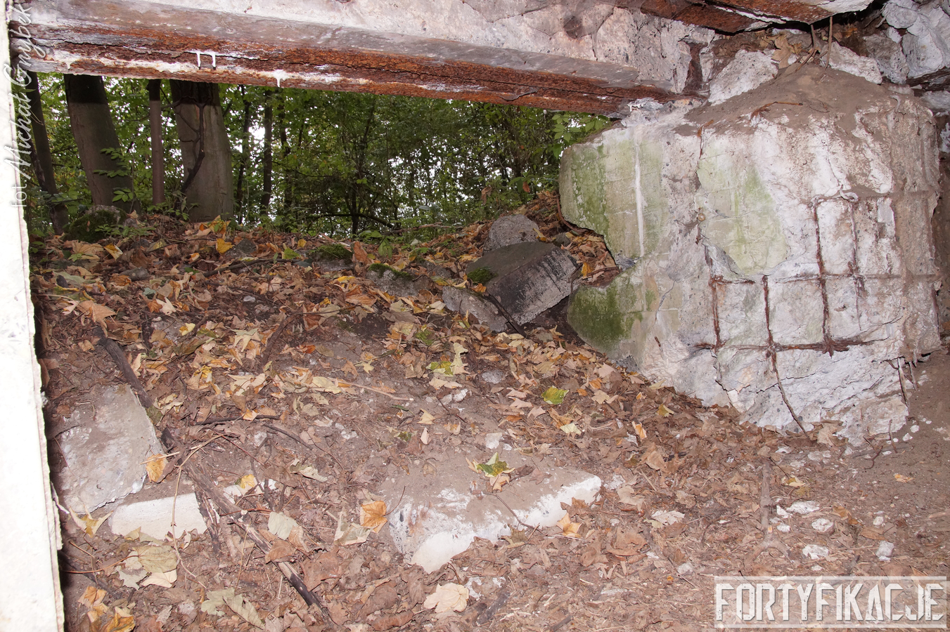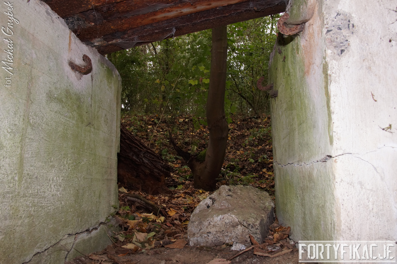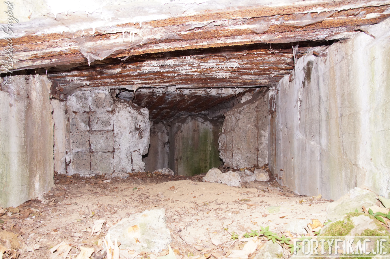 liczbę pomieszczeń: było ich aż cztery! Patrząc na przekrój poziomy schronu (znaleźć możemy go w pracy Krzysztofa Motyla) można odnieść wrażenie, że była to próba połączenia ze sobą dwóch projektów Unterstand für MG mit Schartenplatte (Friedensbau) zawartych w instrukcji Stellungsbau z 1930 roku. Przy czym nie było to zwykłe zlepienie dwóch konstrukcji. Projektanci dostosowali obiekt do warunków terenowych.