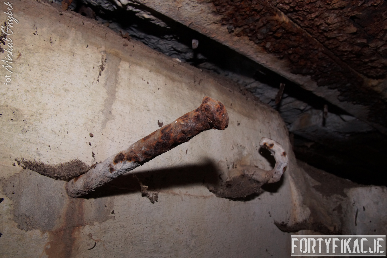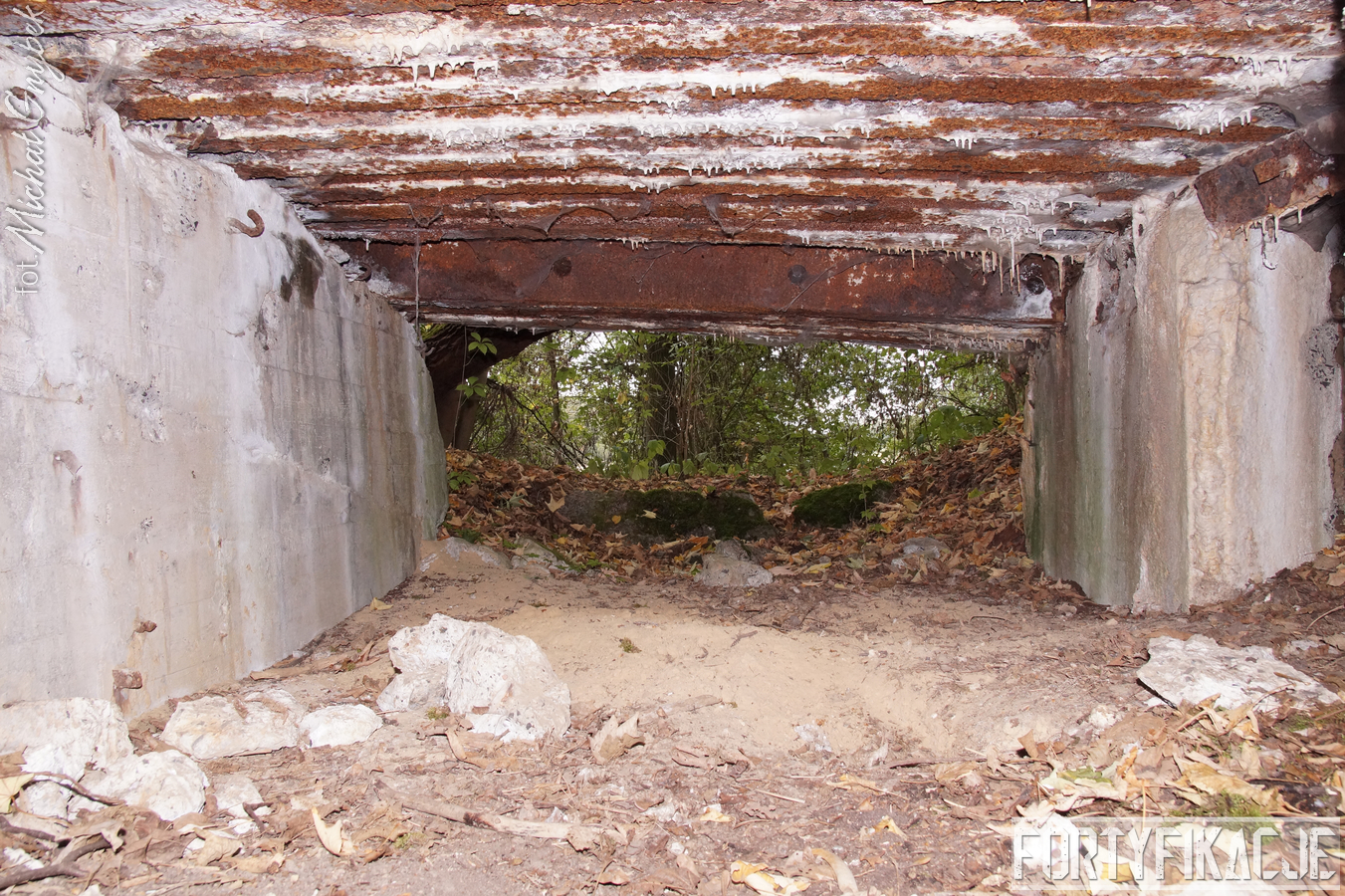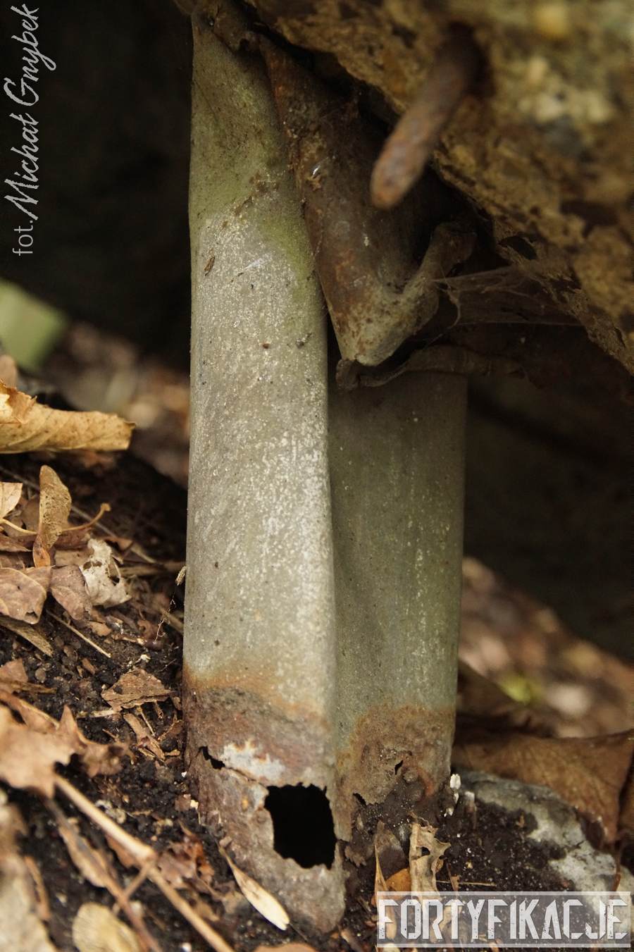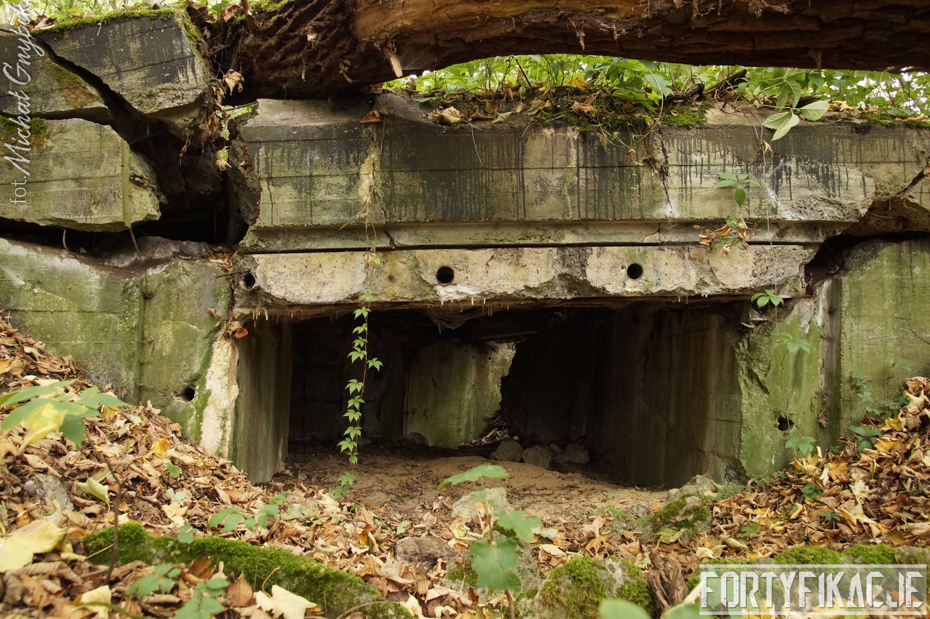 liczbę pomieszczeń: było ich aż cztery! Patrząc na przekrój poziomy schronu (znaleźć możemy go w pracy Krzysztofa Motyla) można odnieść wrażenie, że była to próba połączenia ze sobą dwóch projektów Unterstand für MG mit Schartenplatte (Friedensbau) zawartych w instrukcji Stellungsbau z 1930 roku. Przy czym nie było to zwykłe zlepienie dwóch konstrukcji. Projektanci dostosowali obiekt do warunków terenowych.