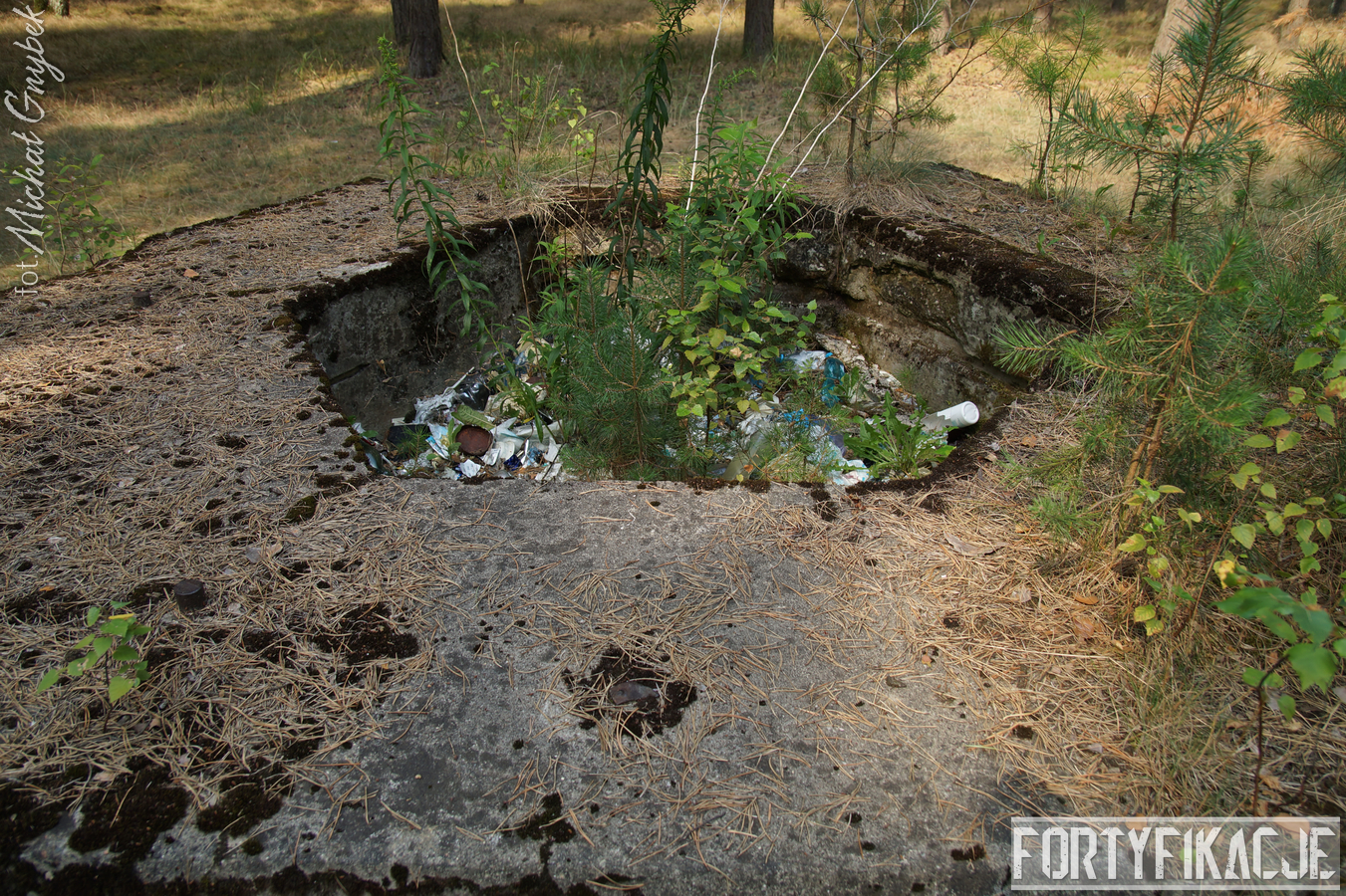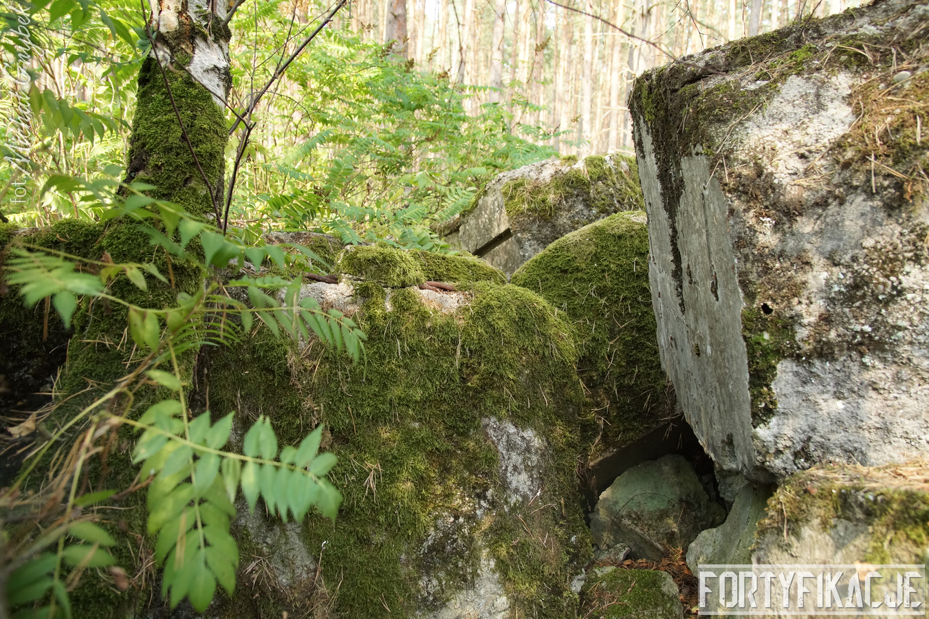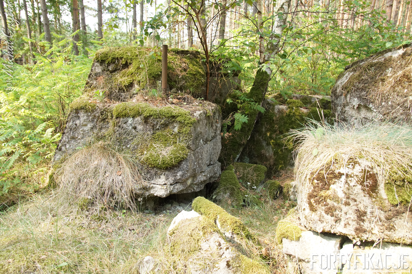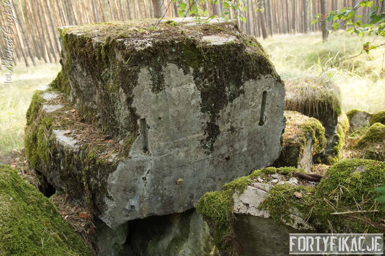 Druga podstawa pod radar śledzący FuMG-65 Würzburg-Riese, mimo że zniszczona, to pod paroma względami wydaje się ciekawsza. Zniszczenia - trudno powiedzieć jaka była ich geneza - odsłoniły ciekawe elementy konstrukcyjne. Zostały odsłonięte kotwy na których osadzona była platforma radaru. Rozłupane kęsy żelbetu odsłaniają również skromne jego zbrojenie składające się ze splecionych ze sobą dwóch prętów.