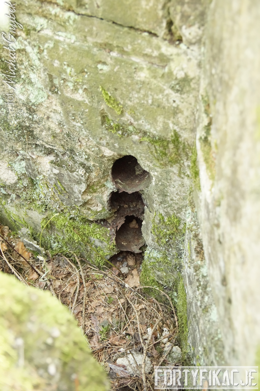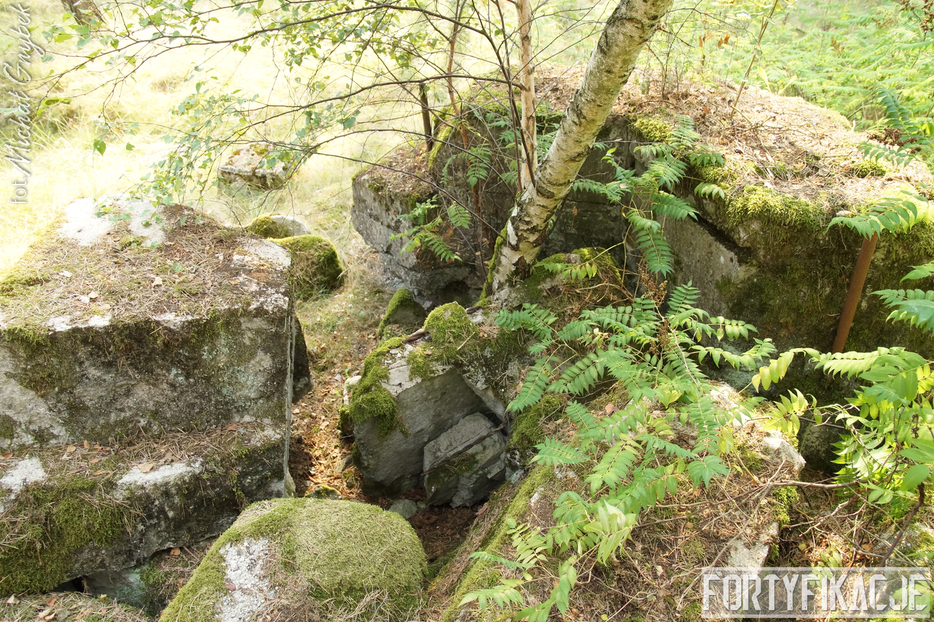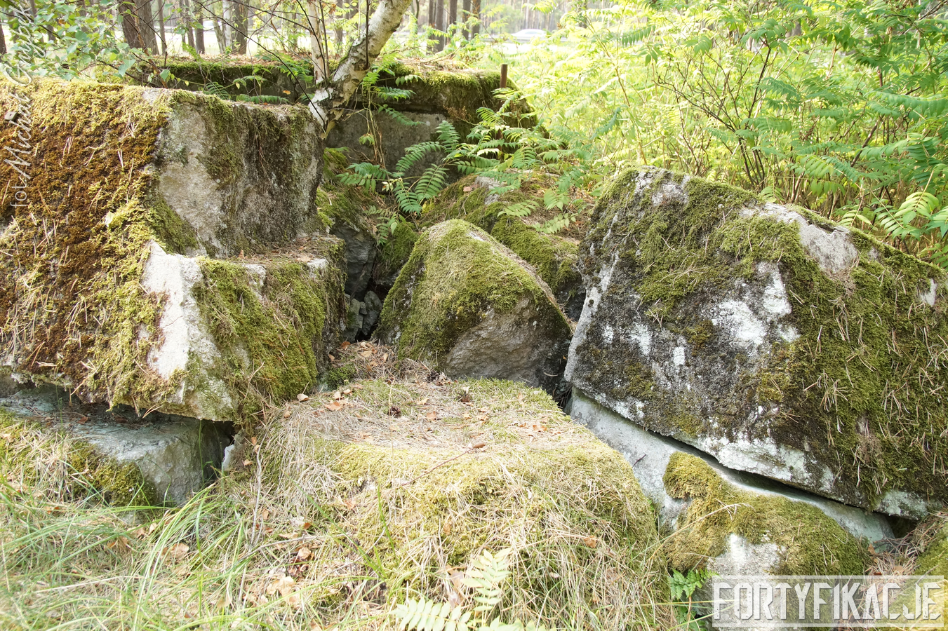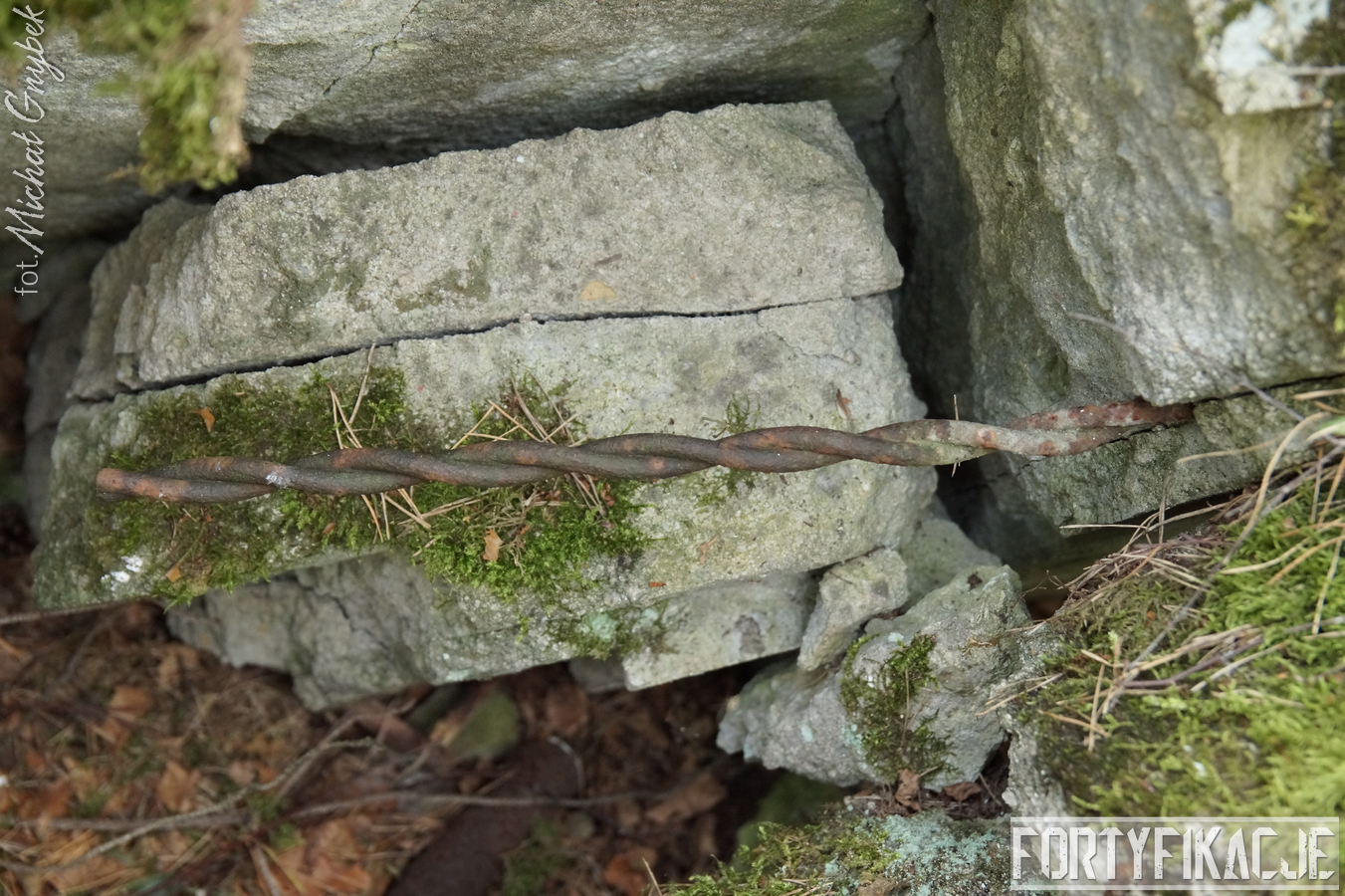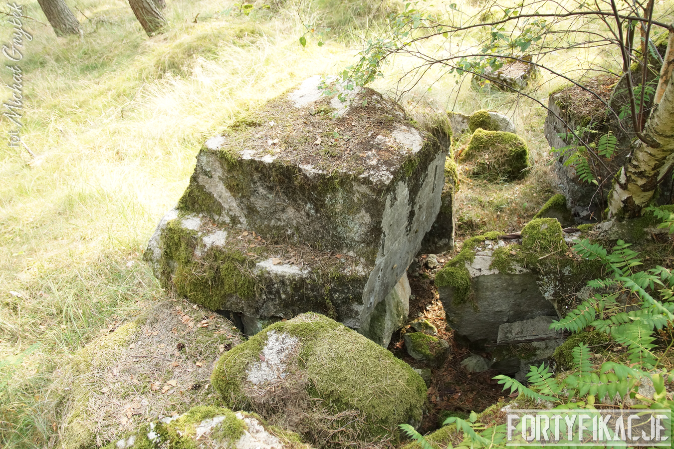 Druga podstawa pod radar śledzący FuMG-65 Würzburg-Riese, mimo że zniszczona, to pod paroma względami wydaje się ciekawsza. Zniszczenia - trudno powiedzieć jaka była ich geneza - odsłoniły ciekawe elementy konstrukcyjne. Zostały odsłonięte kotwy na których osadzona była platforma radaru. Rozłupane kęsy żelbetu odsłaniają również skromne jego zbrojenie składające się ze splecionych ze sobą dwóch prętów.