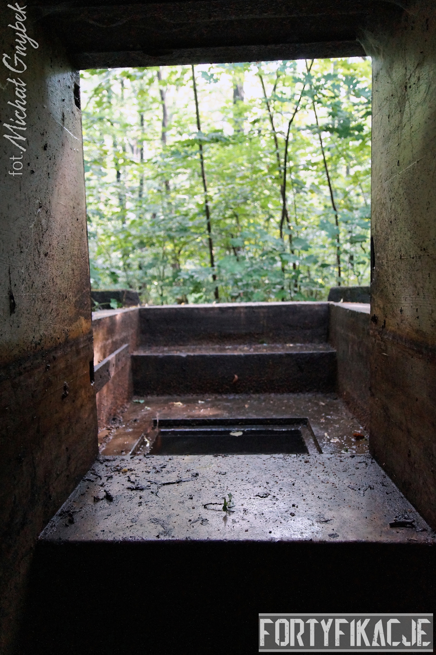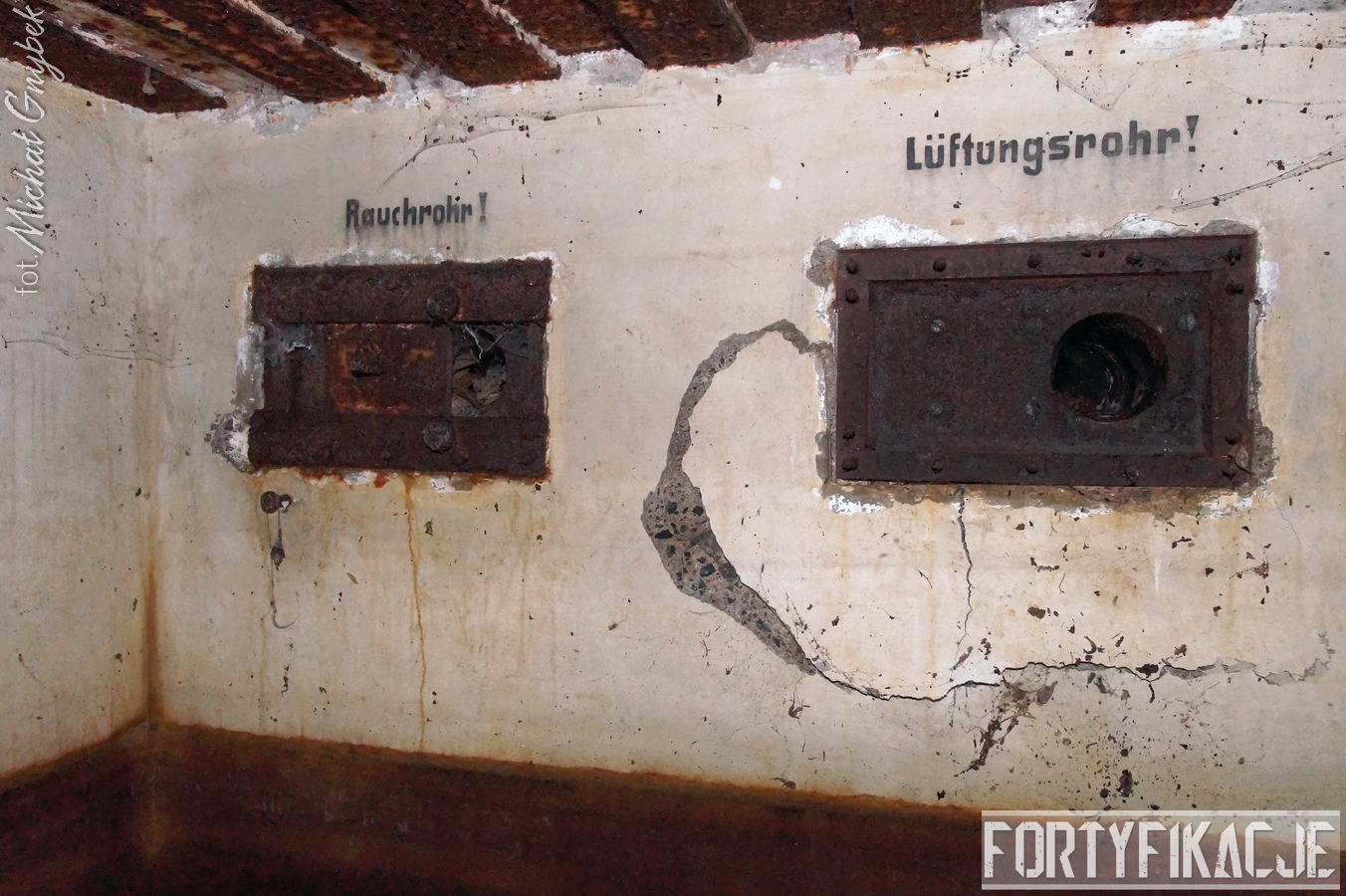 Układ pomieszczeń schronu zgodny był z wymaganiami zawartymi w instrukcji „Budowa pozycji obronnej” (niem. Stellungsbau) opublikowanej 4 sierpnia 1930 roku. A precyzując - z jednym z projektów w niej zawartych - żelbetonowym stanowiskiem bojowym dla karabinu maszynowego, chronionym płytą ze strzelnicą (niem. Unterstand für ein M.G. mit Schartenplatte). Obiekt posiadał standardowo dwa pomieszczenia. Przedsionek pełnił rolę śluzy gazoszczelnej oraz magazynową. Brak tu elementów systemu wentylacyjnego. Przedsionek od izby bojowej oddzielony był dwojgiem drzwi: ciężkimi stalowymi dwudzielnymi oraz gazoszczelnymi. Pomieszczenie bojowe posiadało niewielkie rozmiary. Podporządkowane było przede wszystkim roli bojowej. Stanowisko bojowe chronione było płytą stalową o szerokości 240, wysokości 180 i grubości 10 cm. Płyta zamocowana była do stropu (stąd jego charakterystyczne obniżenie) oraz do żelbetowej ławy, której nadano kształt litery "T". Na ławie zamontowany był stolik z podstawą forteczną dla km sMG 08. Załodze zapewniono wymianę powietrza. Nie był to system doskonały: powietrze było wtłaczane poprzez przewód wentylacyjny (Lüftungsrohr), prawdopodobnie wspomagany przez filtrowentylator. Natomiast zanieczyszczone powietrze uchodzić miało przez otwór strzelniczy. Rozwiązanie takie mocno ograniczało możliwości bojowe schronu i stwarzało zagrożenie dla zdrowia i życia załogi! W opisywanym schronie istniała możliwość zastosowania piecyka - wskazuje na to umiejscowienie w ścianie przewodu kominowego (Rauchrohr). Zadbano również o kontakt ze światem zewnętrznym. Załoga posiadała telefon - wskazują na to kable telefoniczne.
