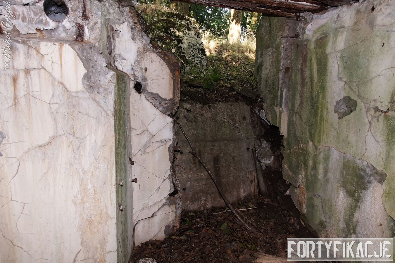Stand składał się - podobnie jak jego odpowiednicy z "kazamatą pancerną", wzniesieni w 1932 roku - z trzech pomieszczeń. Była to śluza gazowa, izba wypoczynku oraz pomieszczenie bojowe. Śluza gazowa nie była połączona z systemem wentylacji. Uwagę zwraca forma schodni, która w przekroju poziomym została ukształtowana pod kątem wobec płaszczyzny otworu wejściowego**. Izba wypoczynku posiadała prosty system wentylacyjny. "Pikanterii" pomieszczeniu nadaje fakt umieszczenia w nim wyjścia ewakuacyjnego, co w 1932 roku nie było powszechnym rozwiązaniem. Ponadto zostało ono umieszczone w ścianie bocznej schronu! Było to wyjście ewakuacyjne starego typu. Zostało częściowo zniszczone, co ukazało jego nieskomplikowaną konstrukcję. Pomiędzy izbą wypoczynku a bojową zamieszczono śluzę. Jej pokonanie nie należało do najłatwiejszych: prócz pary drzwi należało pokonać pochyloną pod niewielkim kontem ściankę, wspinaczkę miały ułatwiać stalowe klamry. Izba bojowa posiadała standardową formę. Było to pomieszczenie o wymiarach 200x200 [cm] i wysokości 190 cm. Pionowa (frontowa) płyta stalowa posiadała wzmocnienie w postaci żelbetowej ławy w kształcie litery "T". Uzbrojenie stanowił standardowo sMG 08.