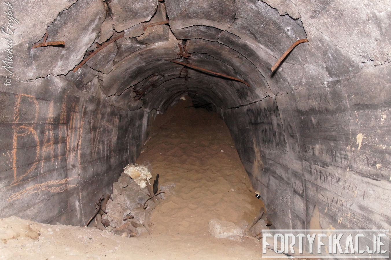 | Poterna. Widok w stronę Pz. W. 864 i drugiego zawału. Przeciskającego się przez zwały gruzu czeka tu kilkanaście metrów prawdziwej i niebezpiecznej mordęgi. |