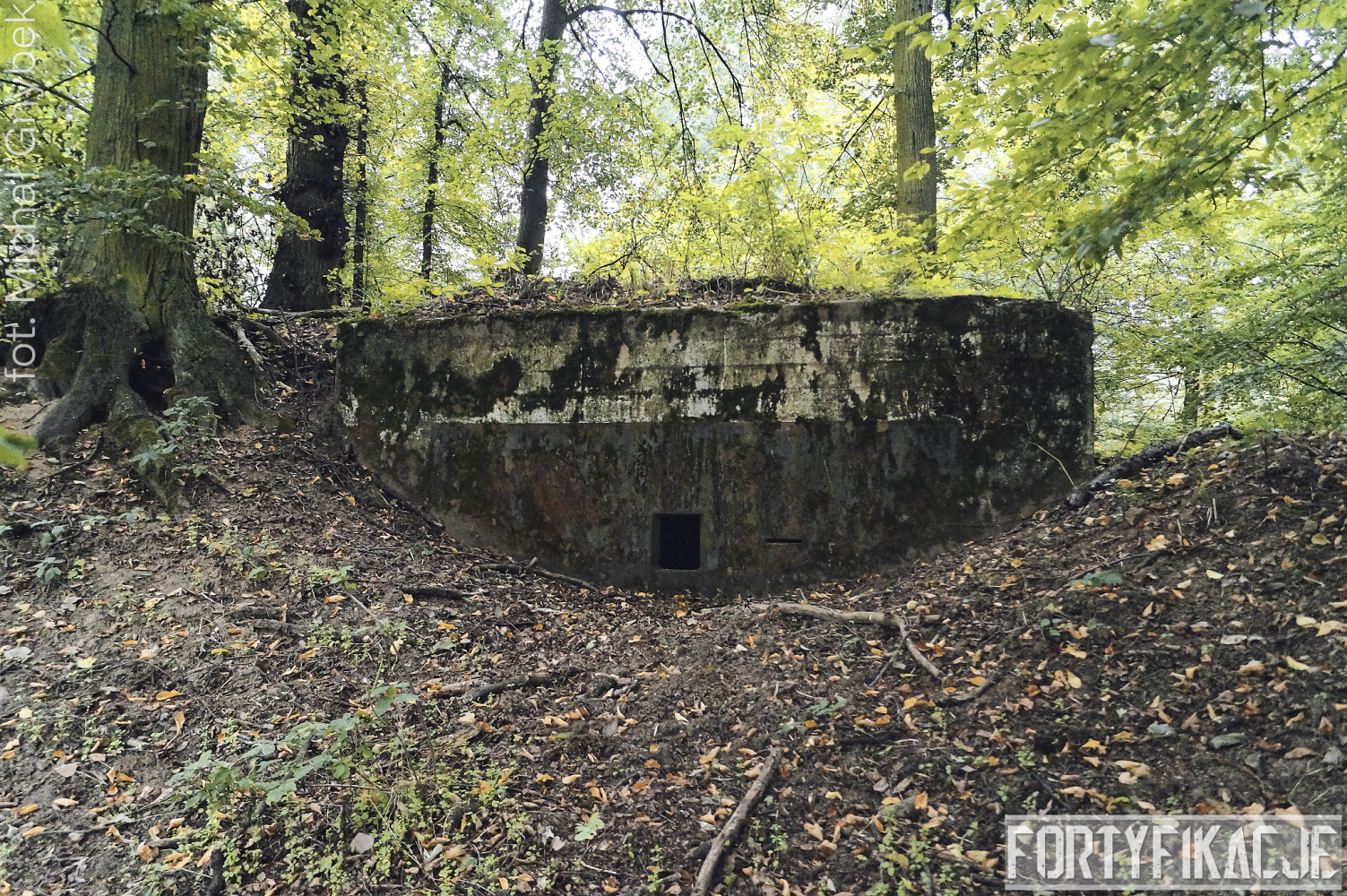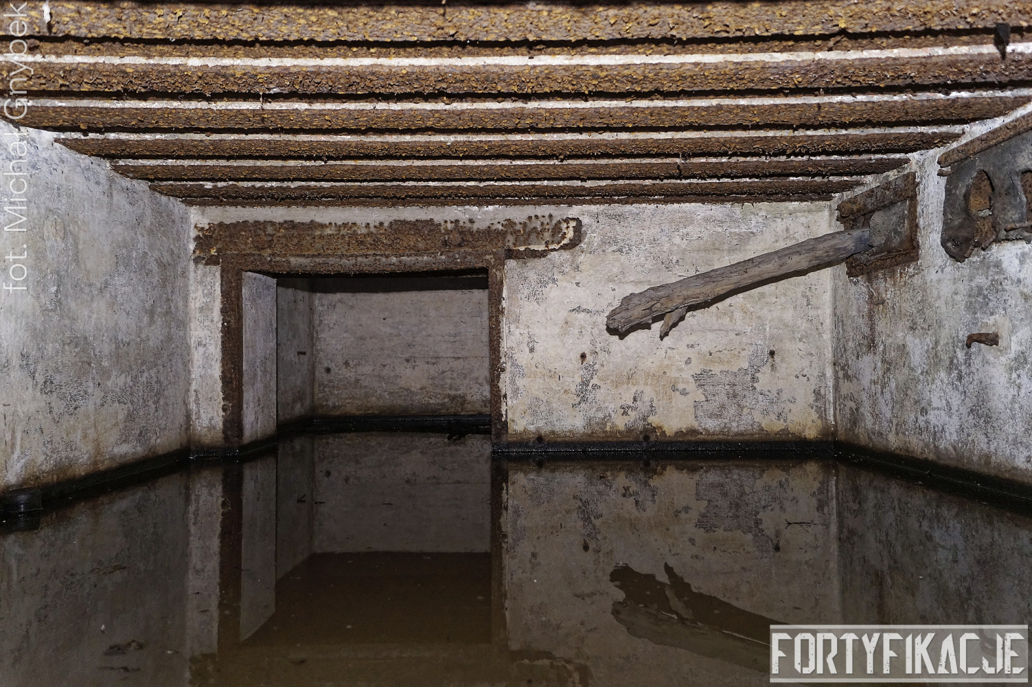 Aż trudno uwierzyć, że kolejne pomieszczenie pełniło kilka funkcji! Oczywiście najważniejszą była rola bojowa. Na żelbetowym cokole w kształcie litery "T" umieszczony był stolik, a na nim karabin maszynowy MG 08. W schronie zastosowano klasyczną w wówczas płytę pancerną o grubości 8 cm. Warto zwrócić uwagę na jej montaż: w stropie znajduje się szczelina, w której widoczne są końcówki szpil z nakrętkami. Ślady na ścianach wskazują, że do swej dyspozycji załoga miała telefon. Oprócz boju, żołnierze mogli tu także wypocząć - korzystając z podczepianych do stropu hamaków. Pomieszczenie było wentylowane oraz - dzięki odpowiedniemu zaworowi - mógł być tu zainstalowany piec.