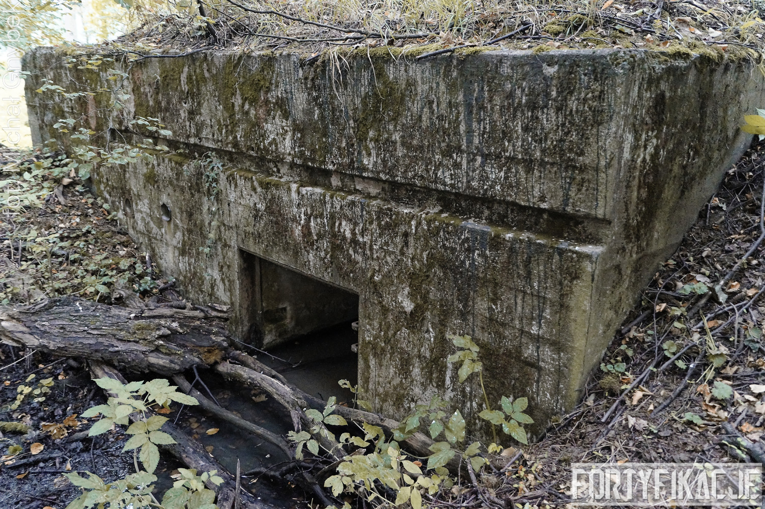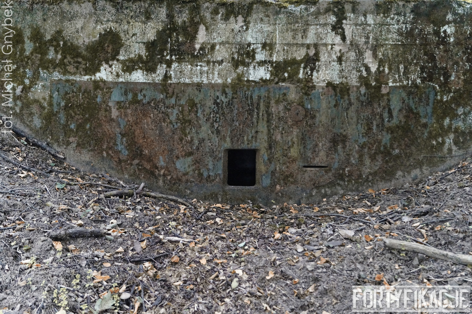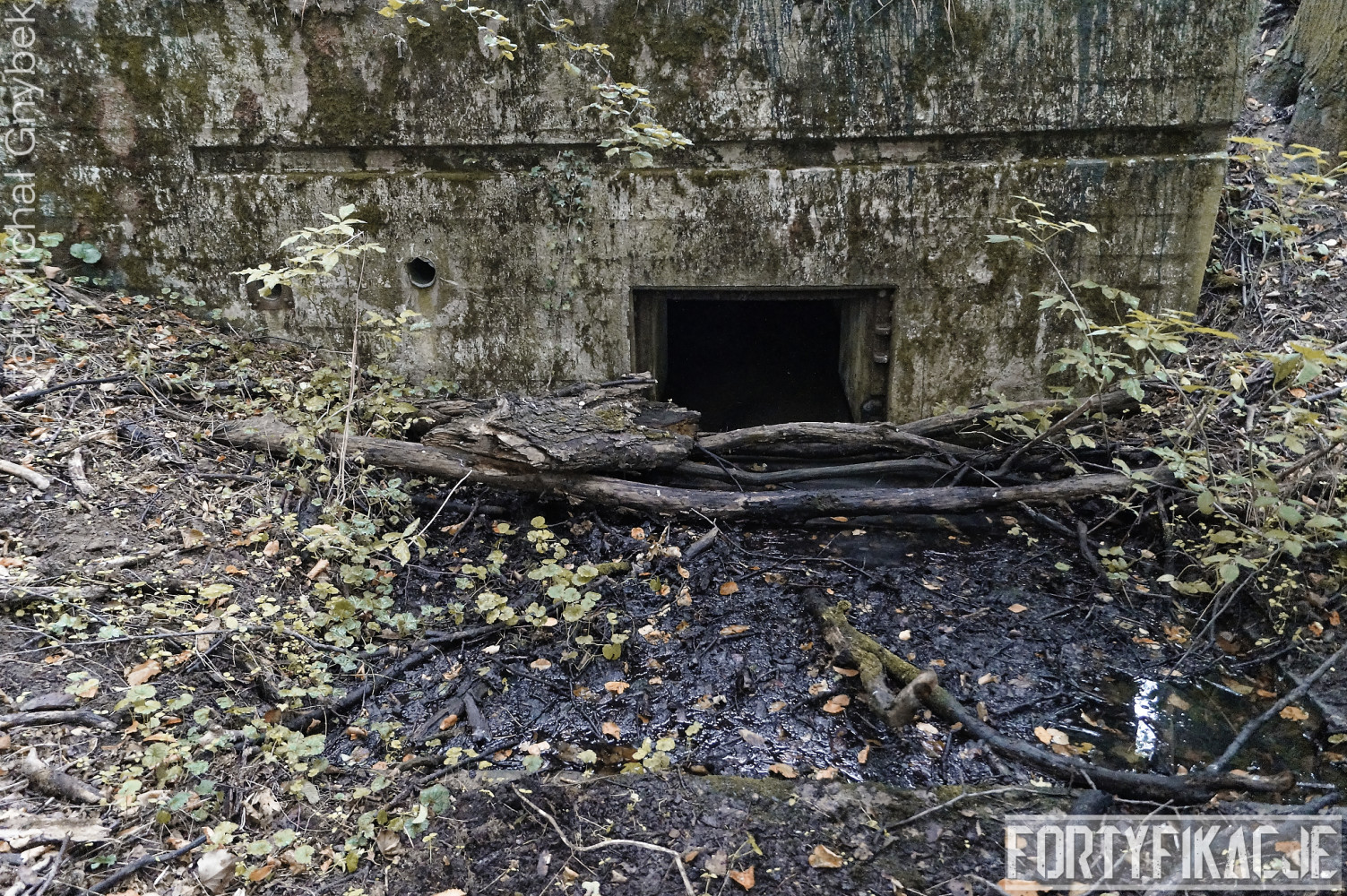 Do schronu prowadziły stalowe drzwi z wyłazem lub bez. przed zalaniem obiekt chroniła żelbetowa schodnia. Obecnie jest ona całkowicie zalana rzadkim błotem, w którym poruszanie się jest niezwykle trudne. Trudno orzec jaką głębokość dokładnie miała schodnia, ale podczas wchodzenia do schronu błoto sięgało mi na wysokość pasa. Dodatkową przeszkodą są pływające w błocie spróchniałe kłody...