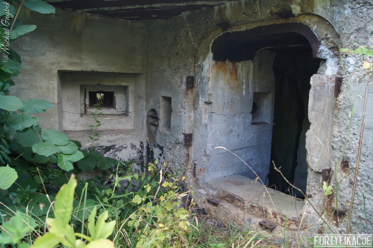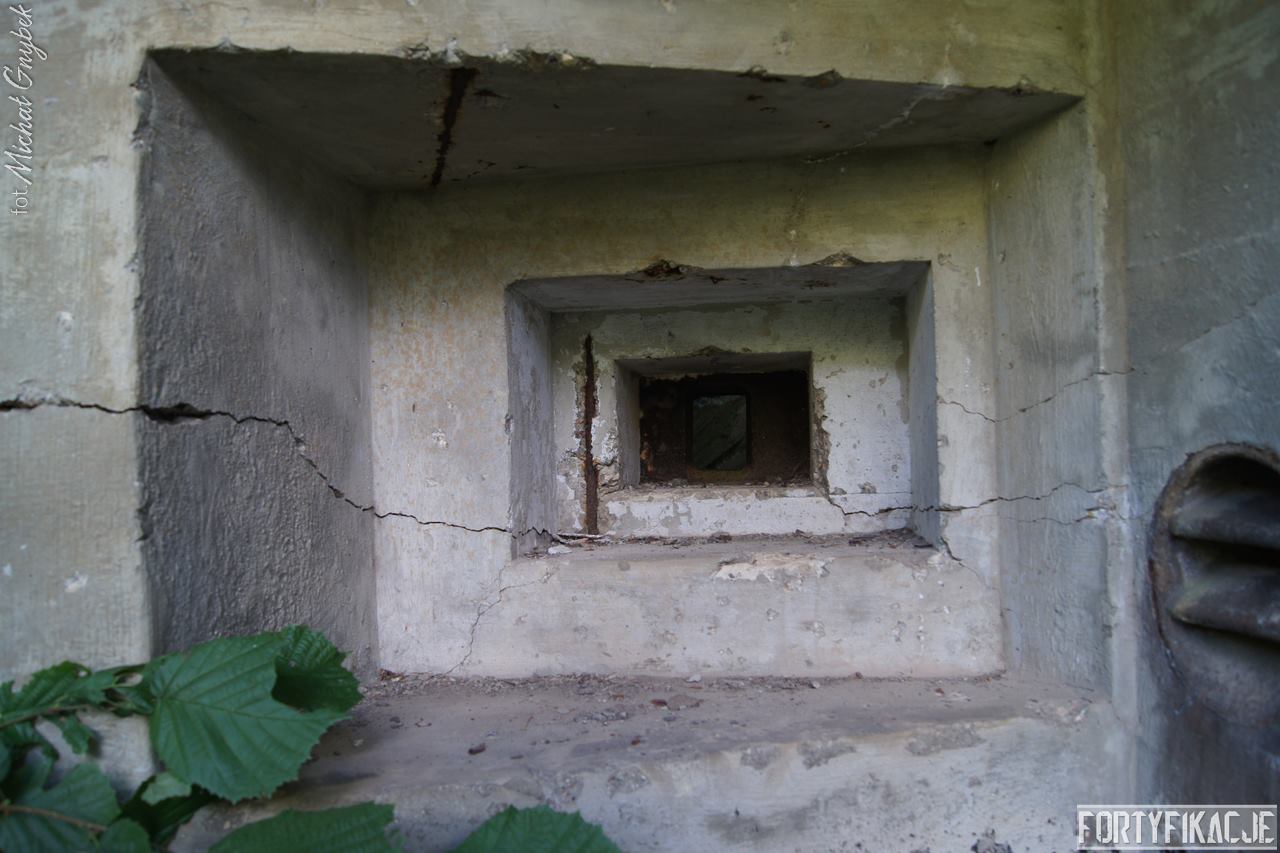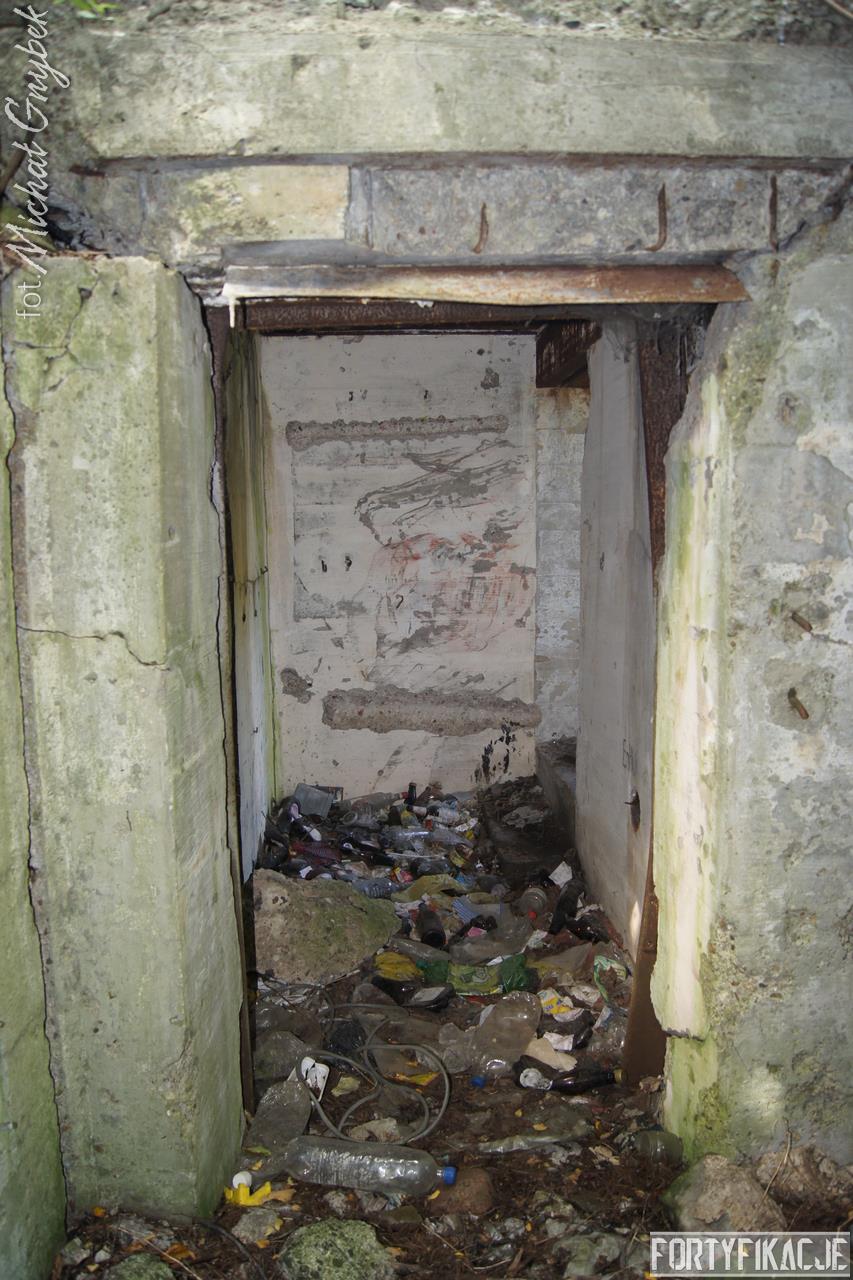 Wnętrze schronu niestety mocno ucierpiało, mimo to można tu odnaleźć kilka ciekawych detali. Na ścianach zachowały się ślady po napisach eksploatacyjnych, w tym mówiący o dacie jego wzniesienia. W tylnej ścianie izby bojowej zachowała się ponadto tarcza stalowa ze strzelnicą 48P8, która stanowiła ochronę dla strzelca broniącego wejścia. Niestety schron - jak widać na poniższych zdjęciach - jest obecnie dosyć mocno zaśmiecony... Być może prędzej lub później znajdą się dobre dusze, które go wysprzątają, bo z pewnością może być on traktowany jako intrygująca atrakcja turystyki historycznej/eksploracyjnej!
