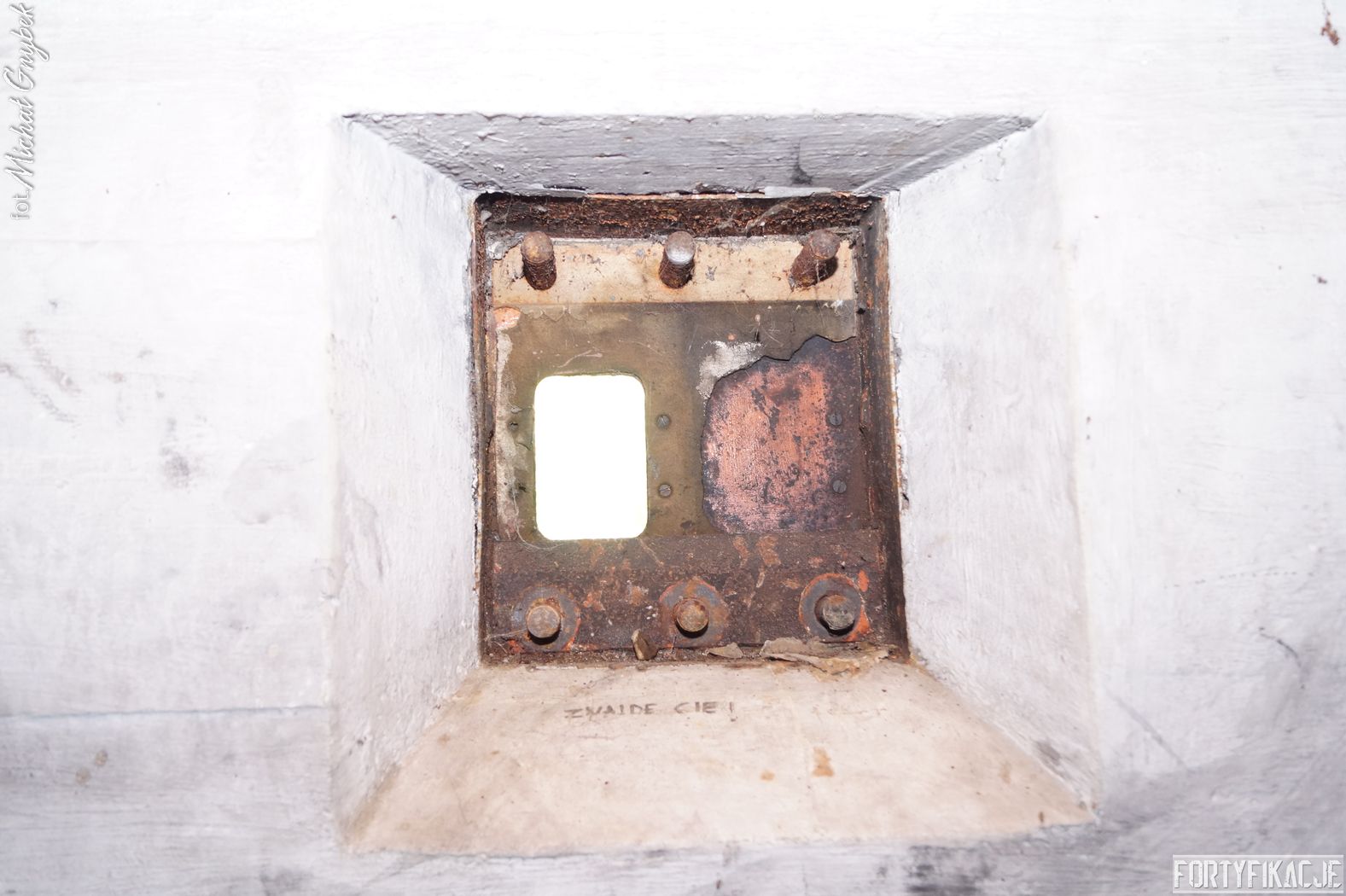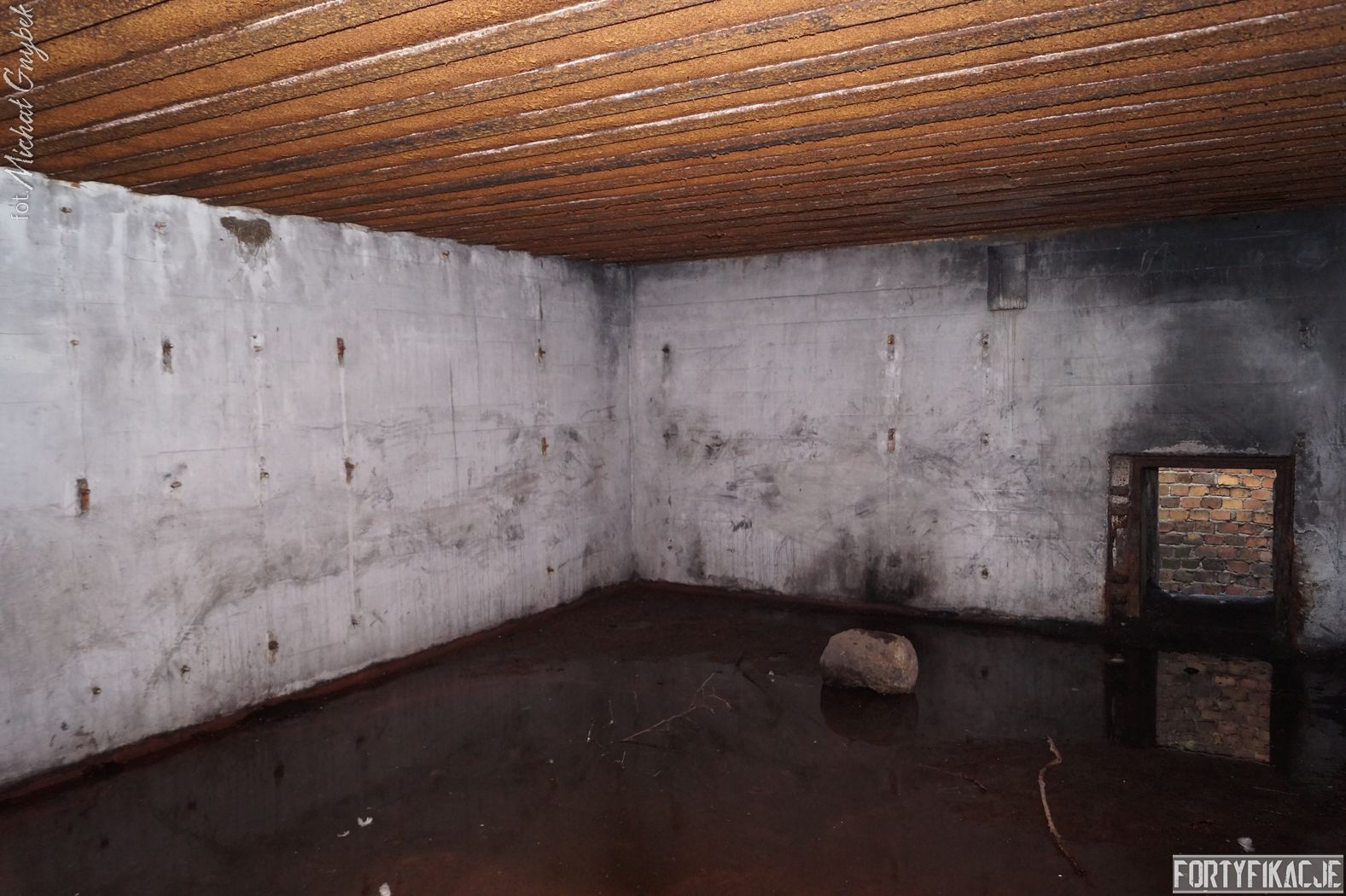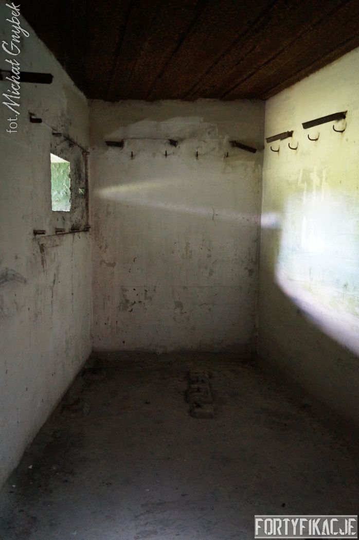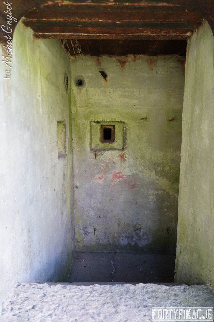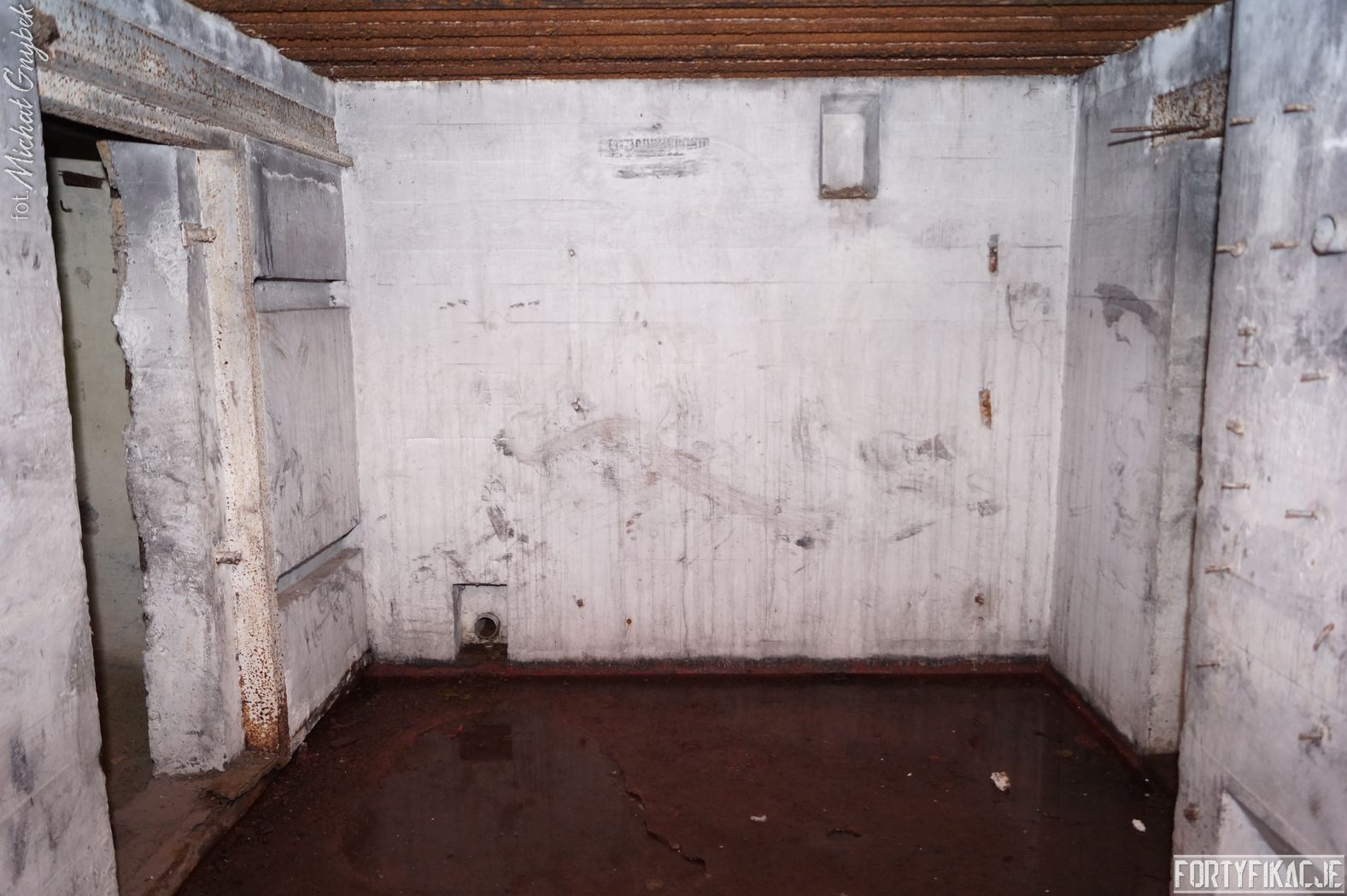 Zajrzyjmy do środka! Ersatz Kleinstwerk był konstrukcją, której bliżej było do definicji Stand'u niż do Werk'a. Z pewnością nie było to dzieło samowystarczalne, a zdolne do walki okrężnej jedynie teoretycznie. Cały schron ograniczał się do kilku pomieszczeń. Do obiektu można było dostać się przez dwa wejścia. Prowadziły one do bloku wejściowego, w którym nie uświadczymy dołów pułapek. Blok pełnił również rolę śluzy gazoszczelnej. Z bloku wejściowego mogliśmy dostać się do największej izby - była to dość przestronna izba załogi. W jej ścianach przetrwały dwie tarcze, tzw. "skrzynki", w tym jedna w całkiem dobrym stanie. Przestronność była jedynie pozorna: znajdowały się tu prycze dla załogi oraz drużyny wypadowej, łącznie 24 sztuki! Z bloku wejściowego natomiast możemy przejść do dwóch pomieszczeń: