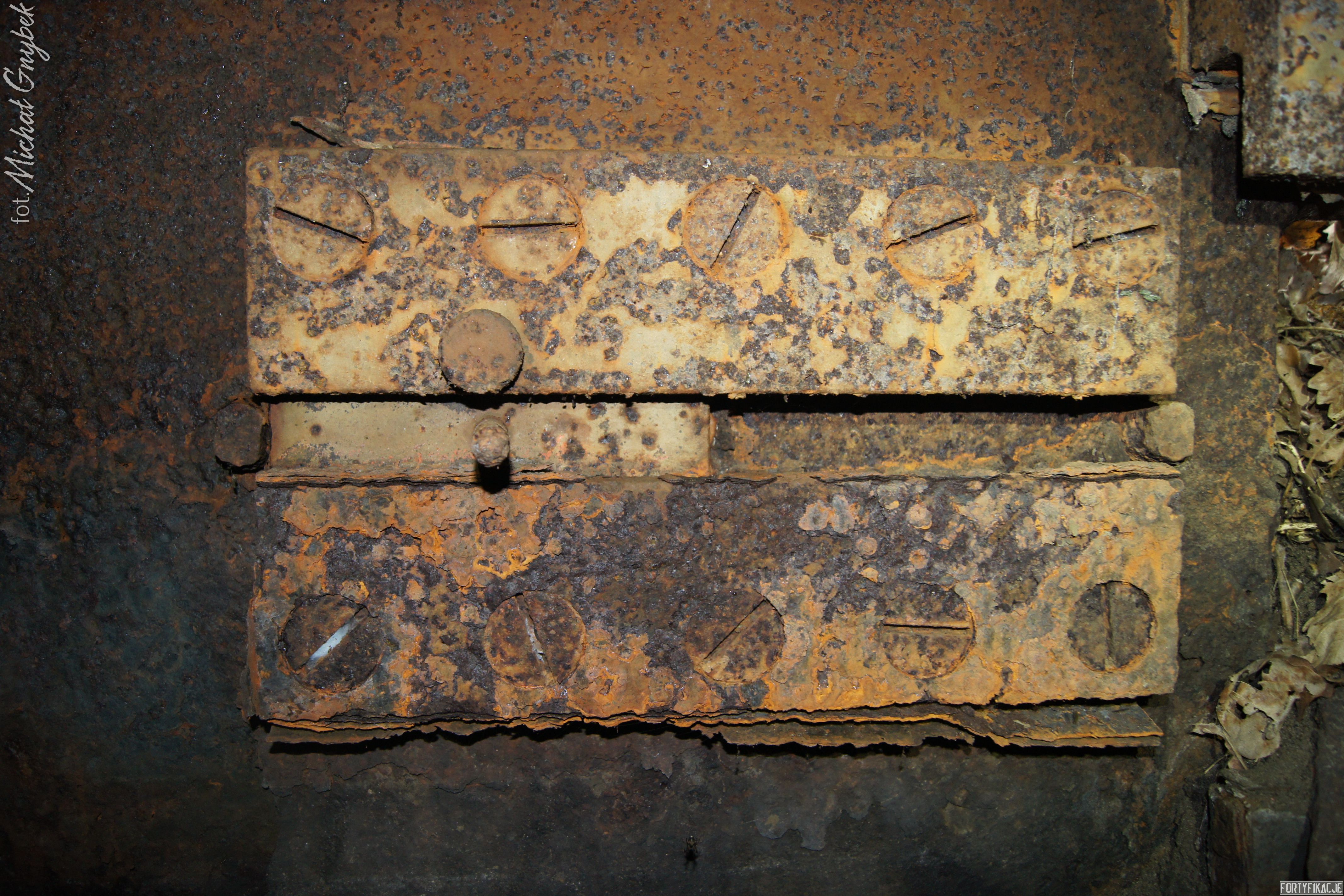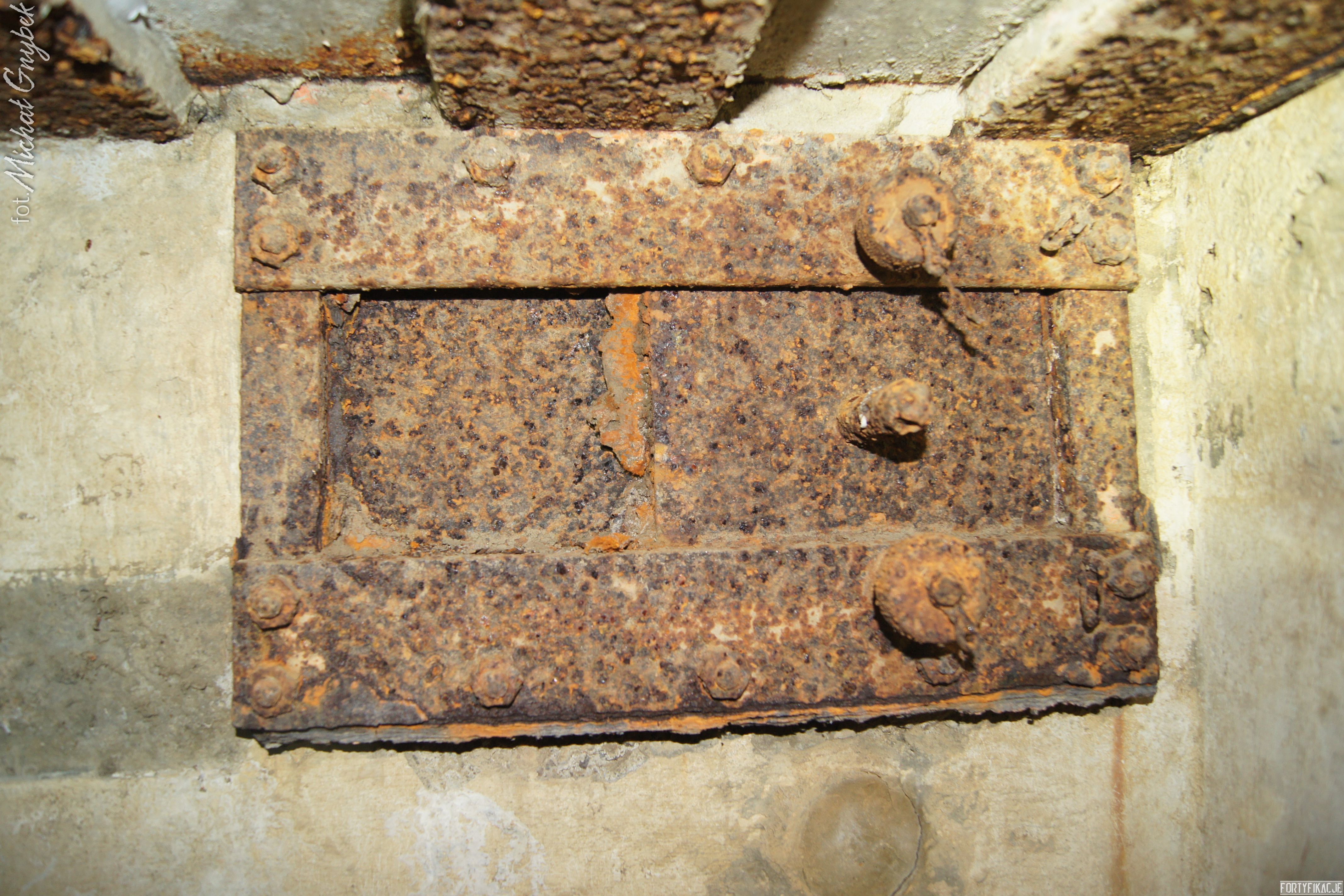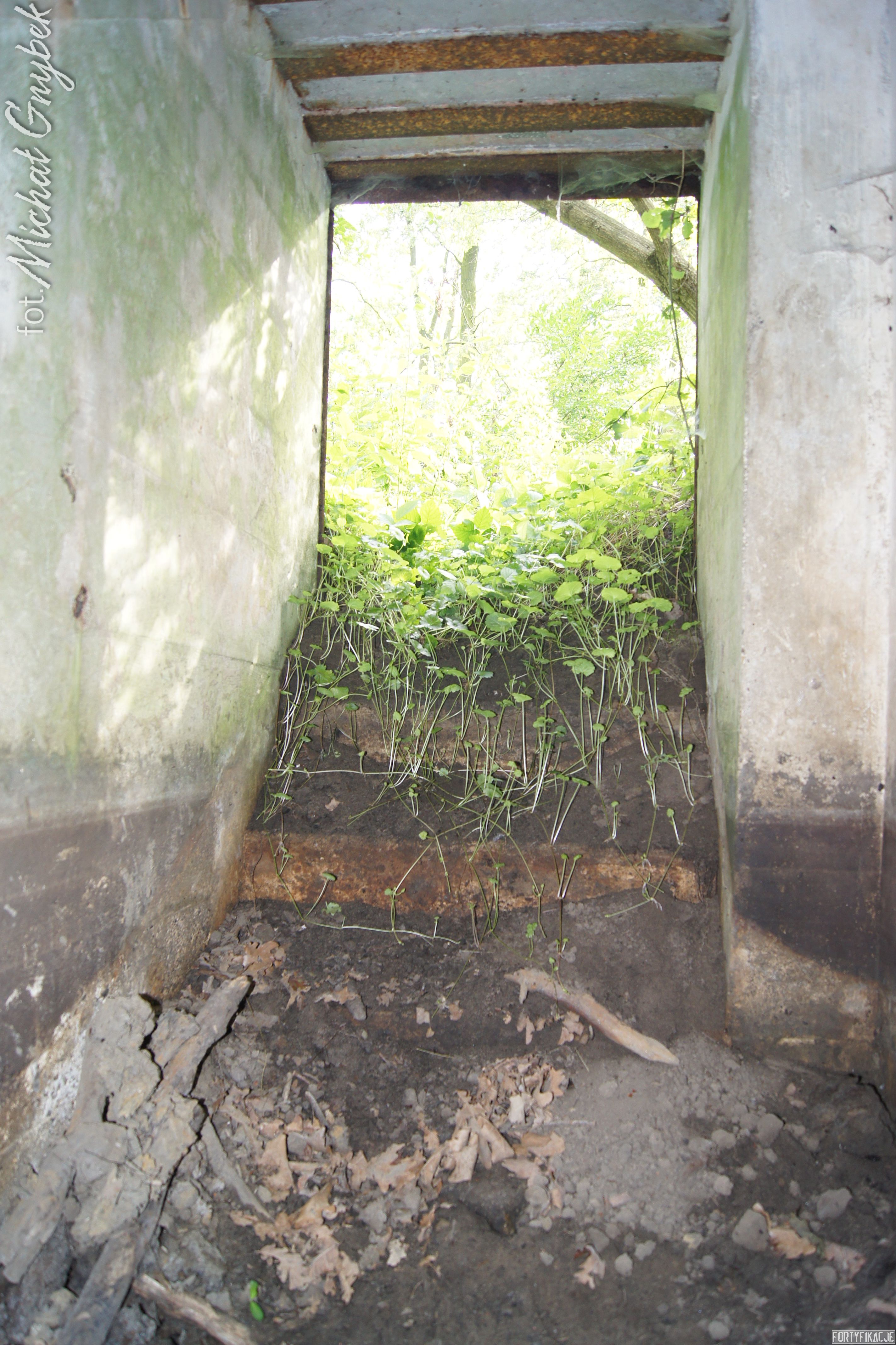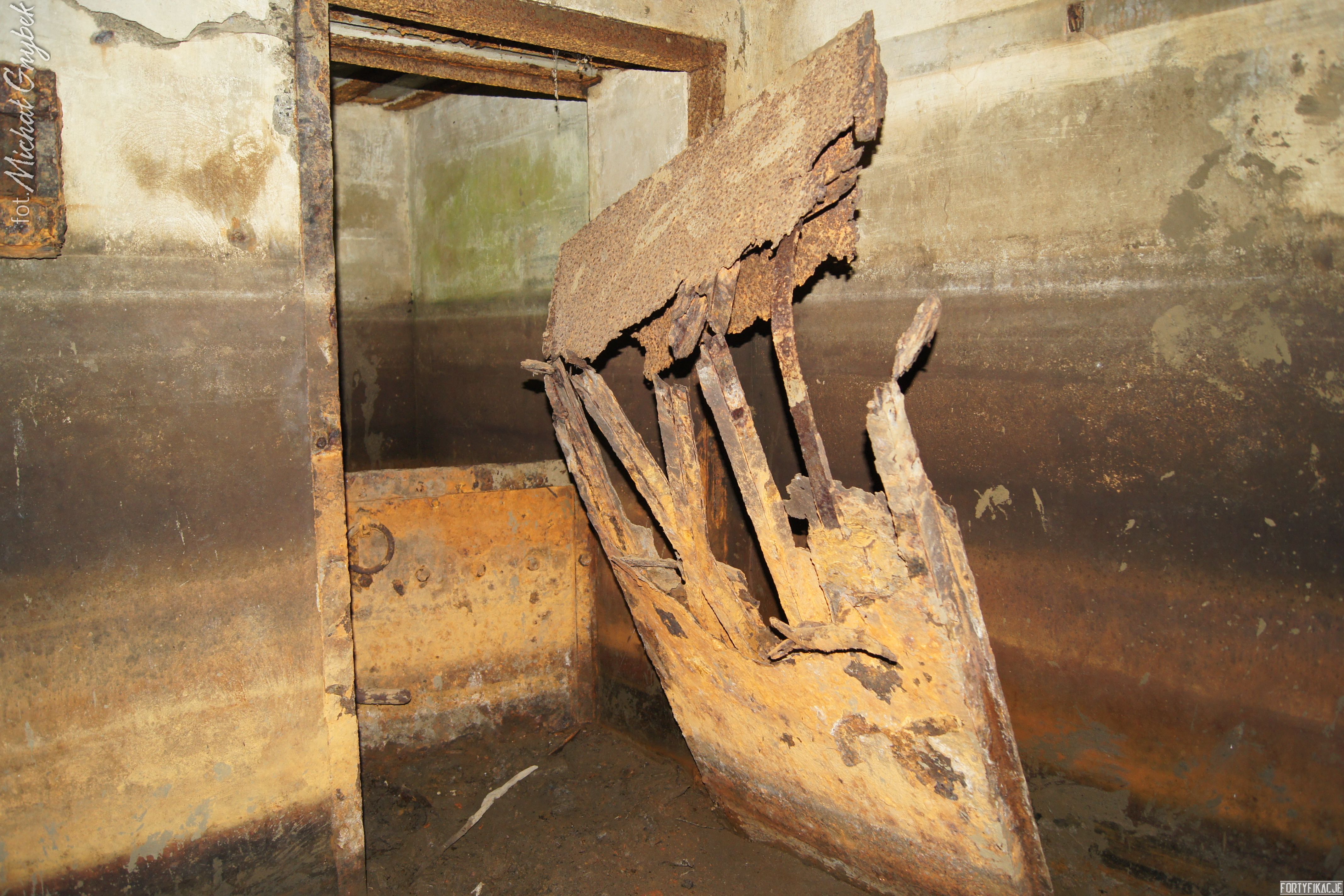 Schron - niestety - regularnie zalewany jest przez wody gruntowe. Z tego powodu jego uchowane wyposażenie niestety ulega coraz większej korozji. Skutki utleniania widać na powierzchni wszystkich stalowych elementów. Można powiedzieć, że i ten obiekt, przynajmniej pod względem elementów stalowych, umiera powolną śmiercią... Mam wrażenie, że jego bogate wnętrze zostało już zaopiekowane i żywię nadzieję, że jest to przynajmniej opieka pasjonatów, a nie złomiarzy... A skarbów tu jest kilka: zachowana płyta stalowa, pozostałości po stoliku pod prowadnicę i lawetę karabinową i wreszcie częściowo zachowane obie pary drzwi wewnętrznych!