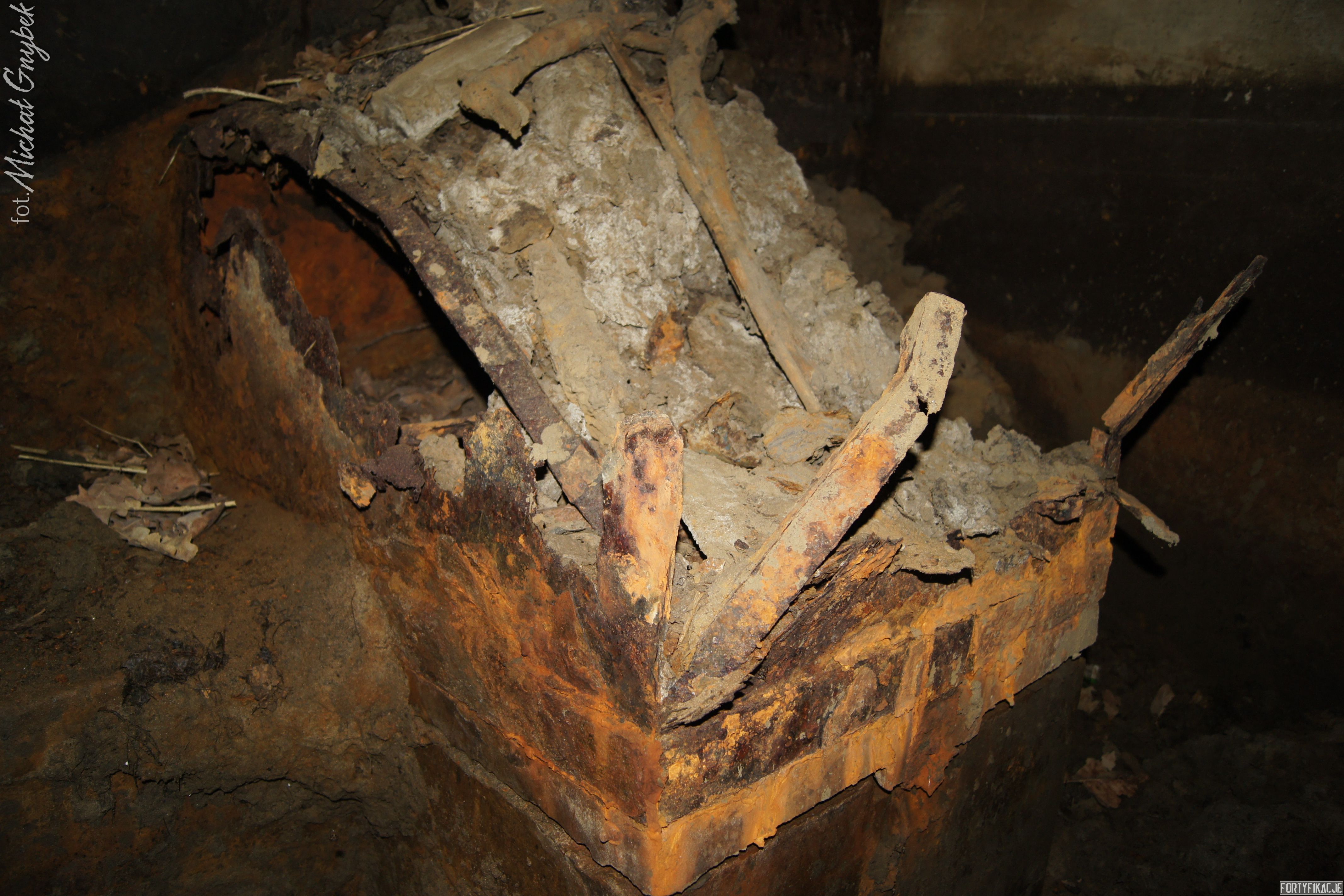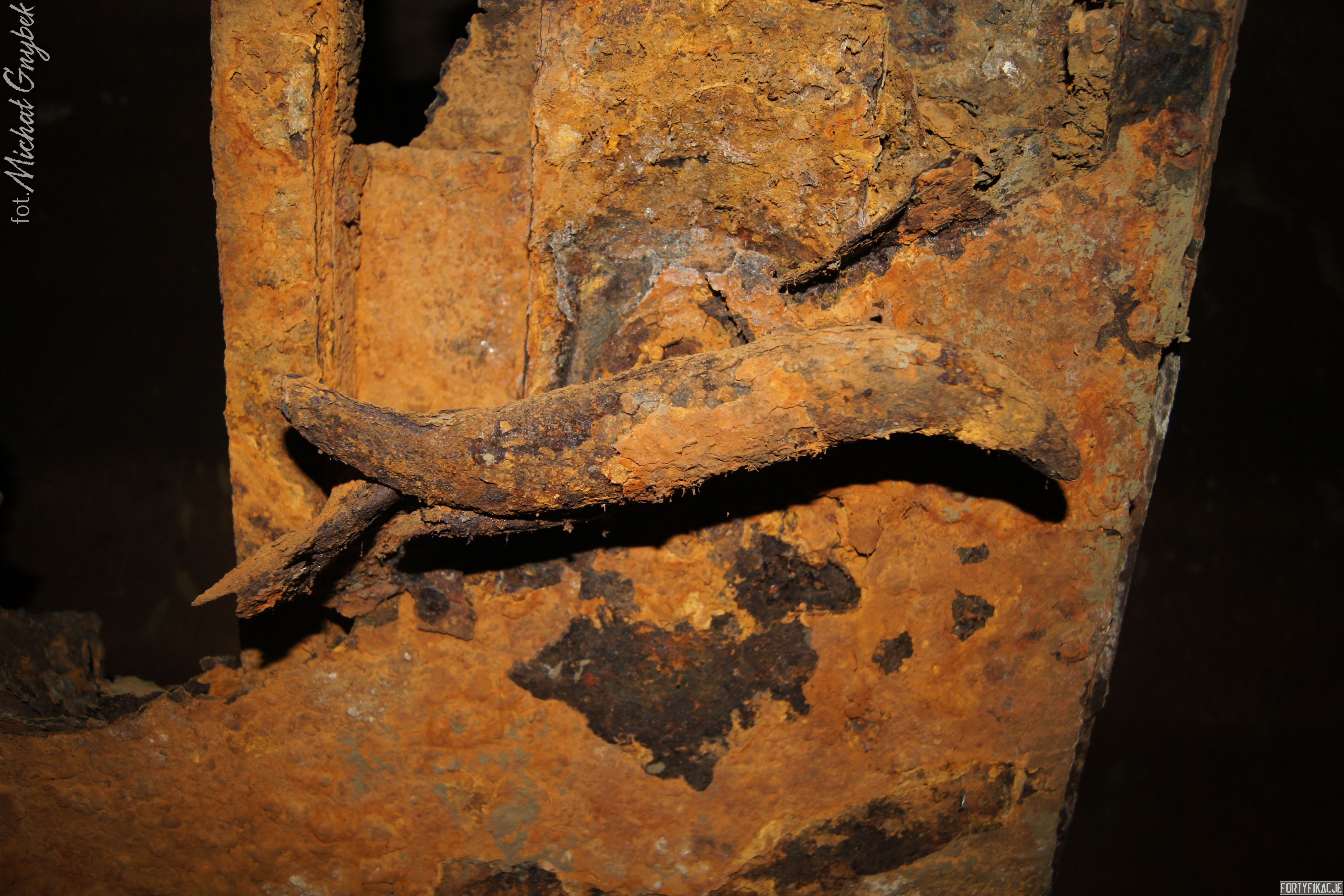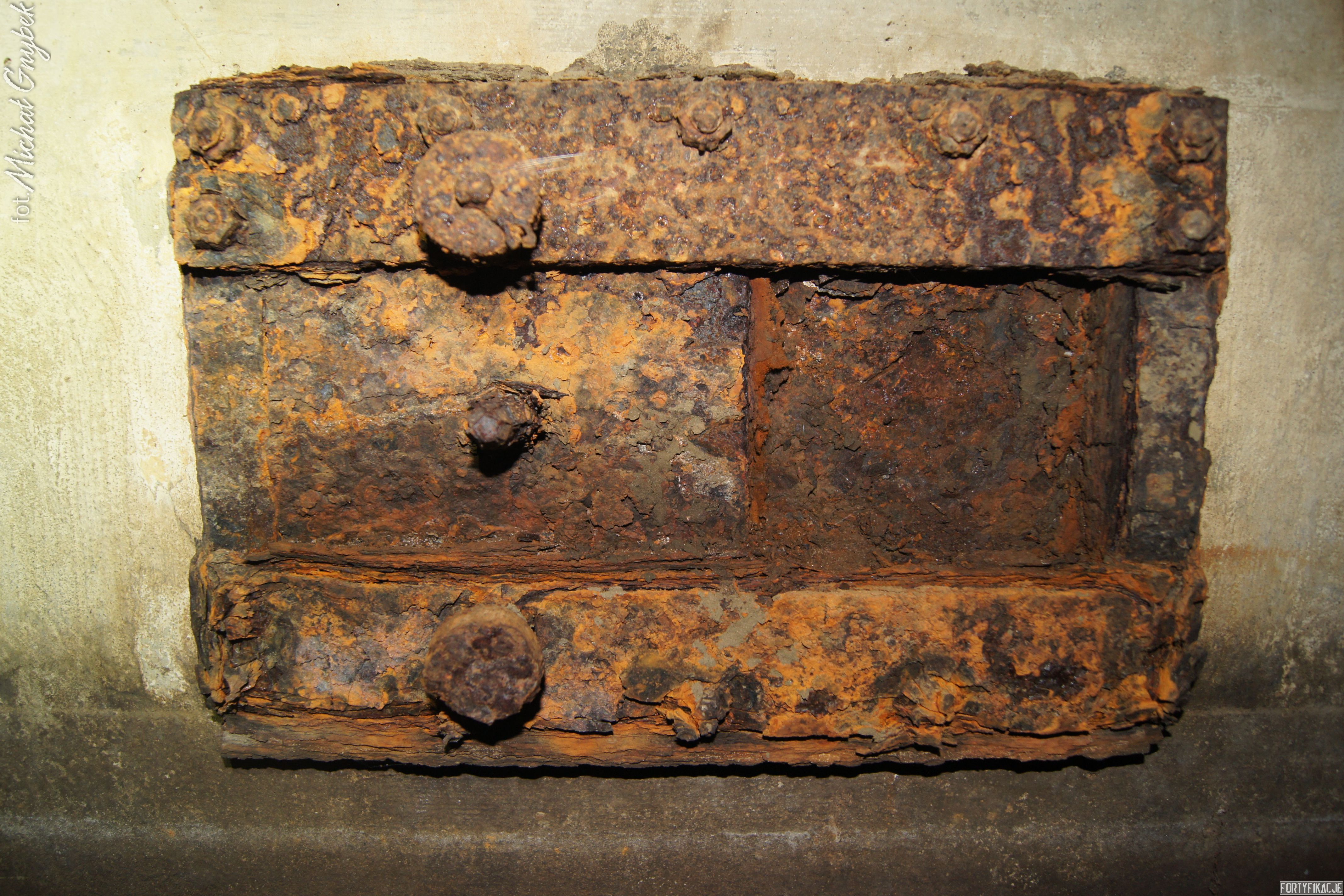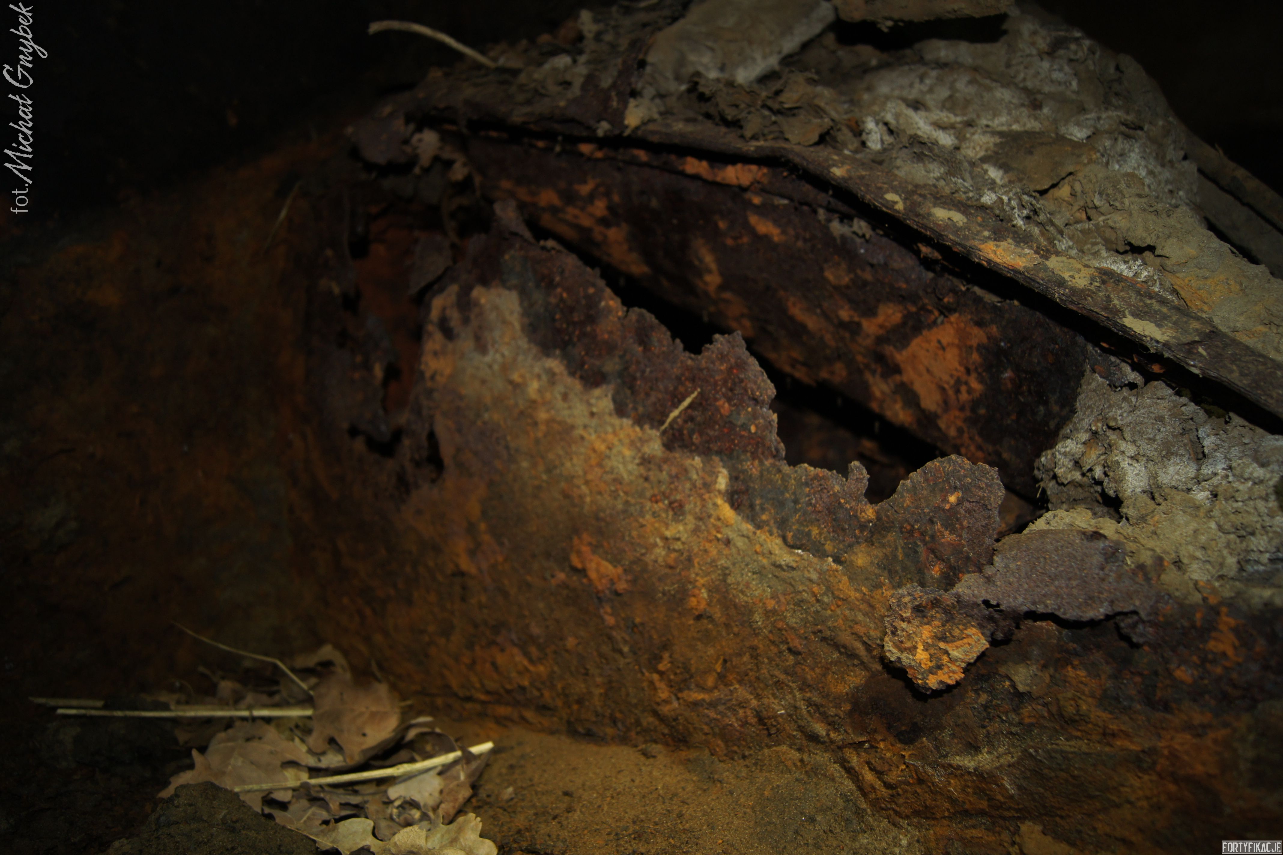 Schron - niestety - regularnie zalewany jest przez wody gruntowe. Z tego powodu jego uchowane wyposażenie niestety ulega coraz większej korozji. Skutki utleniania widać na powierzchni wszystkich stalowych elementów. Można powiedzieć, że i ten obiekt, przynajmniej pod względem elementów stalowych, umiera powolną śmiercią... Mam wrażenie, że jego bogate wnętrze zostało już zaopiekowane i żywię nadzieję, że jest to przynajmniej opieka pasjonatów, a nie złomiarzy... A skarbów tu jest kilka: zachowana płyta stalowa, pozostałości po stoliku pod prowadnicę i lawetę karabinową i wreszcie częściowo zachowane obie pary drzwi wewnętrznych!
