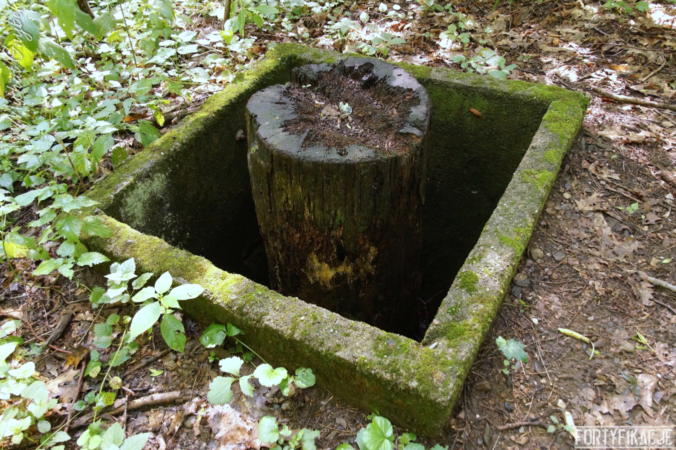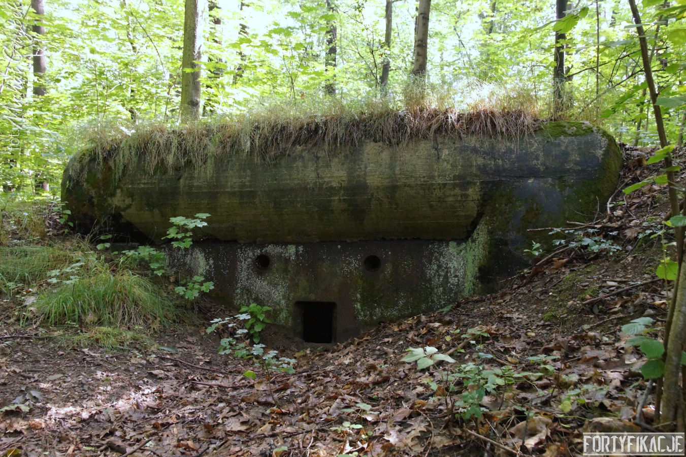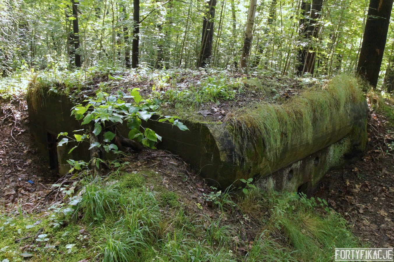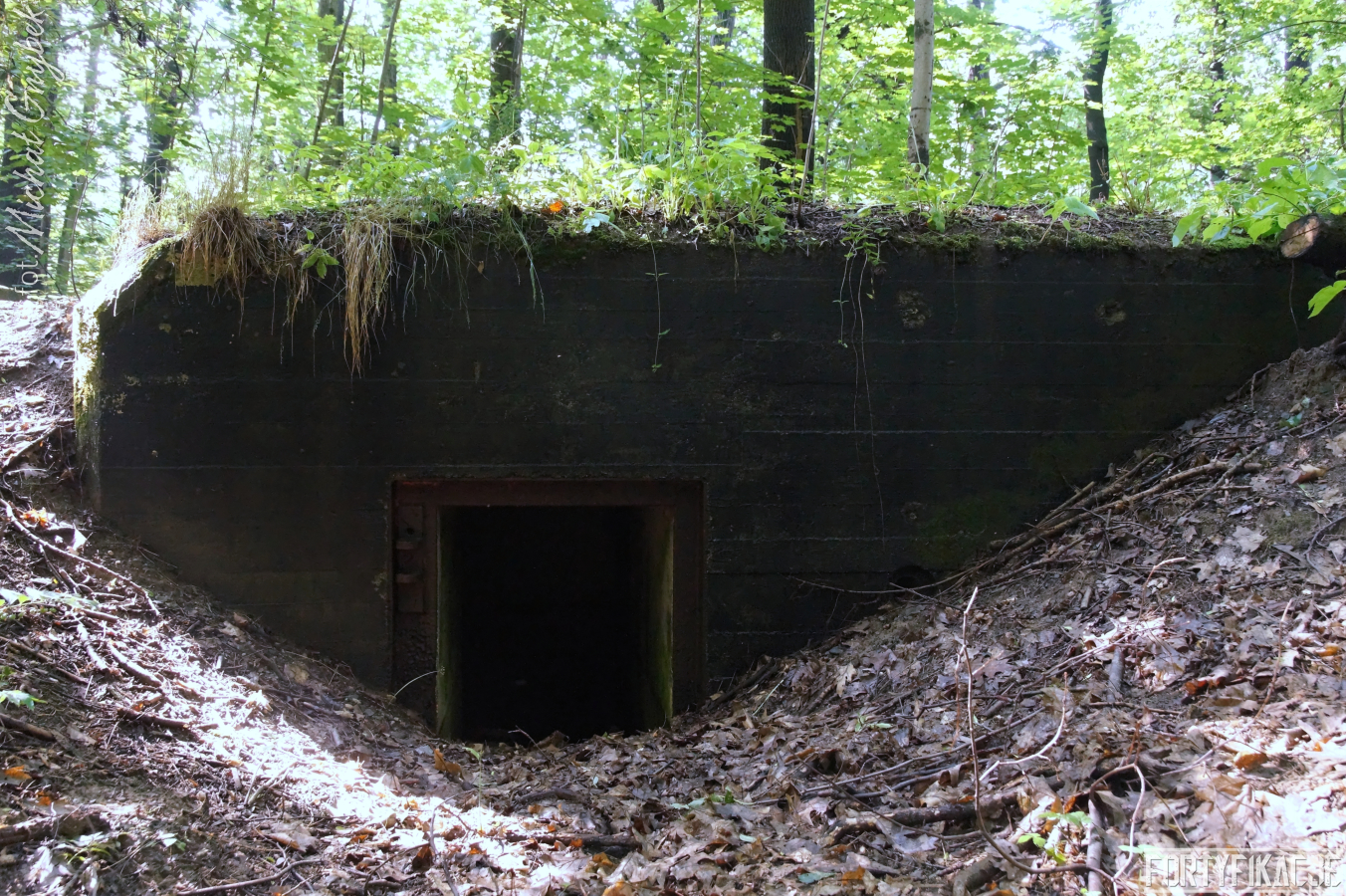 Ukazywany przeze mnie jednosektorowy schron ognia bocznego został prawdopodobnie wzniesiony w roku 1933. Już zewnętrzne oględziny ujawniły pewne podobieństwo do obiektów realizowanych w ramach instrukcji "Stellungsbau" z sierpnia 1930 roku. Poniższe zdjęcia uwidaczniają też niewielkie rozmiary stanowiska oraz nietypowy kształt elewacji bojowej. Płyta stalowa zatopiona została w żelbecie, który otacza ją i tworzy charakterystyczną ramę. Betonowy okap o obłym kształcie przypomina fragment zwalonego drzewa. Cała konstrukcja przysypana została solidnie ziemią, spod której - oprócz elewacji bojowej - wyeksponowana była od strony zapola jedynie ściana boczna, w której umieszczono wejście. Zamykane ono było stalowymi drzwiami z wyłazem lub bez. W pobliżu (Unter)standu jeszcze dziś odnaleźć można kilka betonowych osłonek dla posadzonych tu przez Niemców dla kamuflażu drzew.