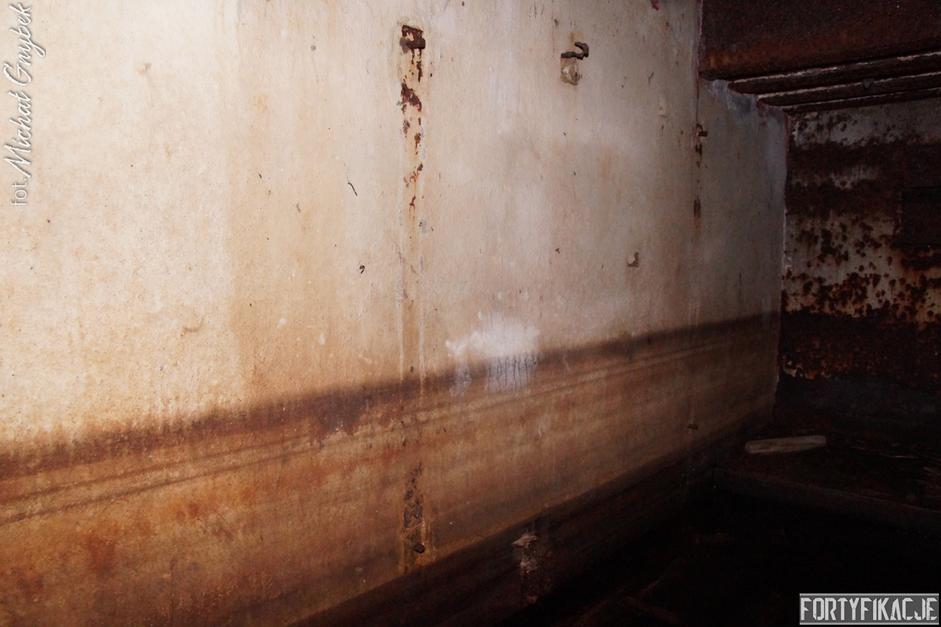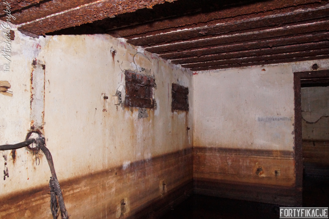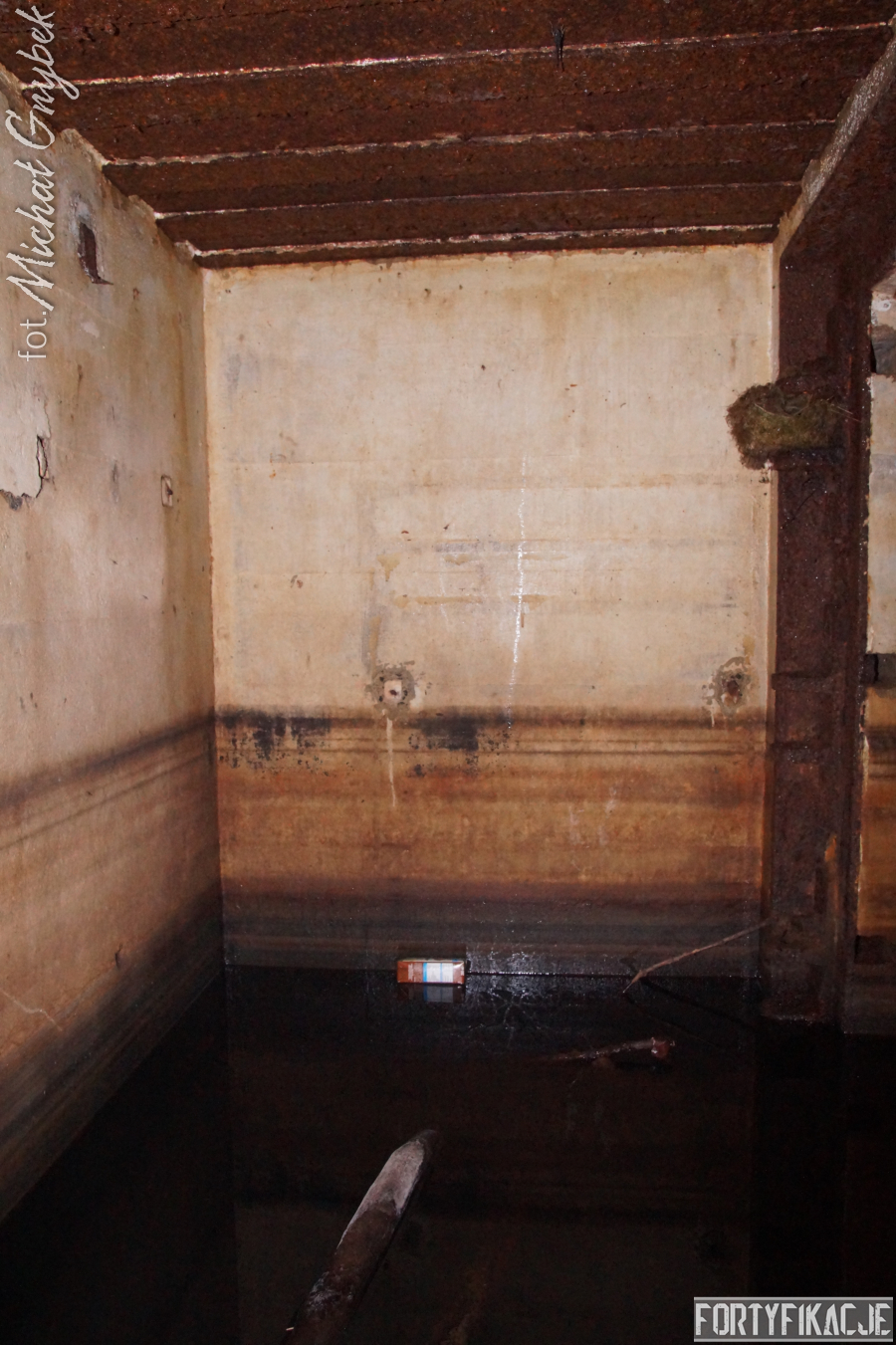 Wejście do środka schronu jest obecnie bardzo utrudnione: wnętrze zalane jest sporą ilością wody i błota. Udało mi się jedynie dotrzeć na próg izby bojowej. Także układ dwóch pomieszczeń, z których składał się obiekt, odpowiada instrukcji "Stellungsbau" z 1930 roku. Otwór wejściowy prowadził do niewielkiego przedsionka spełniającego również rolę śluzy gazoszczelnej. Z niego załoga mogła przedostać się, pokonując najpierw drzwi dwudzielne, a następnie gazoszczelne, do pomieszczenia bojowego. Izba ta wydaje się standardową o rozmiarach ok. 250x200x190 [dł. x szer. x wys. cm]. Pełniła ona rolę bojową oraz - w bardzo ograniczonym stopniu - socjalną. Główne uzbrojenie - MG 08 - umieszczony był na stoliku, ten zaś na żelbetowej ławie w kształcie litery "T". Płyta stalowa stanowiła praktycznie całą ścianę czołową. W rzeczonym schronie przytwierdzona była do charakterystycznego obniżenia w stropie. Taki zabieg wymuszały wymiary płyty. Oprócz uzbrojenia załoga miała tu do dyspozycji telefon - na zdjęciach widoczne są kotwy, na których był on zawieszony oraz kreślenia ołówkiem, które miały pomóc w jego montażu. Obieg powietrza zapewniały przewody napowietrzające i odprowadzające powietrze. Na ścianach schronu dostrzec można napisy eksploatacyjne, niestety ząb czasu odcisnął na nich swój ślad...