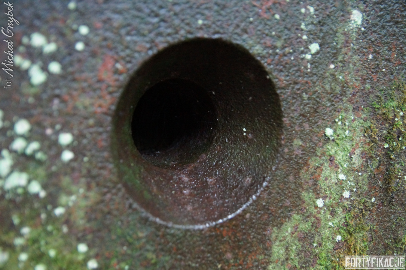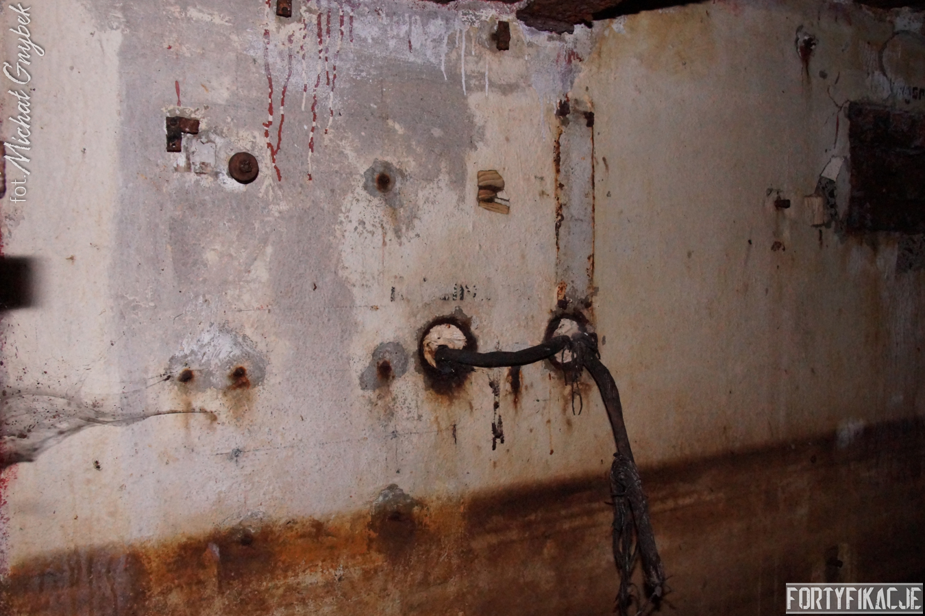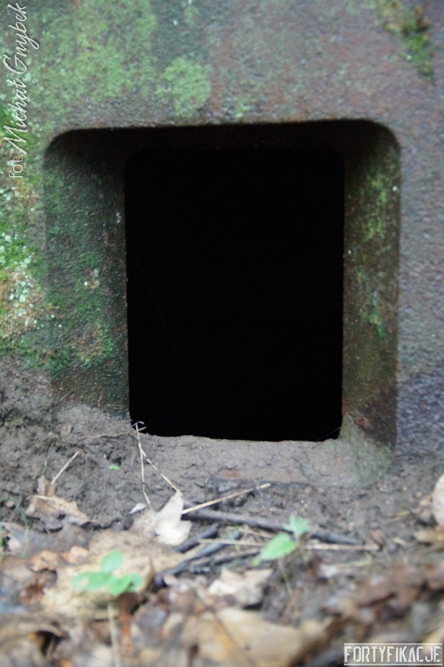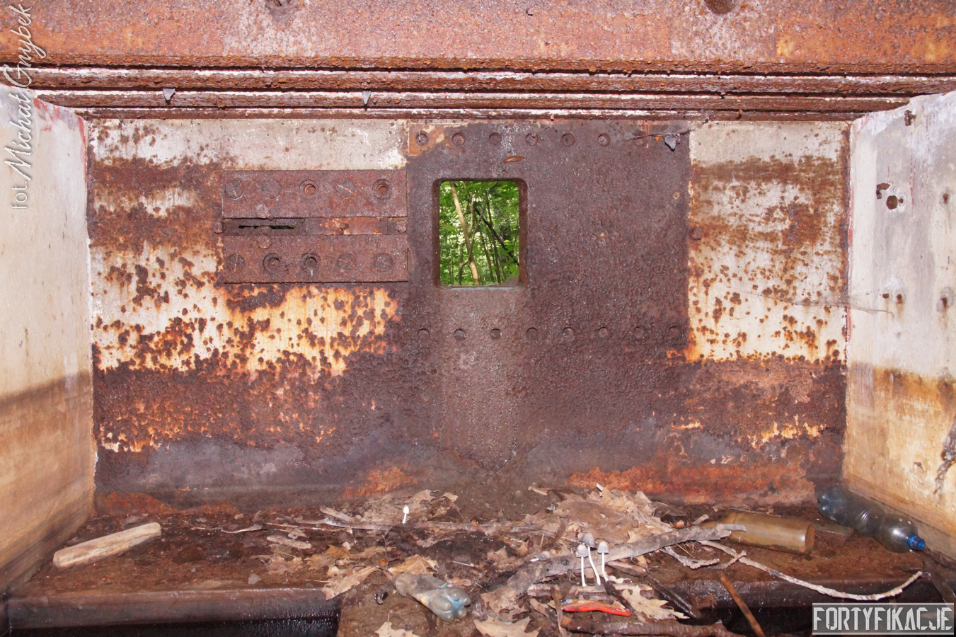 Wejście do środka schronu jest obecnie bardzo utrudnione: wnętrze zalane jest sporą ilością wody i błota. Udało mi się jedynie dotrzeć na próg izby bojowej. Także układ dwóch pomieszczeń, z których składał się obiekt, odpowiada instrukcji "Stellungsbau" z 1930 roku. Otwór wejściowy prowadził do niewielkiego przedsionka spełniającego również rolę śluzy gazoszczelnej. Z niego załoga mogła przedostać się, pokonując najpierw drzwi dwudzielne, a następnie gazoszczelne, do pomieszczenia bojowego. Izba ta wydaje się standardową o rozmiarach ok. 250x200x190 [dł. x szer. x wys. cm]. Pełniła ona rolę bojową oraz - w bardzo ograniczonym stopniu - socjalną. Główne uzbrojenie - MG 08 - umieszczony był na stoliku, ten zaś na żelbetowej ławie w kształcie litery "T". Płyta stalowa stanowiła praktycznie całą ścianę czołową. W rzeczonym schronie przytwierdzona była do charakterystycznego obniżenia w stropie. Taki zabieg wymuszały wymiary płyty. Oprócz uzbrojenia załoga miała tu do dyspozycji telefon - na zdjęciach widoczne są kotwy, na których był on zawieszony oraz kreślenia ołówkiem, które miały pomóc w jego montażu. Obieg powietrza zapewniały przewody napowietrzające i odprowadzające powietrze. Na ścianach schronu dostrzec można napisy eksploatacyjne, niestety ząb czasu odcisnął na nich swój ślad...