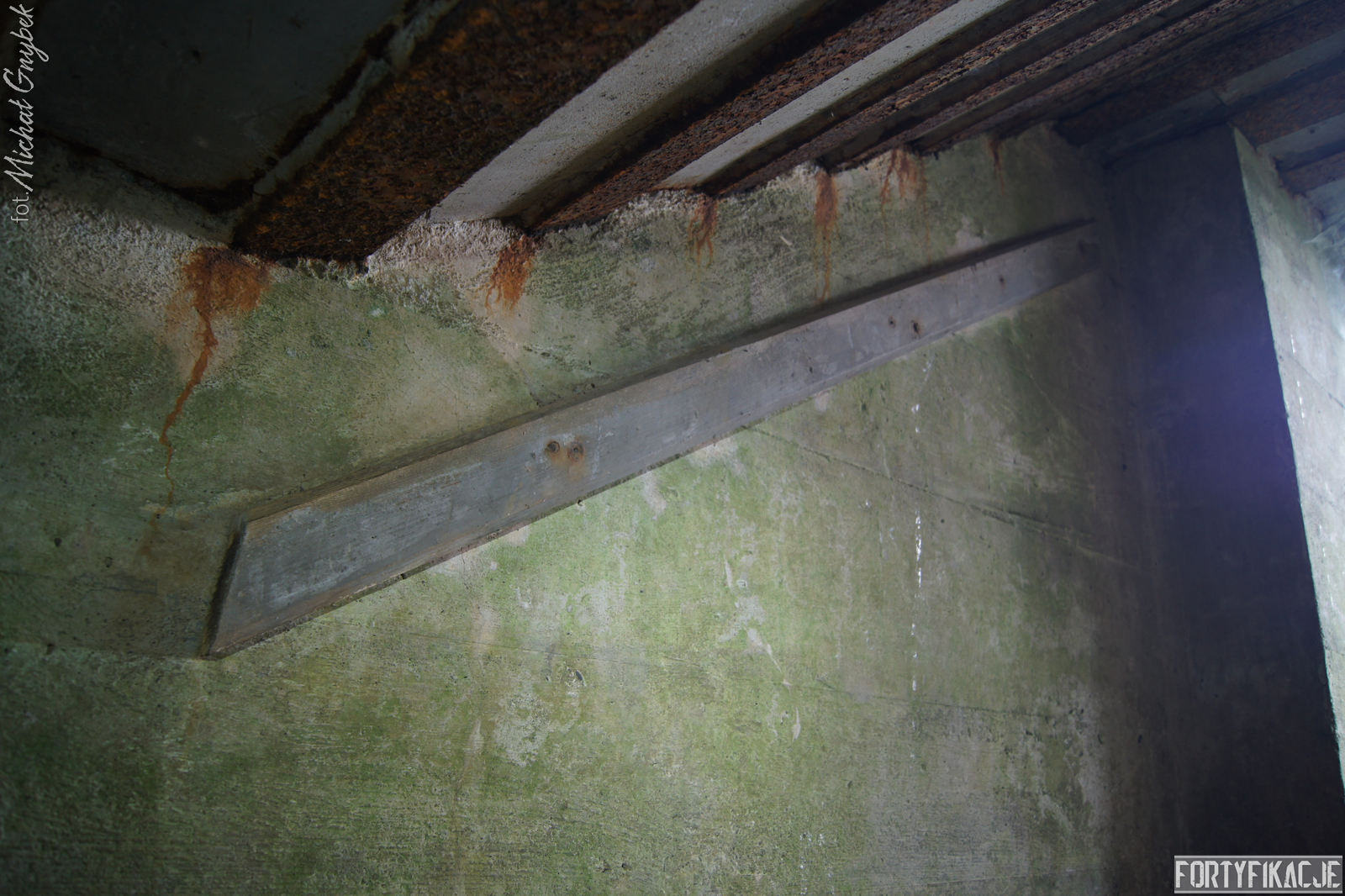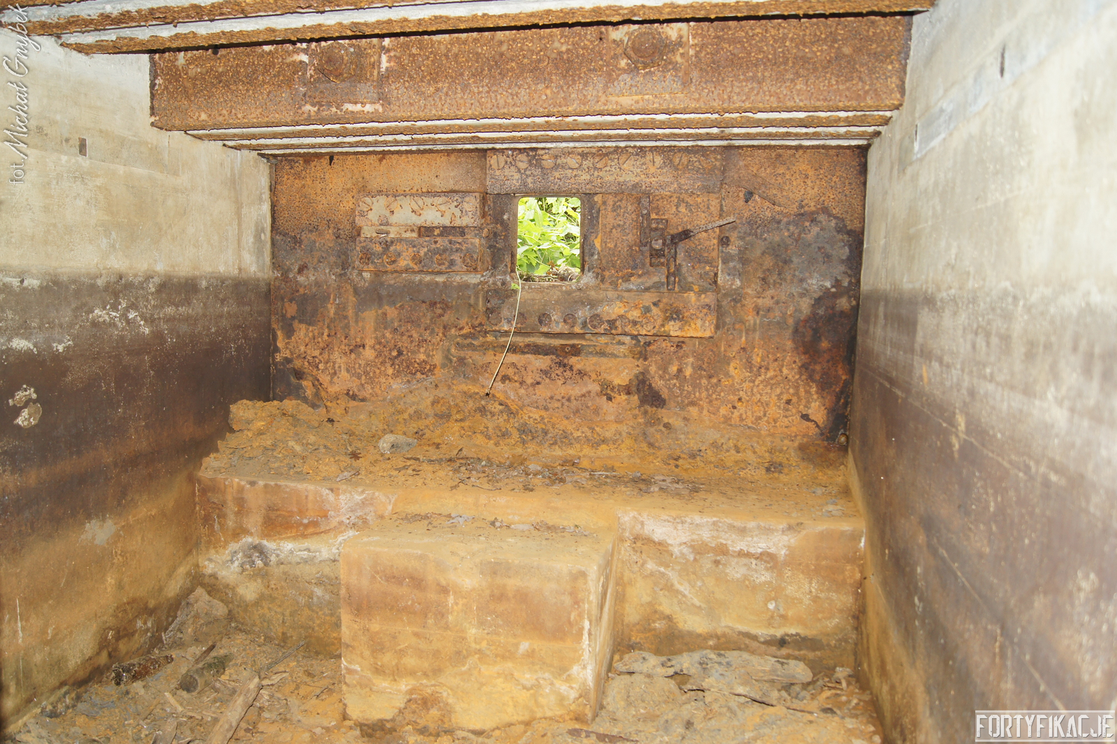 Schron - na swoje szczęście (!) - regularnie jest zalewany. Z tego powodu jego częściowo uchowane wyposażenie niestety ulega coraz większej korozji. Skutki utleniania widać na powierzchni wszystkich stalowych elementów. Z drugiej strony stojąca woda zdaje się być swoistym strażnikiem zachowanego pancerza utrudniając jego ewentualną grabież... Wnętrze obiektu kryło dwa pomieszczenia. Pierwsze z nich to przedsionek/śluza gazoszczelna. Drugie to niewielka izba bojowa o ograniczonych do absolutnego minimum funkcjach socjalnych. Załoga miała tu do dyspozycji pomieszczenie o mikrych wymiarach 200x252cm! W rzeczonym schronie na uwagę zasługuje kompletna płyta stalowa 8cm: zachowały się tu prowadnice, zasuwy oraz dźwignia ryglująca. Niestety schron jest obecnie pozostawiony sam sobie. Może lokalne władze/LP powinny rozważyć jego zamknięcie?