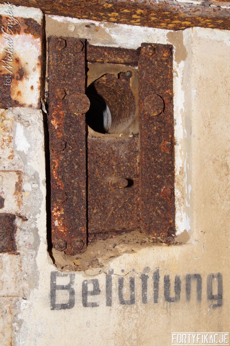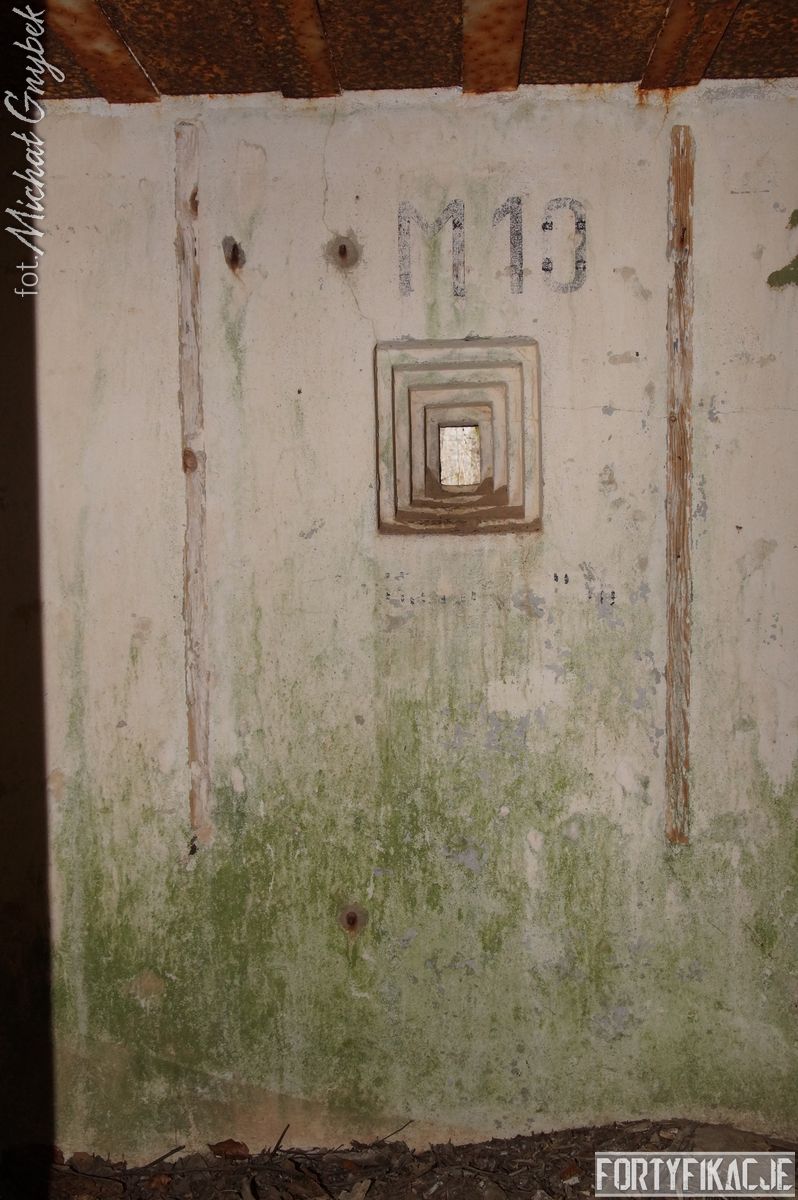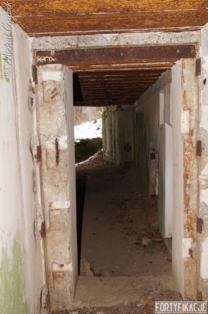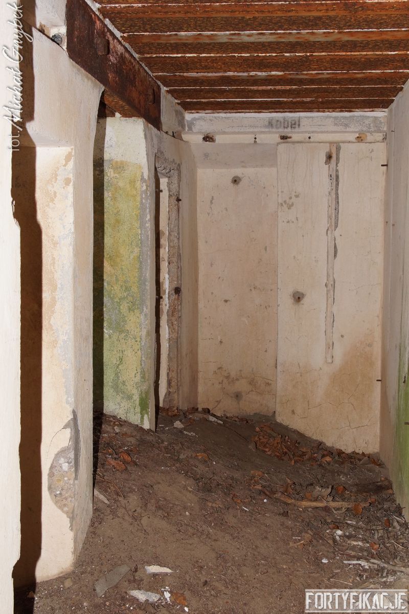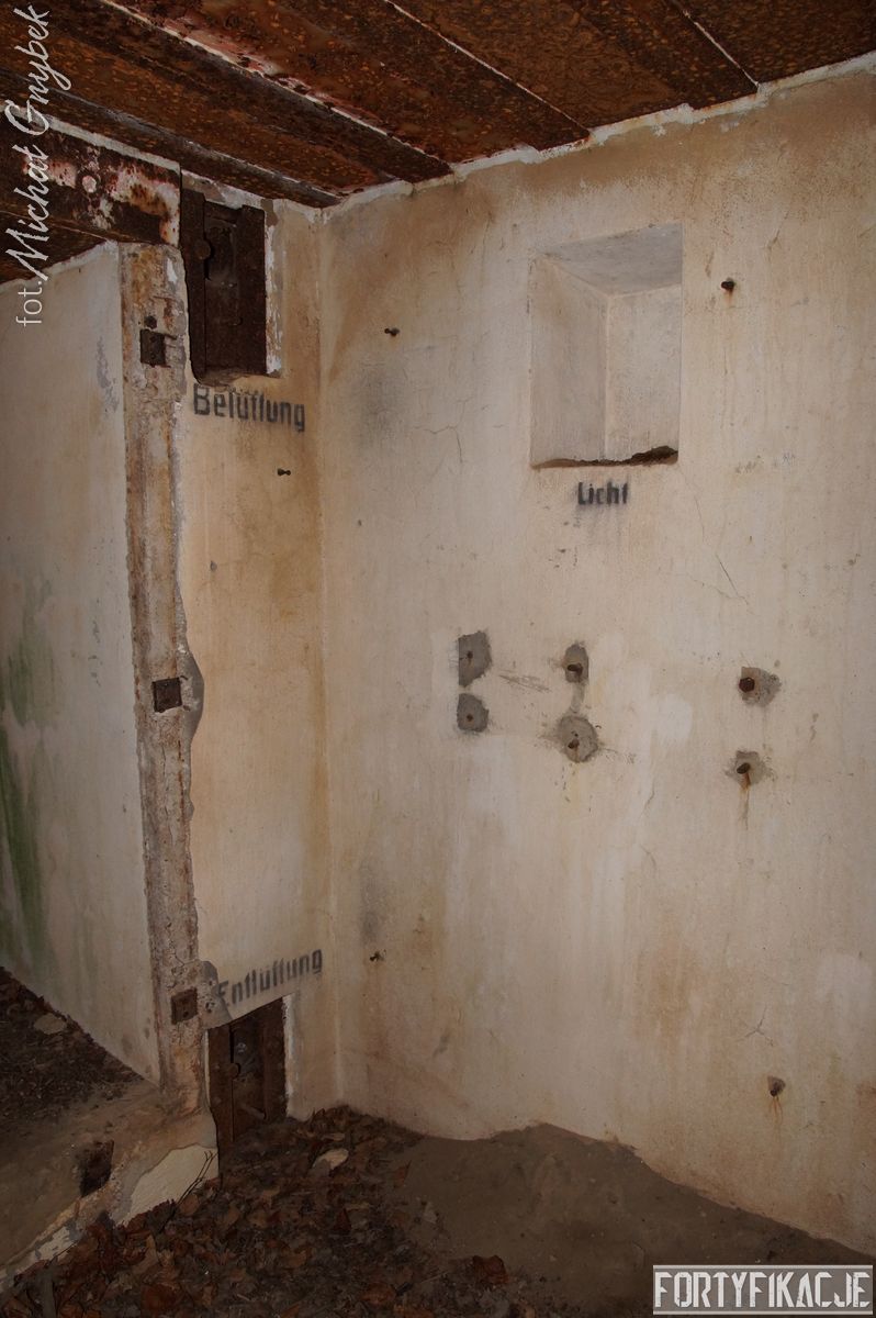 Zajrzyjmy do środka! Mimo, że Stand pokrywał ogniem dwa sektory, to jego wnętrze kryje jedynie trzy pomieszczenia! Blok wejściowy/śluza gazoszczelna był niewielkich rozmiarów. Stąd załoga mogła dostać się do jednego pomieszczenia: Izby bojowej skierowanej na wschód. Było to zdecydowanie największe pomieszczenie schronu. Jego kubatura wskazuje, że mogła być to też izba dla drużyny wypadowej (?). Stąd natomiast załoga mogła się udać do izby bojowej skierowanej ku północnemu-wschodowi, pełniącej również rolę wartowni, znajdziemy tu zachowaną lekką tarczę stalową ze strzelnicą broni ręcznej.